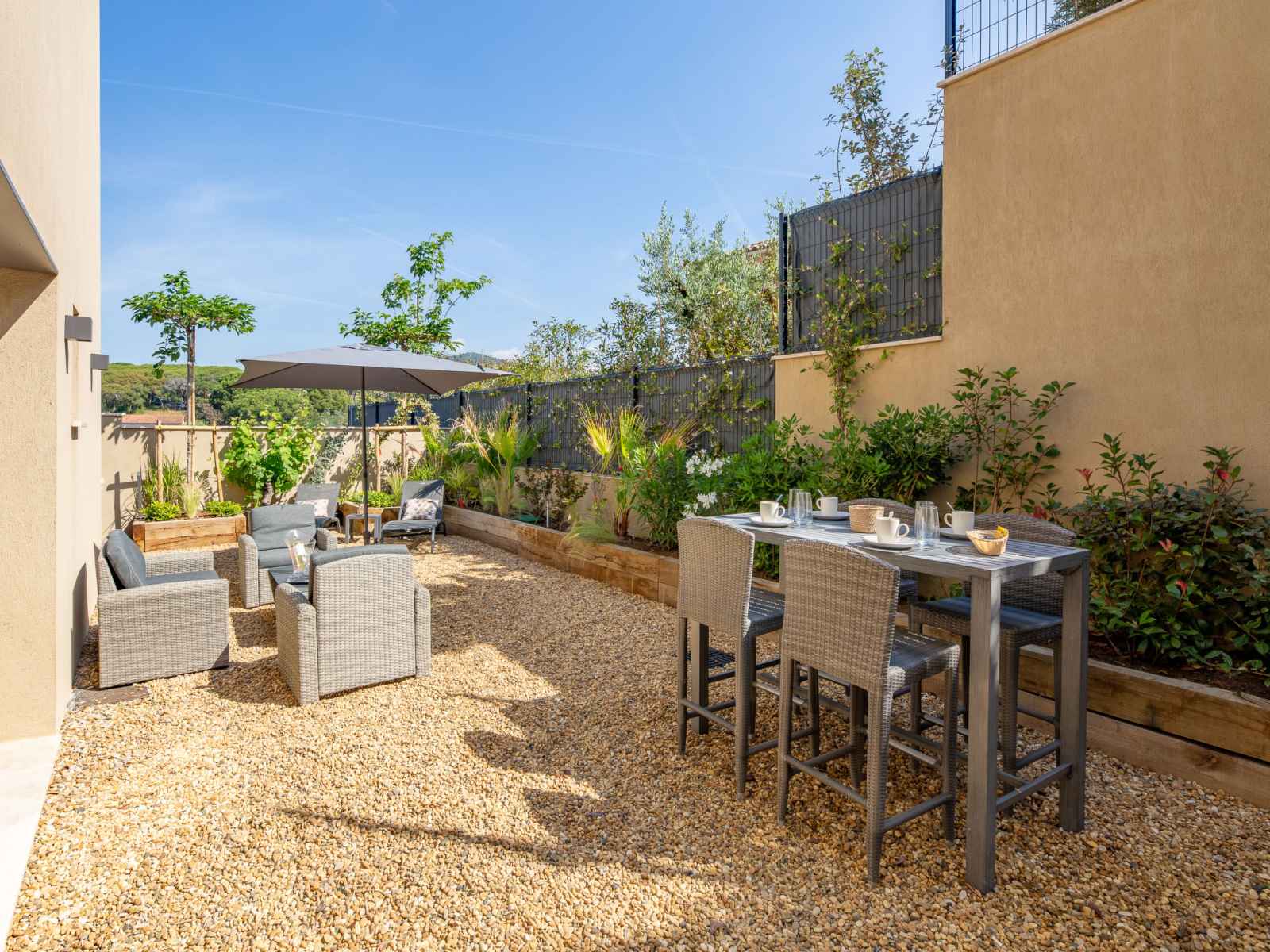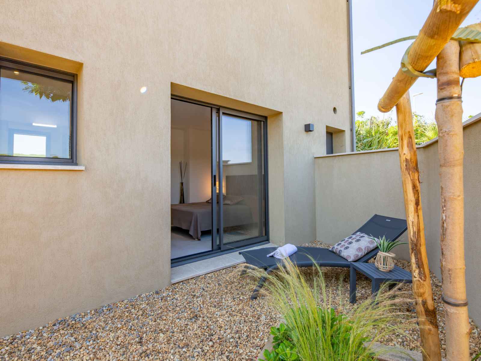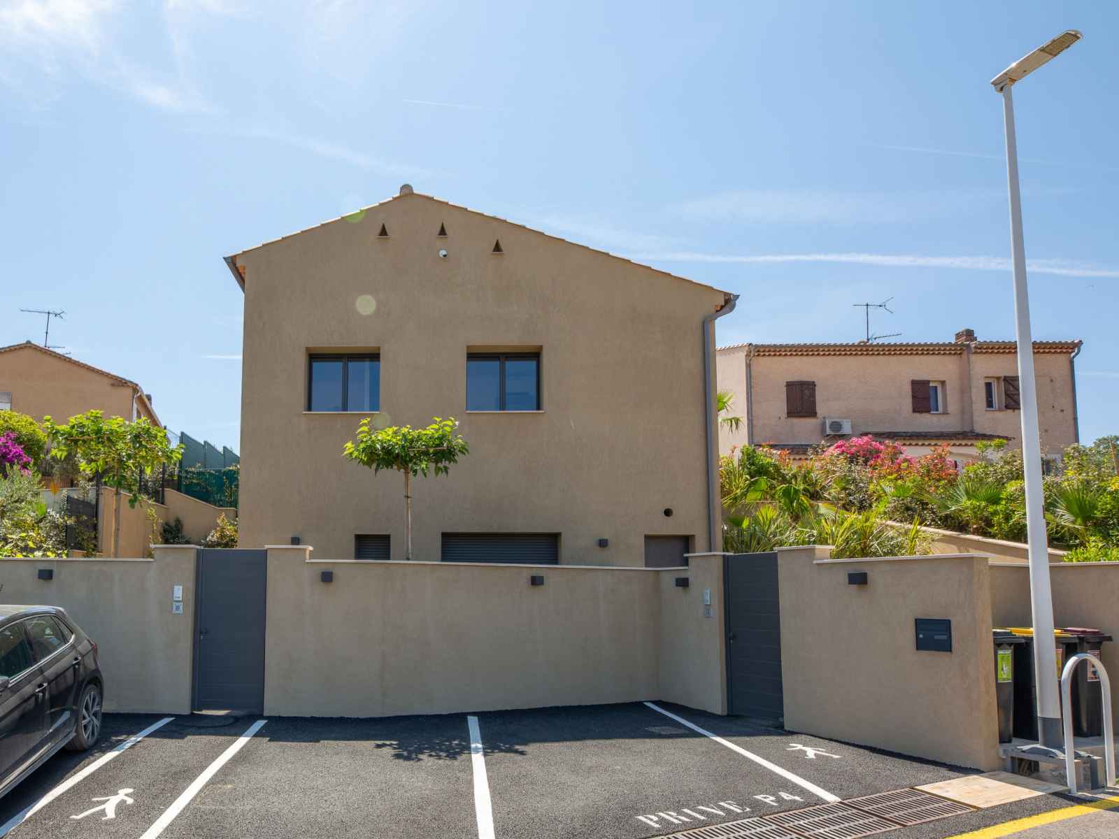 Maison jumelée moderne "akemi", rénovée en 2024. dans le quartier de bouillonnet, en bordure de la localité, à 800 m du centre de sainte-maxime, situation tranquille dans un quartier résidentiel, à 1.3 km de la mer, à 1.3 km de la plage, dans une impasse. a usage privé: jardin entretenu (clôturé) plantes et arbres. magasin