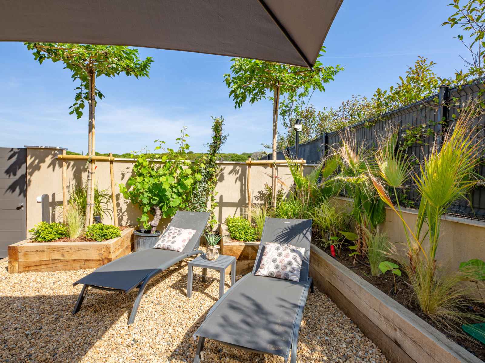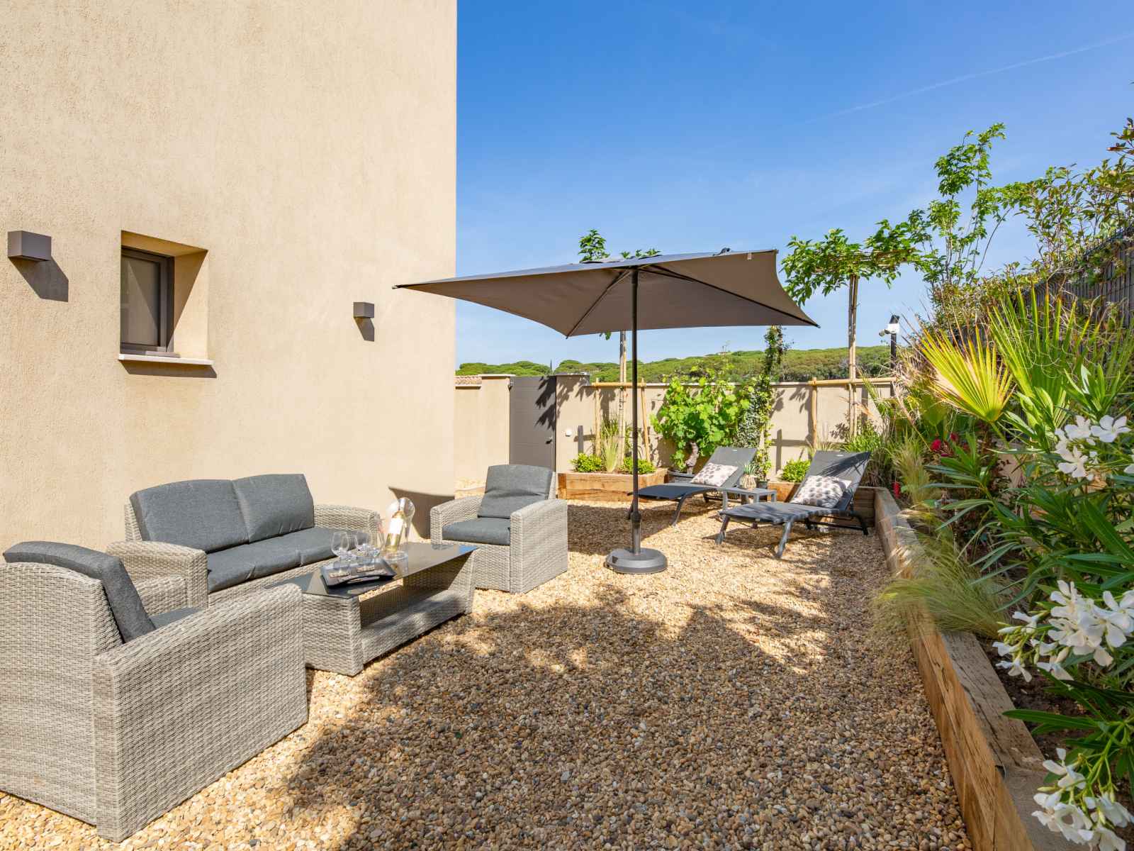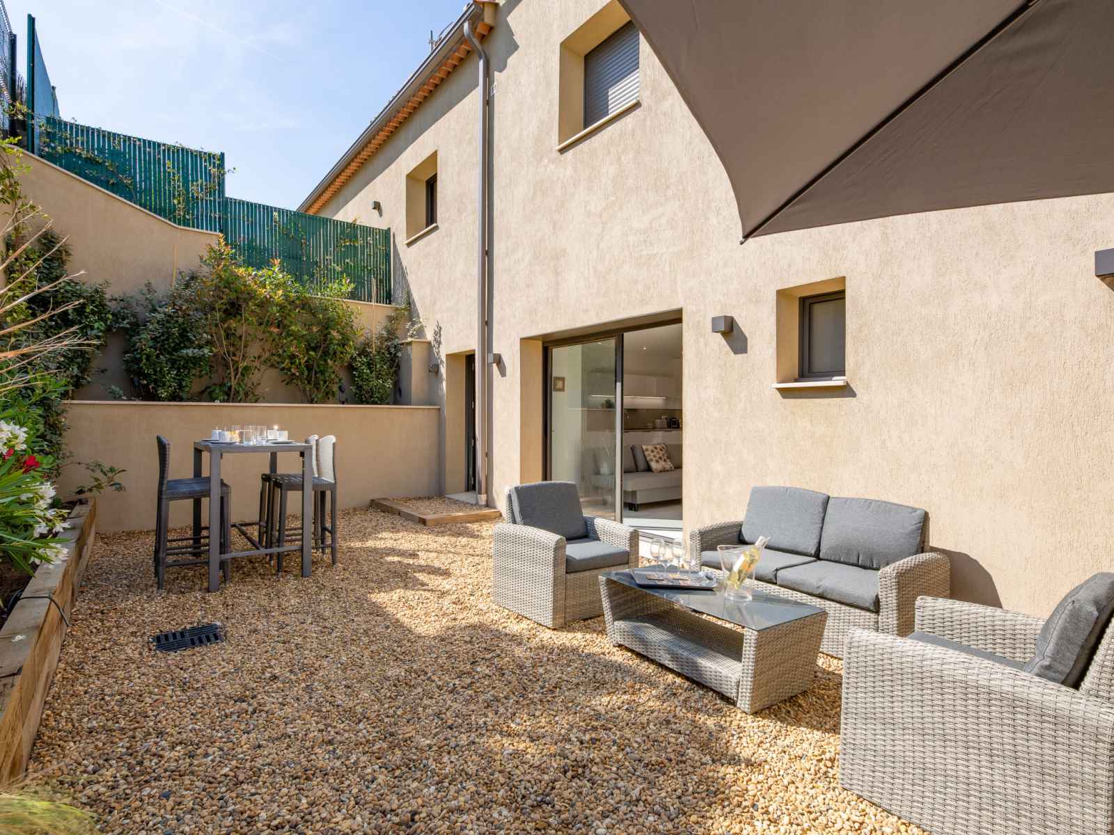 Maison jumelée moderne "akemi", rénovée en 2024. dans le quartier de bouillonnet, en bordure de la localité, à 800 m du centre de sainte-maxime, situation tranquille dans un quartier résidentiel, à 1.3 km de la mer, à 1.3 km de la plage, dans une impasse. a usage privé: jardin entretenu (clôturé) plantes et arbres. magasin