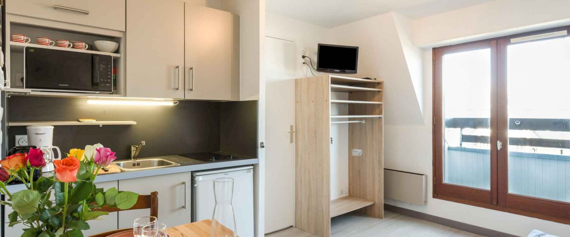 Apt 2 pièces 25 m2 au 3ème étage, situation nord-ouest. séjour/salle à manger avec tv (écran plat). sortie sur le balcon. 1 chambre avec 1 grand-lit (140 cm, longueur 190 cm). coin cuisine (mini-four, lave-vaisselle, 2 plaques vitrocéramiques, grille-pain, bouilloire électrique, cafetière électrique, capsules pour machine à café