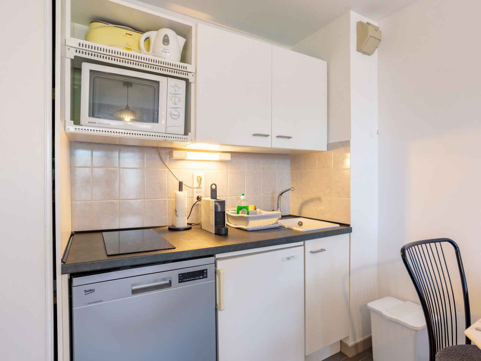 (Nespresso) (NON INCLUSES), combiné micro-ondes). Douche/WC. Chauffage électrique, chauffe eau. Balcon 3 m2, situation nord-ouest. Mobilier de balcon. Belle vue éloignée sur la mer et la localité. A disposition: sèche-cheveux. Internet (Connexion WIFI, en sus). Place de parking No 137. Veuillez noter: logement non-fumeur. Détecteur de fumée. 16640631581BC