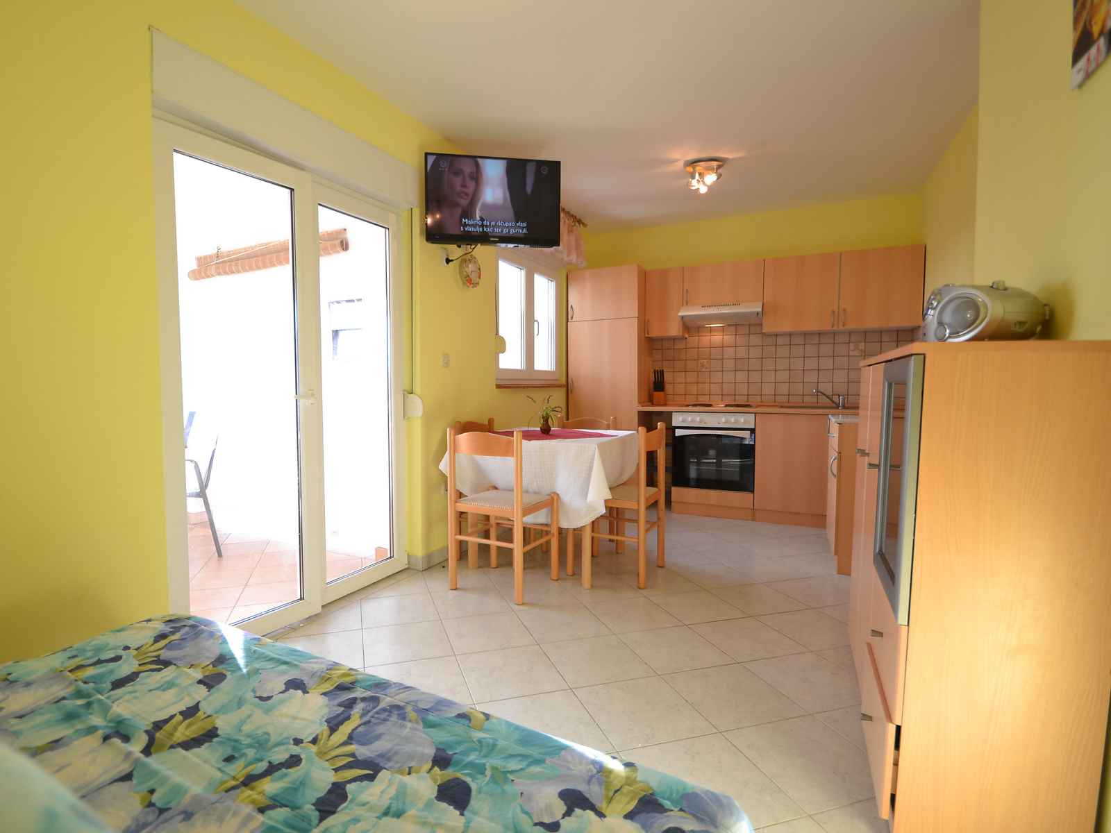 Apt 2 pièces 36 m2 au 1er étage, situation sud-ouest. séjour/salle à manger 15 m2 avec 1 divan-lit double (140 cm, longueur 200 cm), tv (satellite) (écran plat), air-conditionné. sortie sur la terrasse. 1 chambre avec 1 grand-lit (160 cm, longueur 200 cm). cuisine ouverte (4 plaques de cuisson, four, congélateur). douche/wc. pas de