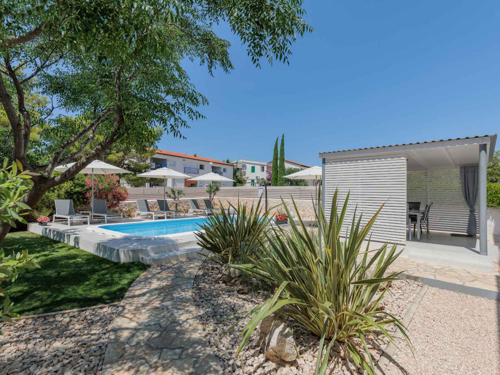 extérieure, barbecue, entretien de la piscine par le propriétaire/jardinier. infrastructures de la maison: accès internet, lave-linge (en commun, en sus). place de parking sur le terrain. magasins 200 m, restaurant 3.5 km, arrêt de bus 3.3 km, plage de rochers 800 m. veuillez noter: aéroport 38 km de la maison. l'eau du robinet n'est pas potable.