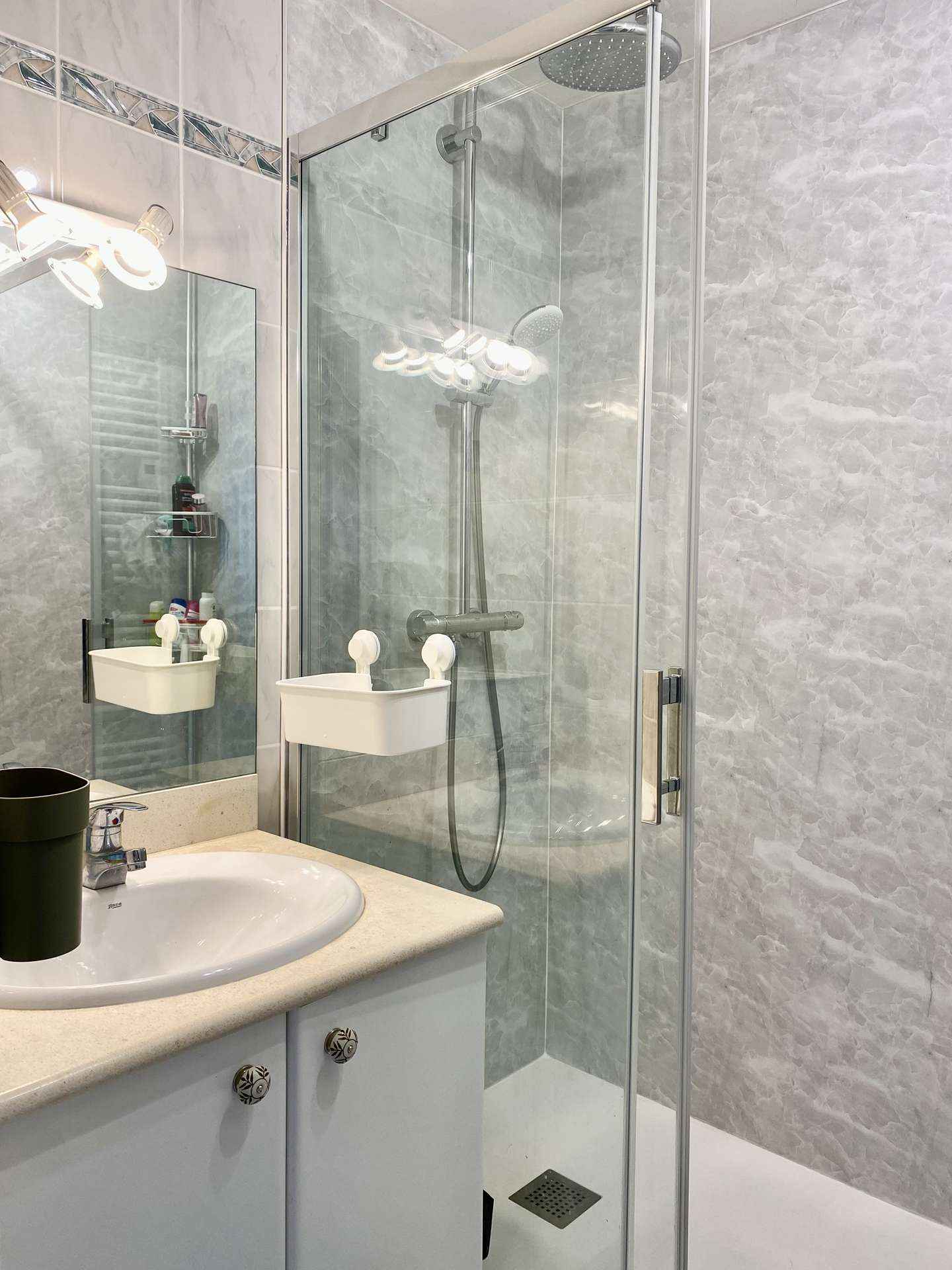 La salle d’eau comprend une douche moderne, une vasque, un grand miroir, un sèche-serviettes et un espace de rangement.