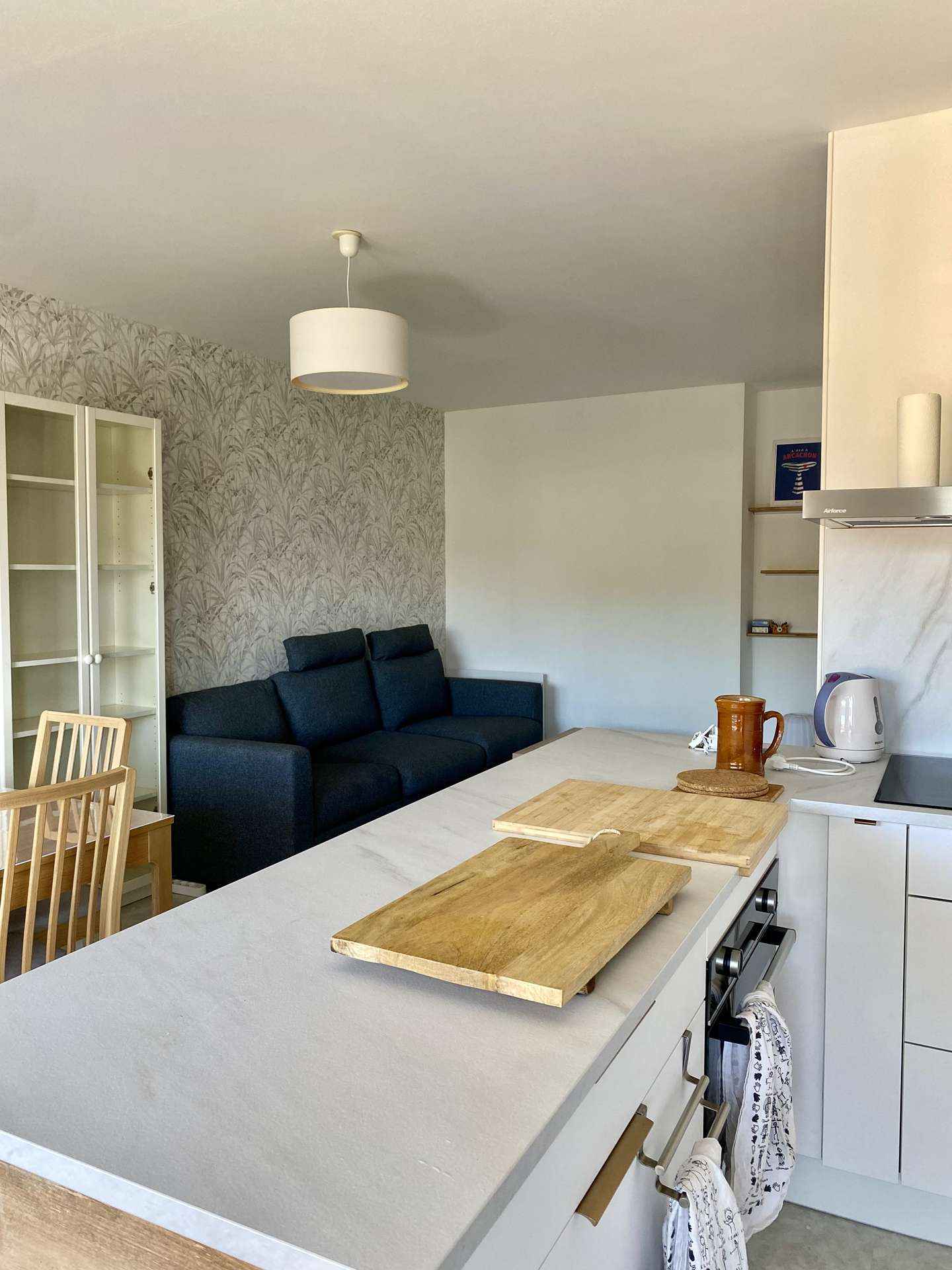 la pièce de vie spacieuse et baignée de lumière grâce à son exposition plein sud vous séduira immédiatement. elle comprend un salon chaleureux avec canapé confortable, télévision écran plat et connexion wifi haut débit, ouvert sur une cuisine moderne