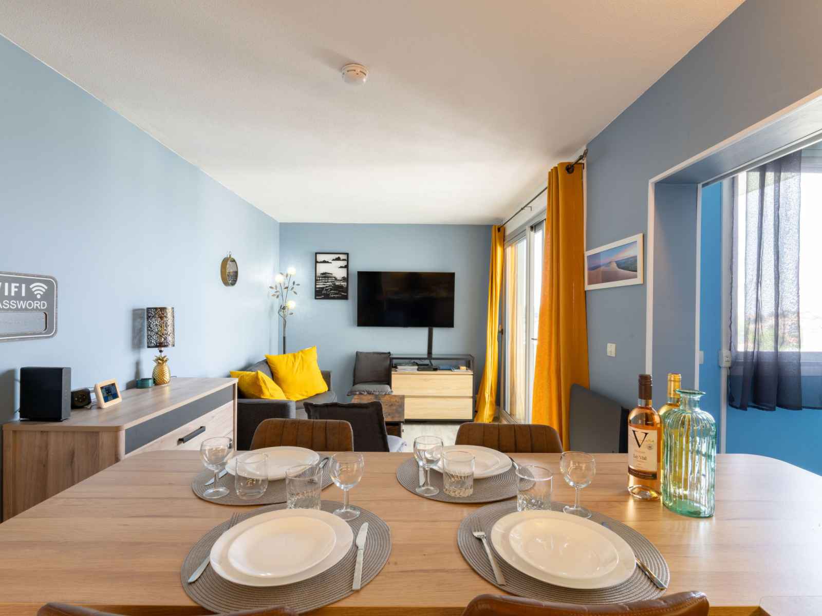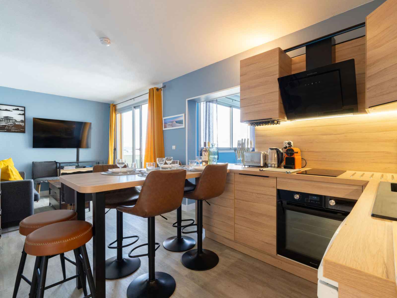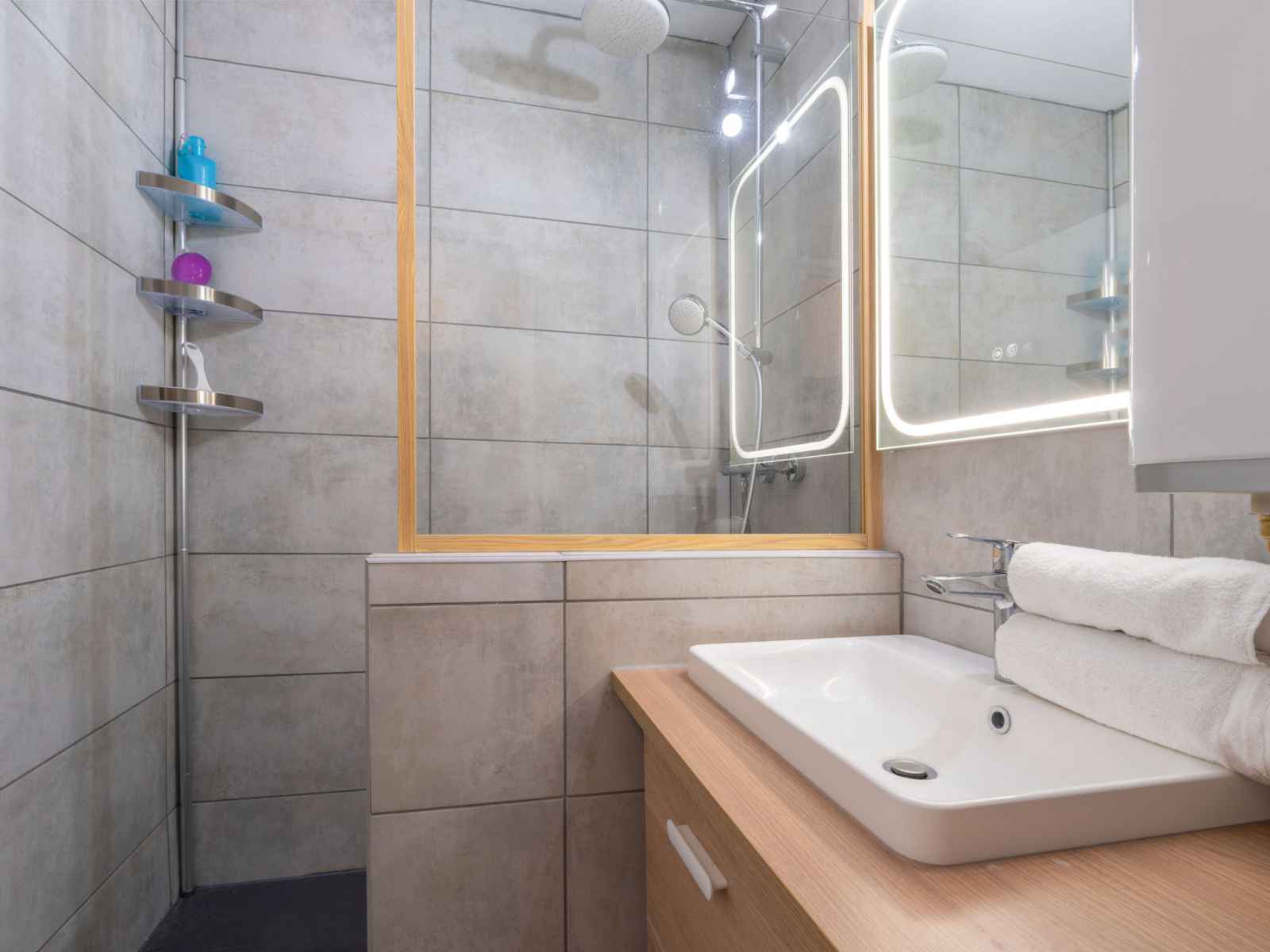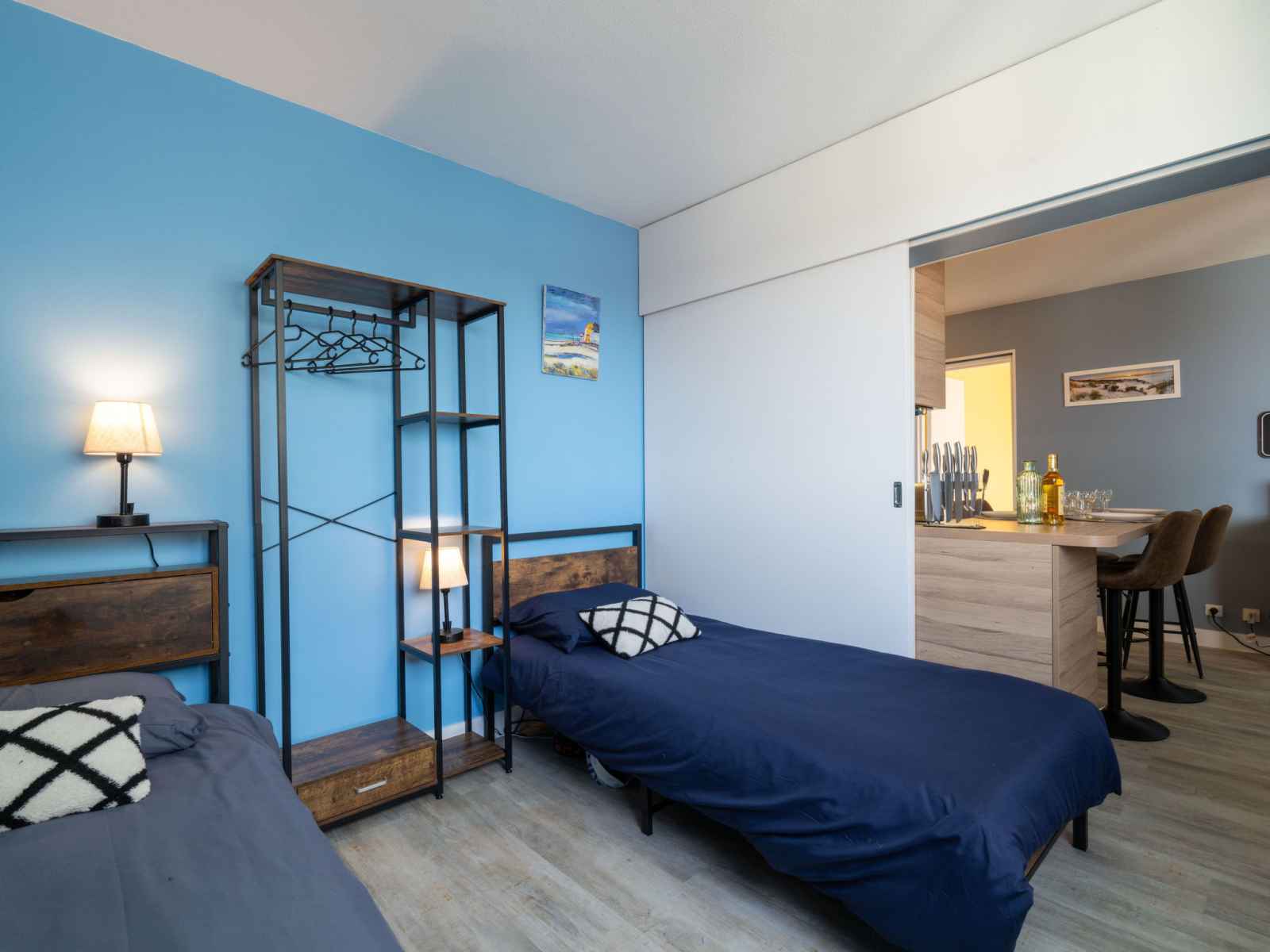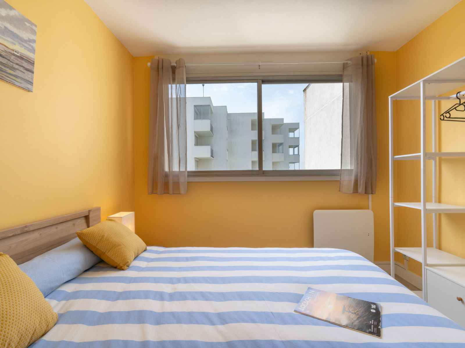 Apt 3 pièces 45 m2 au 9ème étage. aménagement agréable et de bon goût: séjour/salle à manger avec tv (écran plat). sortie sur le balcon. 1 chambre avec 1 grand-lit (1 x 140 cm, longueur 190 cm). 1 chambre avec 2 lits (90 cm, longueur 190 cm). cuisine ouverte (four, lave-vaisselle, 2 plaques à induction, grille-pain, bouilloire