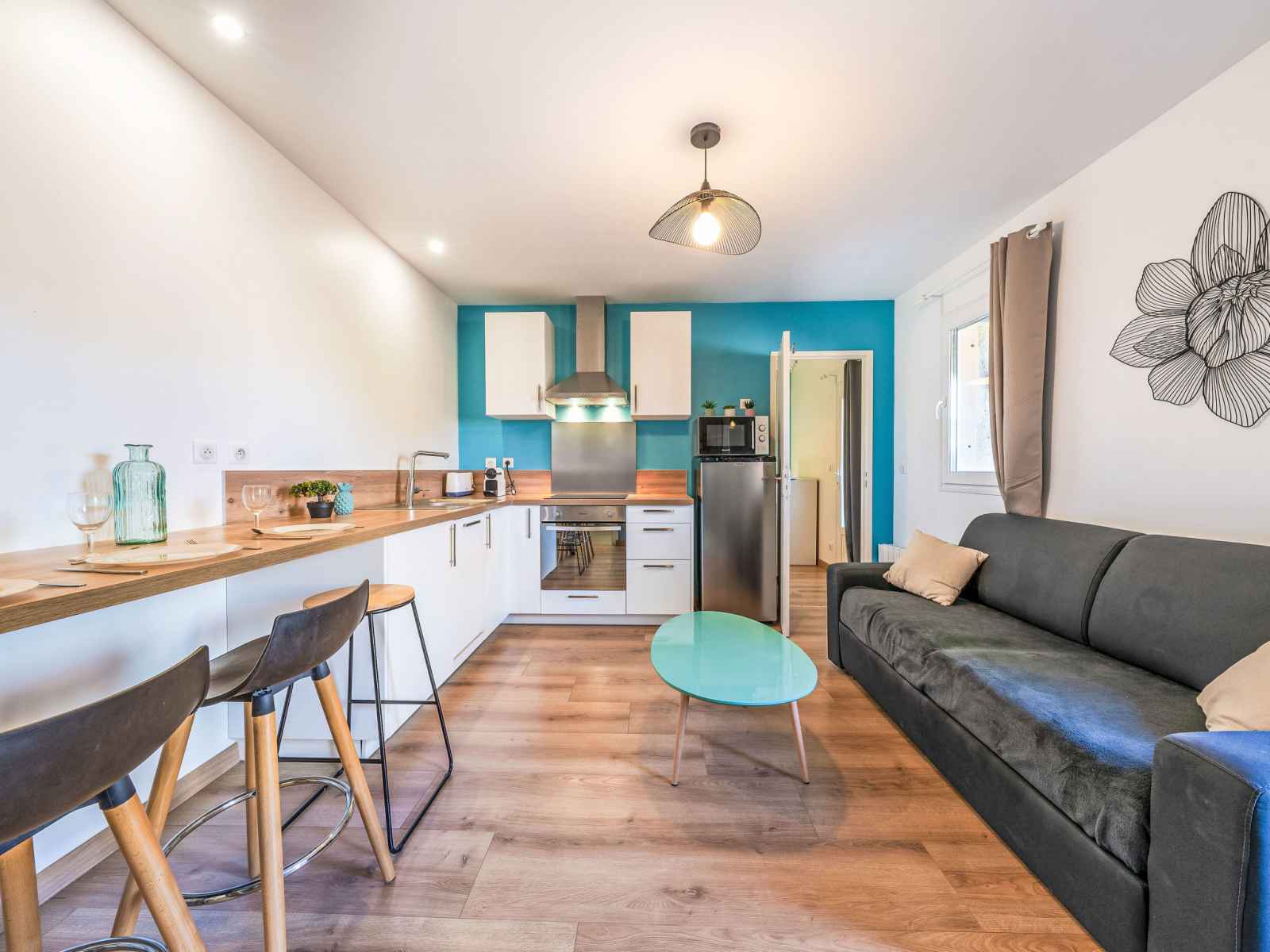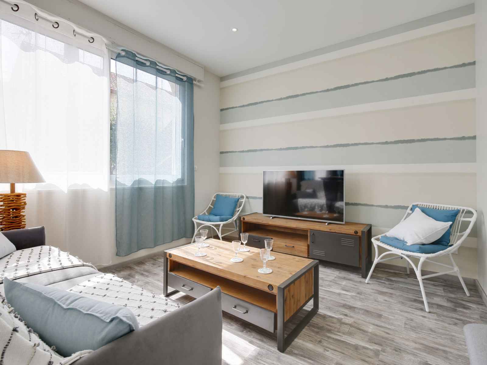 Apt 3 pièces 90 m2 sur 2 niveaux, au rez-de-chaussée. aménagement confortable et agréable: séjour/salle à manger avec 1 divan-lit double (1 x 160 cm, longueur 190 cm), tv (écran plat), air-conditionné. cuisine ouverte (four, lave-vaisselle, 3 plaques à induction, grille-pain, bouilloire électrique, micro-ondes, congélateur, cafetière
