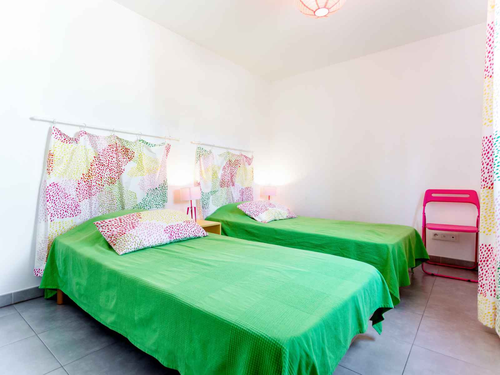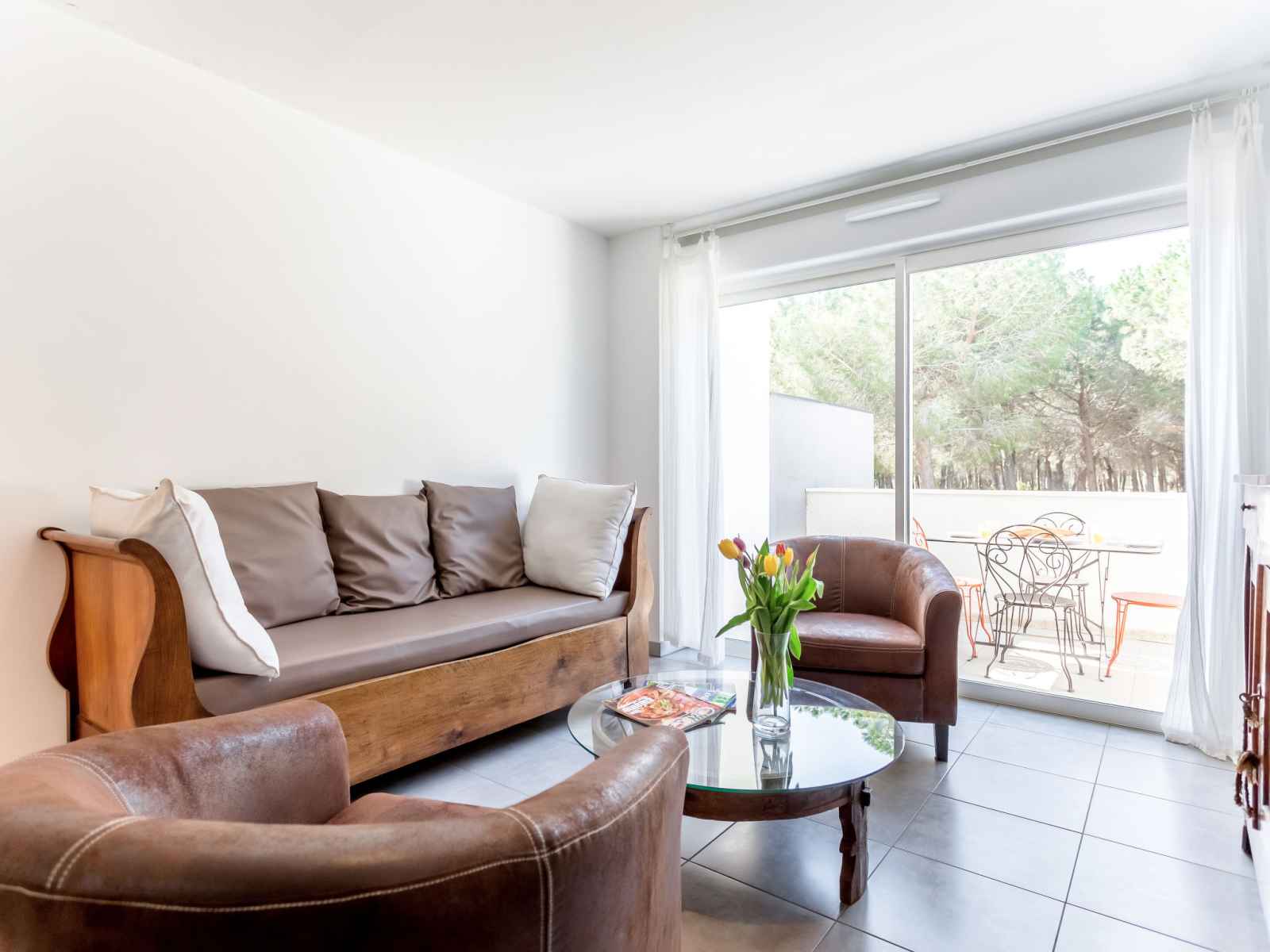 "les pins parasols", apt 3 pièces 60 m2 sur 2 niveaux au 1er étage. clair, aménagement moderne: à l'étage supérieur: (escalier extérieur) séjour/salle à manger avec table pour les repas et tv (satellite). sortie sur le balcon. 1 chambre avec 1 grand-lit (160 cm). 1 chambre avec 2 lits (90 cm). cuisine ouverte (four, lave-vaisselle, 4