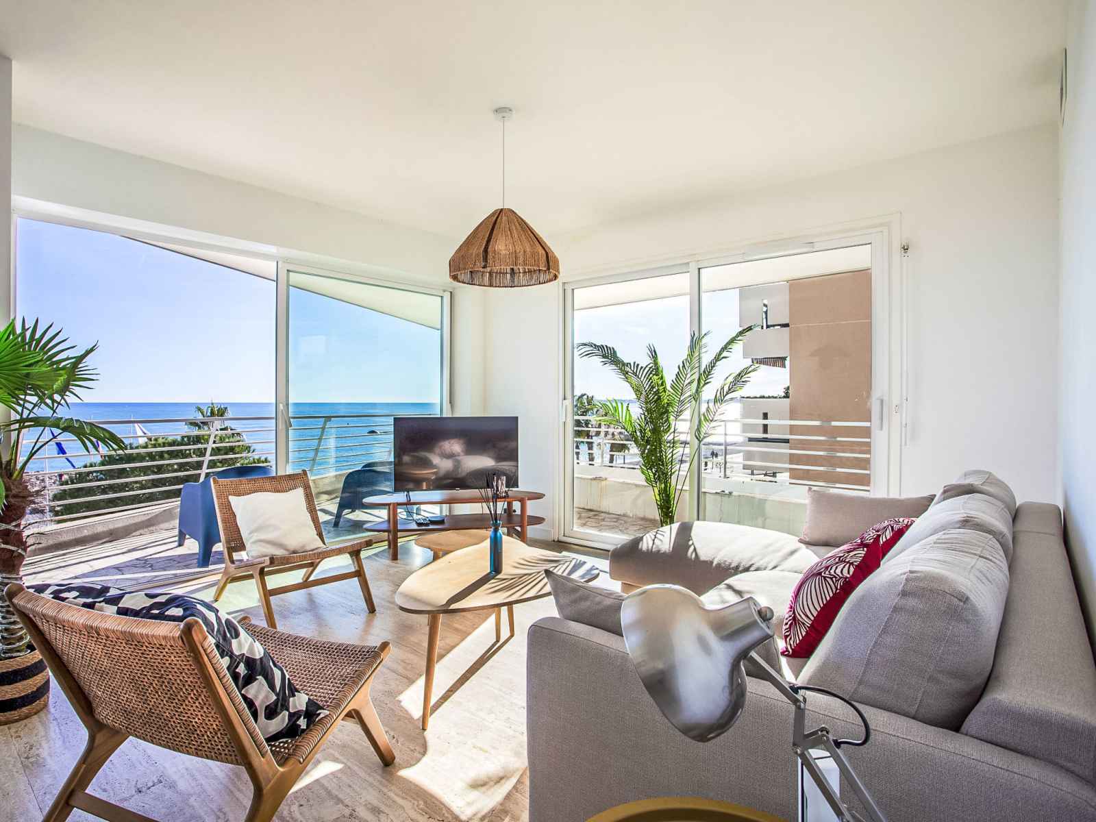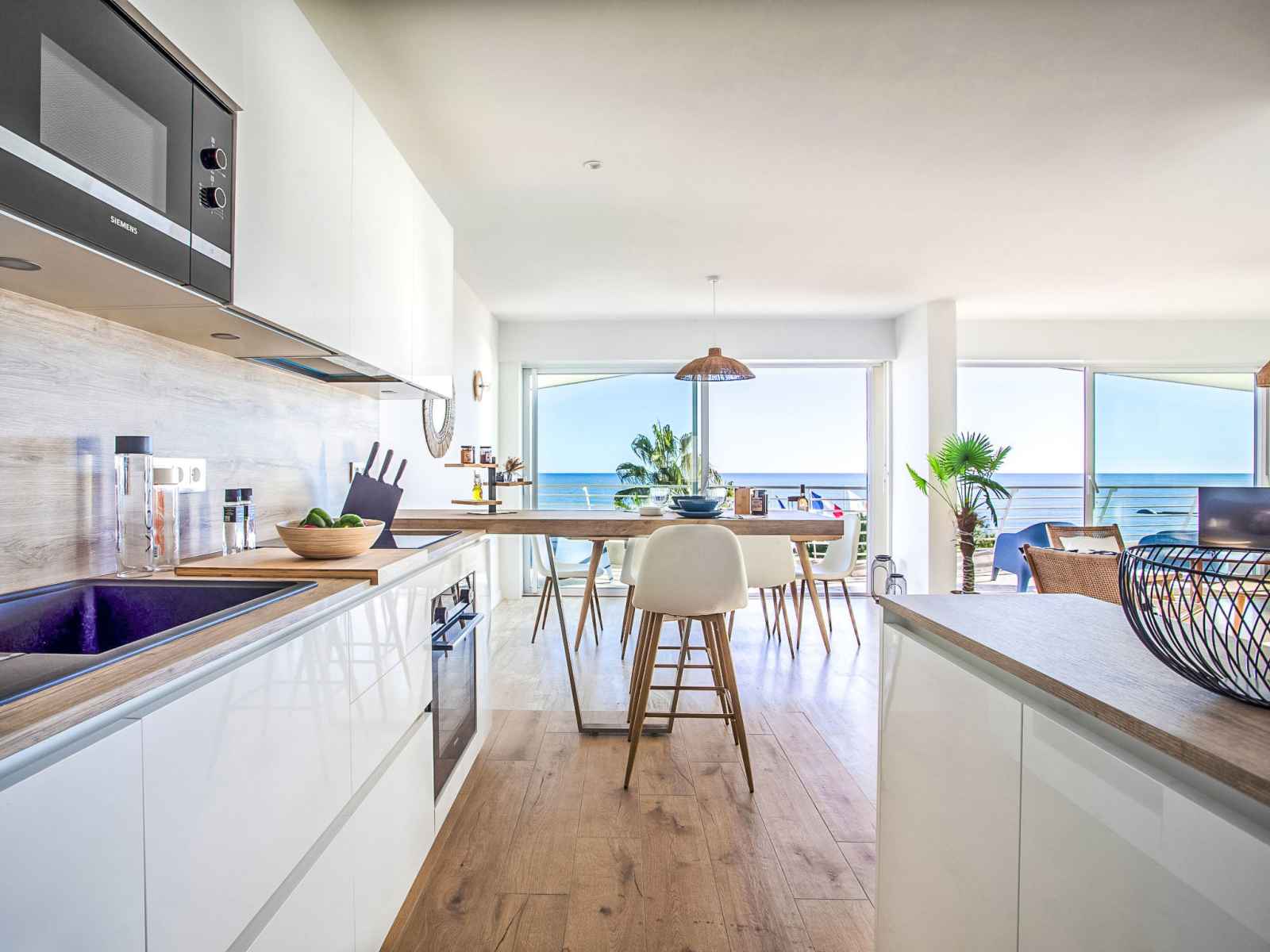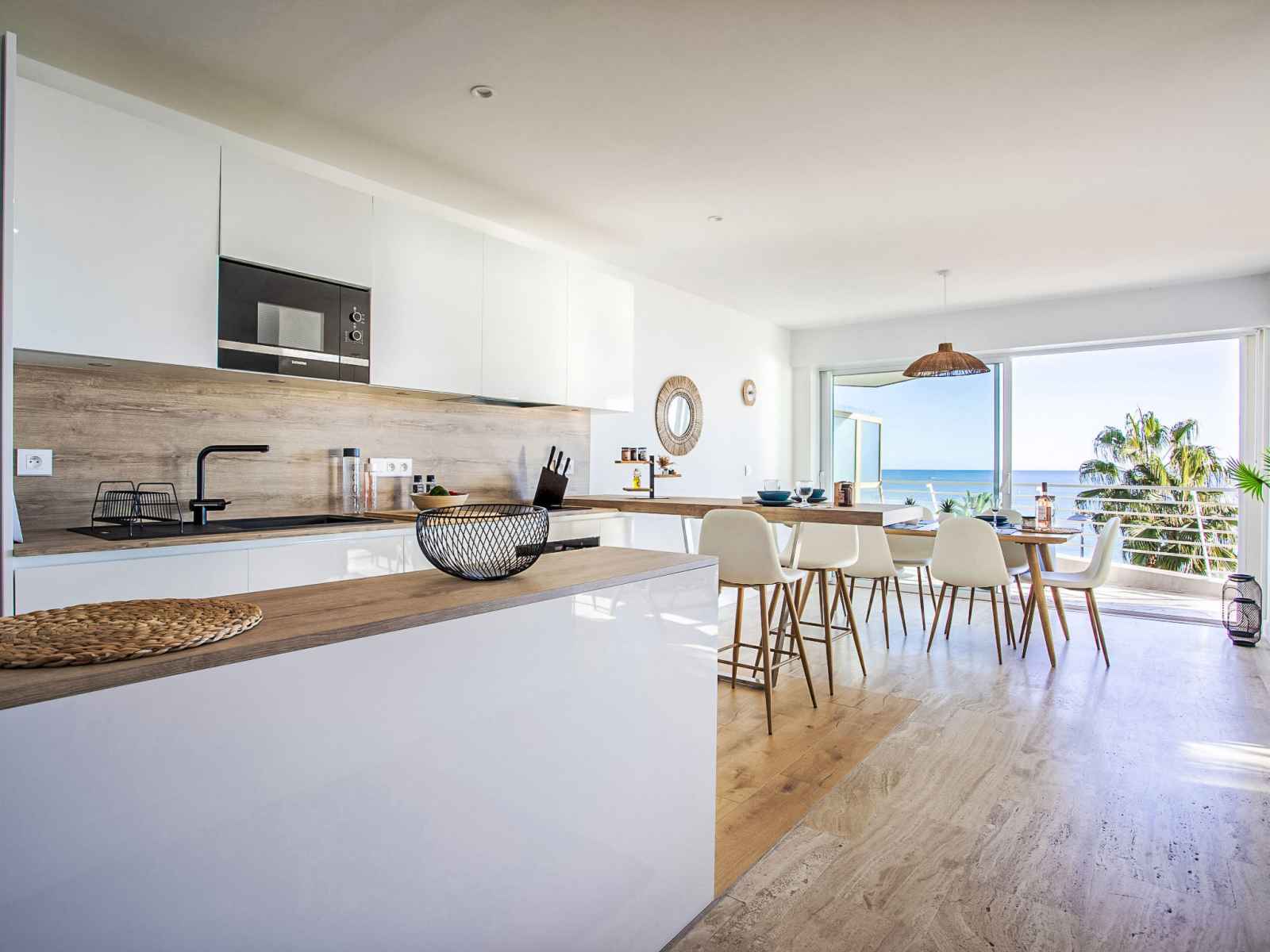 Cuisine ouverte (four, lave-vaisselle, 3 plaques à induction, grille-pain, bouilloire électrique, micro-ondes, cafetière électrique). Sortie sur la terrasse. Douche/WC. Chauffage, air-conditionné. Grand balcon 10 m2, situation nord et situation ouest, grande terrasse 15 m2, situation sud et situation ouest. Meubles de terrasse. Très belle vue panoramique sur la mer. A disposition: lave-linge, fer à repasser, sèche-cheveux. Internet (Connexion WIFI, gratuit). Place de parking (1 Voiture). Veuillez noter: maison non-fumeur. Détecteur de fumée. Annonce d'un particulier (art 155, IV du CGI). 06027034453DP