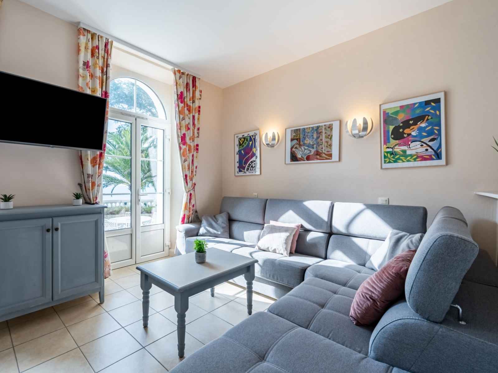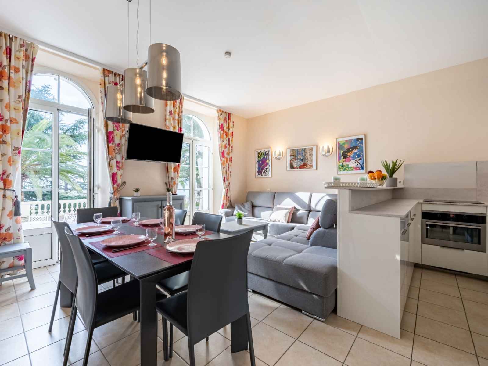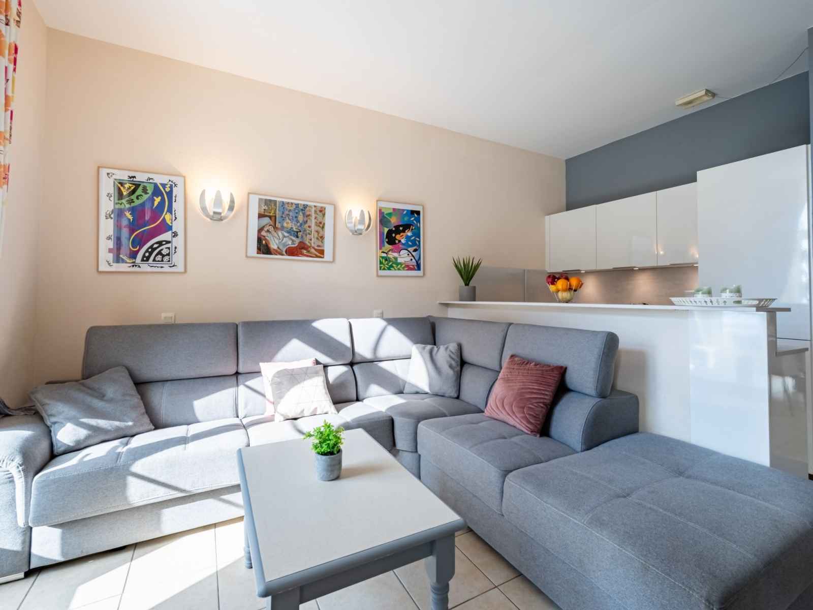 Apt 3 pièces 50 m2, rez-de-chaussée surélevé. aménagement confortable et agréable: séjour/salle à manger avec tv (écran plat). sortie sur la terrasse. 1 chambre avec 1 grand-lit (1 x 160 cm, longueur 200 cm). sortie sur la terrasse. 1 chambre avec 1 x 2 lits superposés (80 cm, longueur 190 cm). cuisine ouverte (four, lave-vaisselle, 3