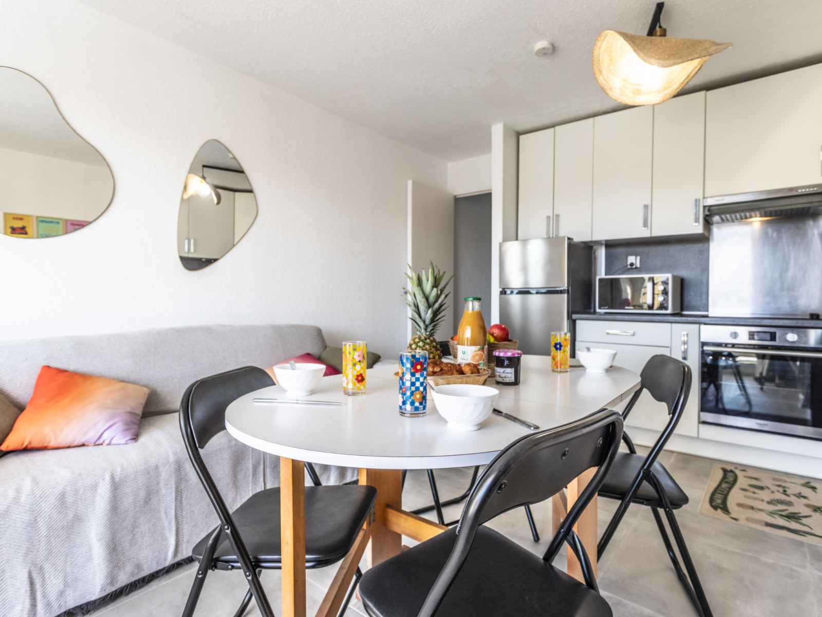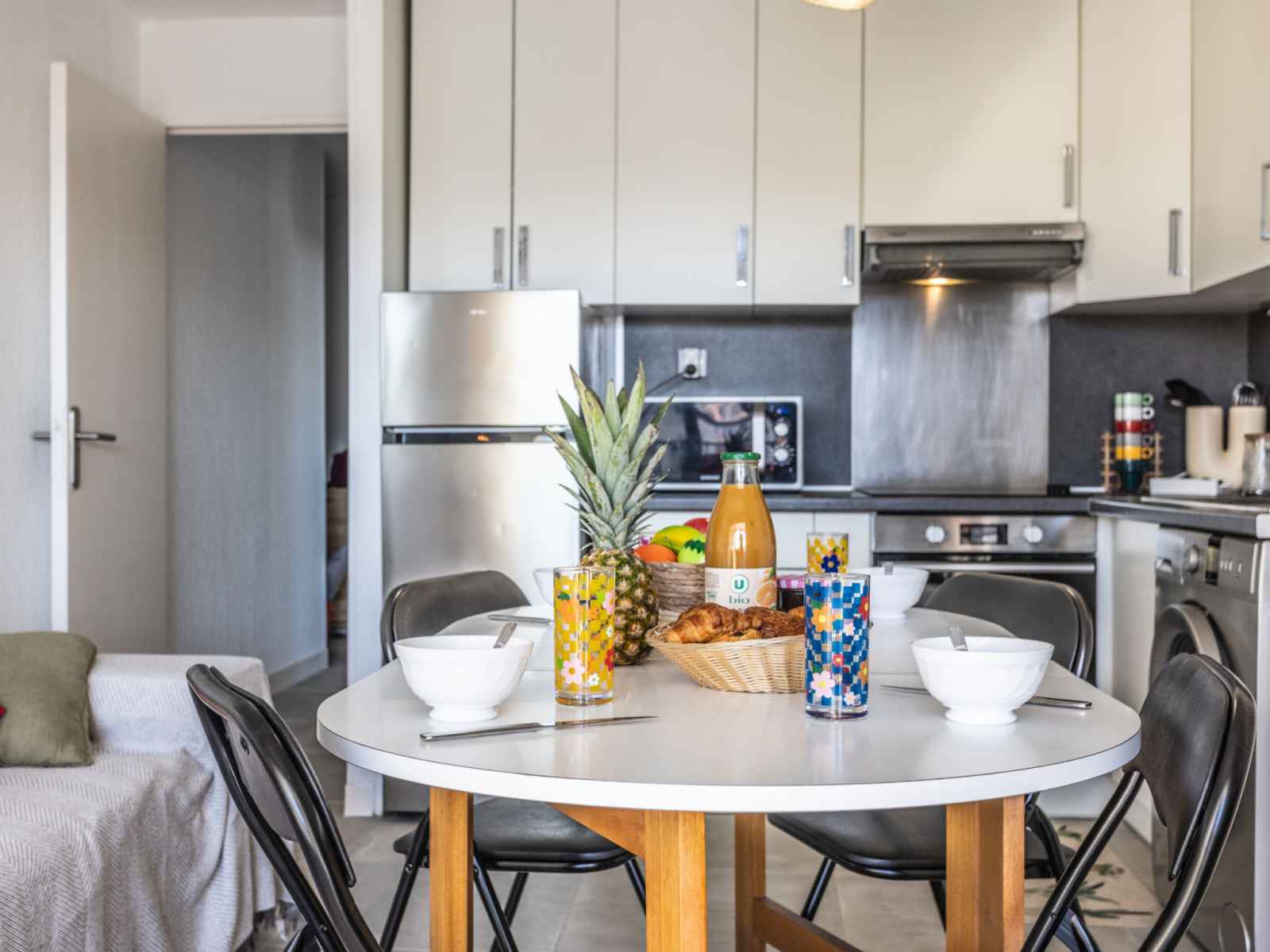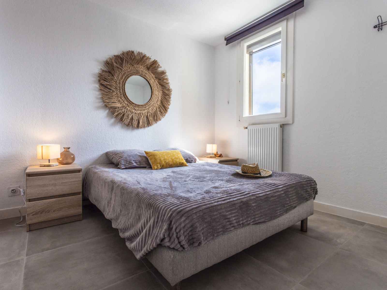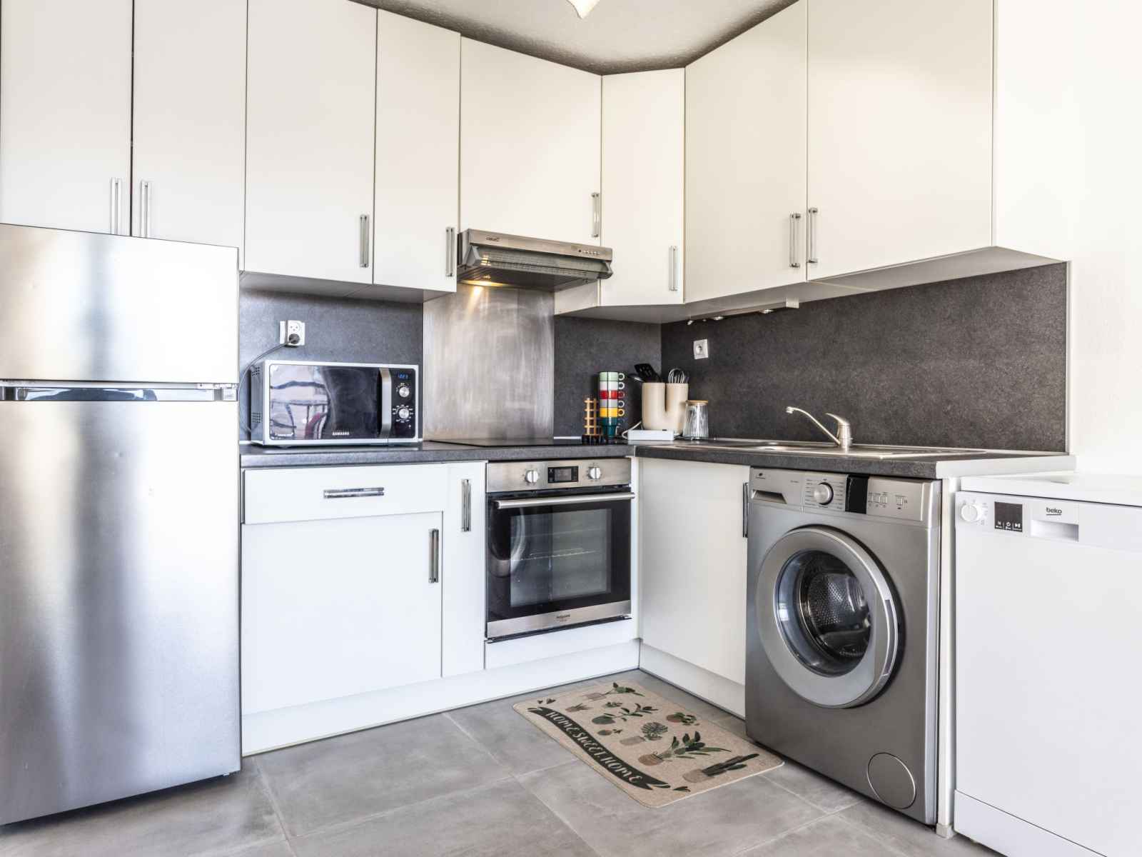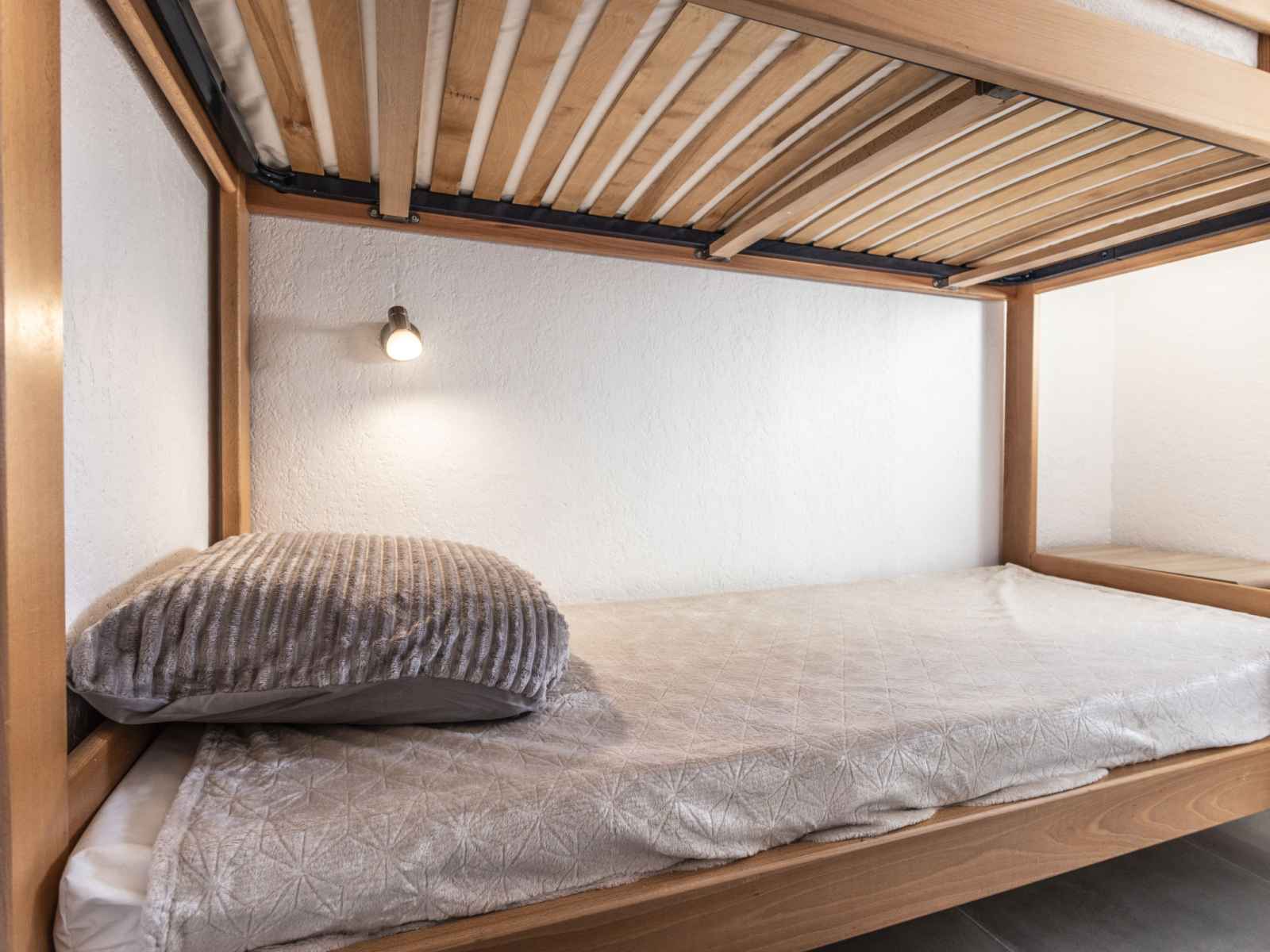 Apt 3 pièces 37 m2 au 2ème étage, situation sud-est. séjour/salle à manger avec tv (écran plat), air-conditionné. sortie sur la terrasse. 1 chambre 10 m2 avec 1 grand-lit (140 cm, longueur 190 cm). cabine avec 1 x 2 lits superposés (190 cm, longueur 90 cm). cuisine ouverte (four, lave-vaisselle, 3 plaques vitrocéramiques, grille-pain,