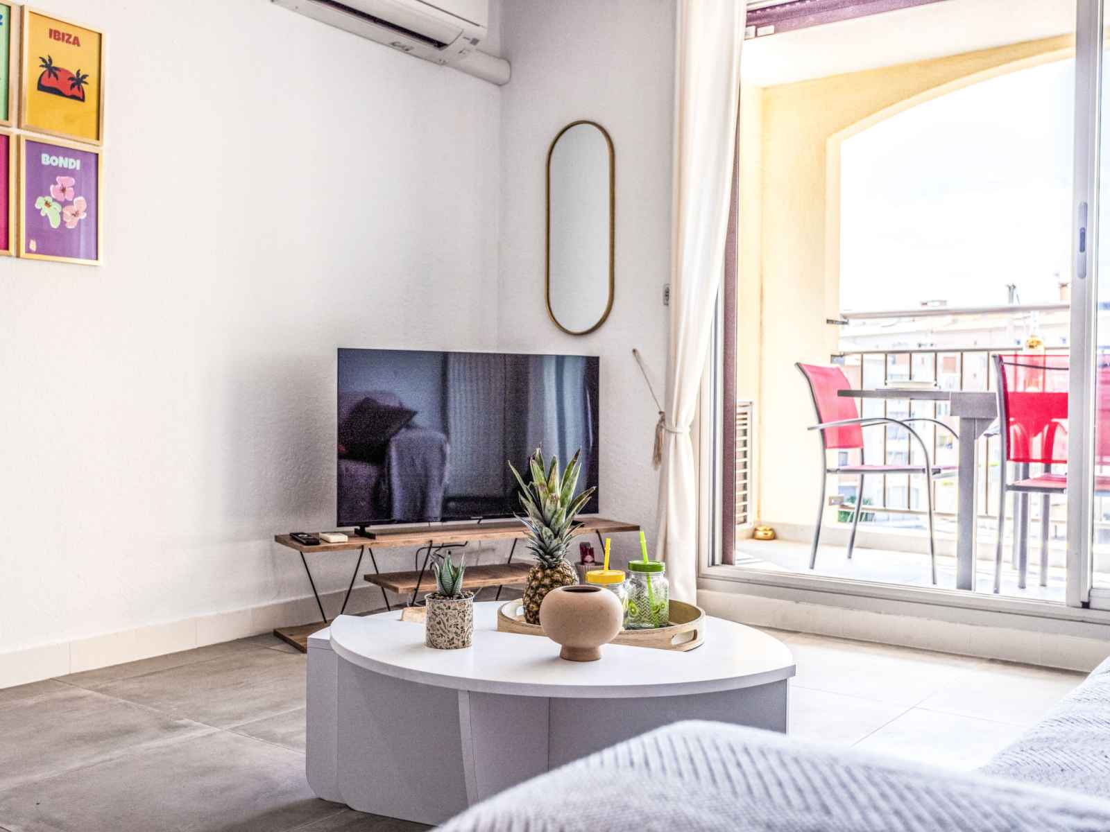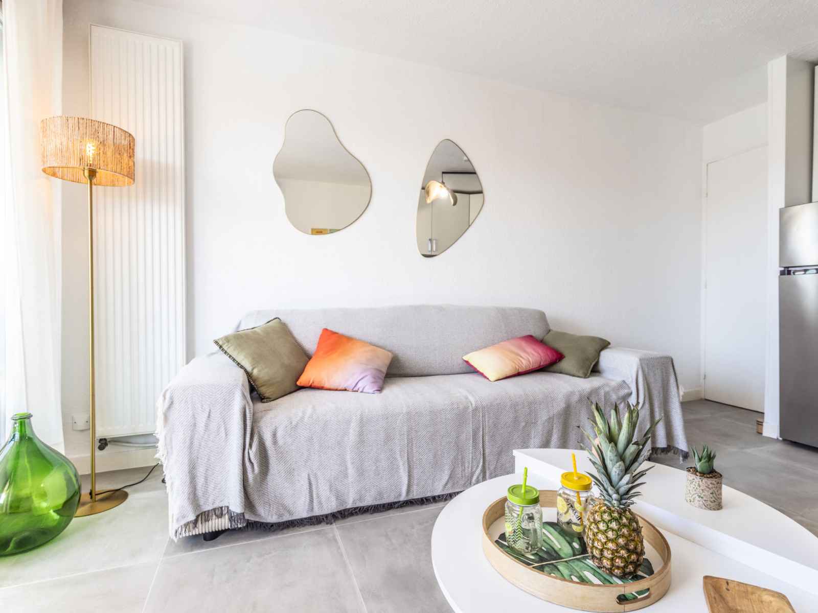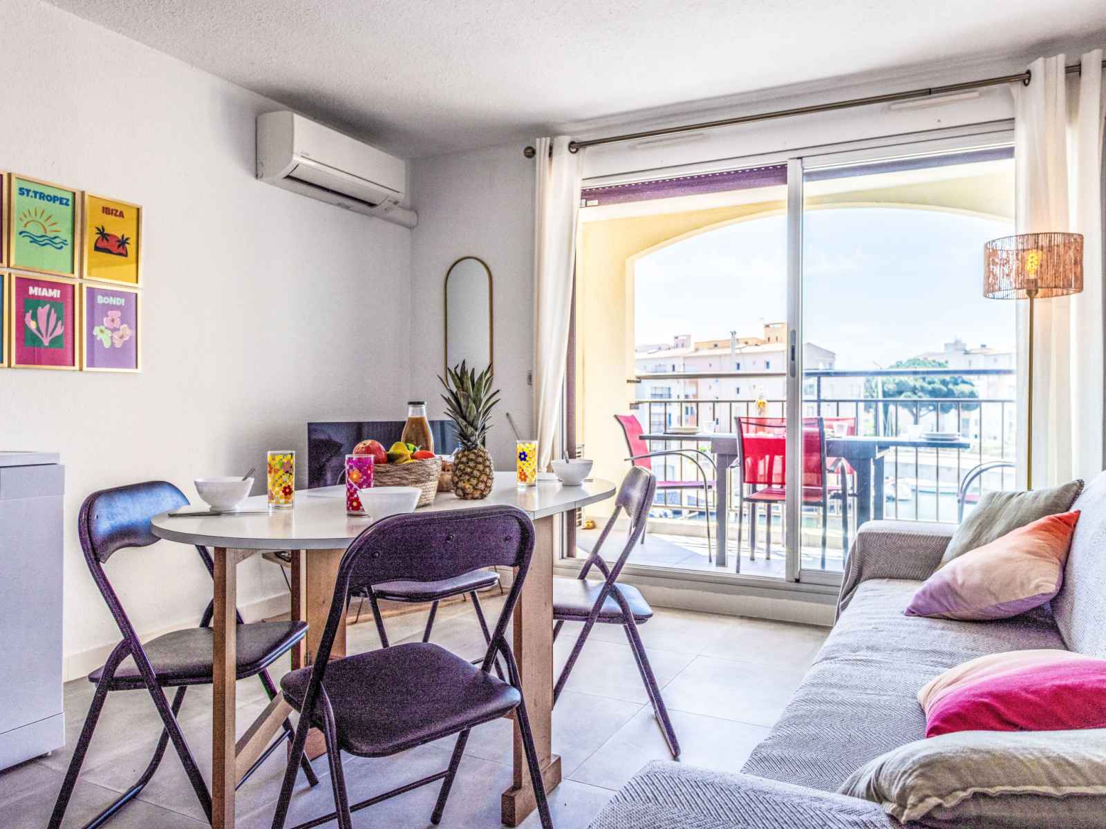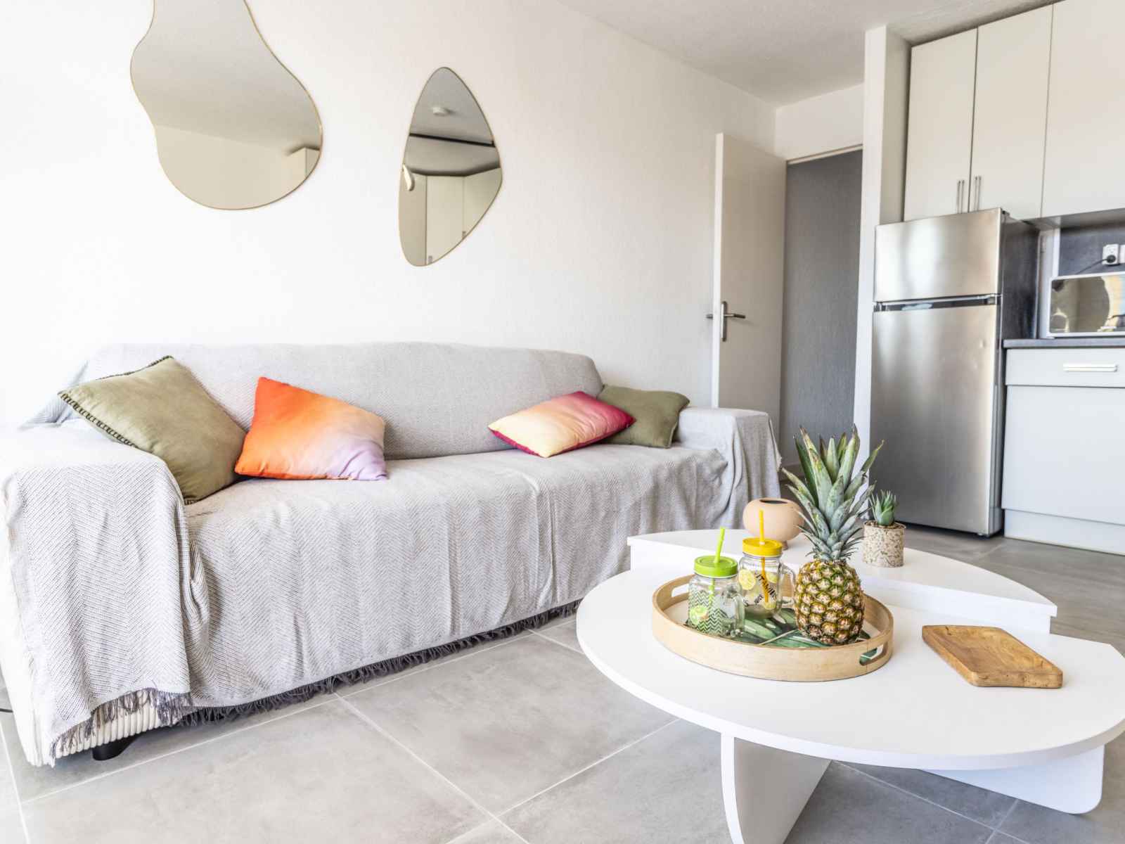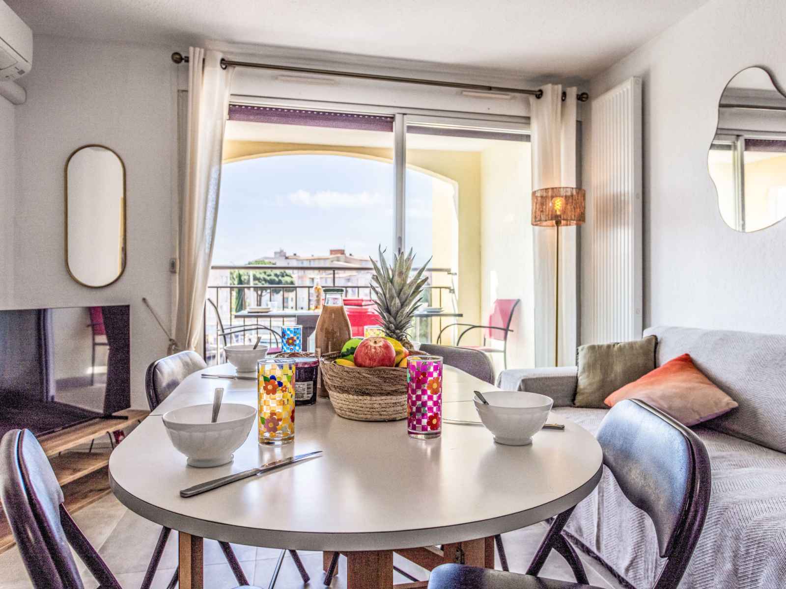 Apt 3 pièces 37 m2 au 2ème étage, situation sud-est. séjour/salle à manger avec tv (écran plat), air-conditionné. sortie sur la terrasse. 1 chambre 10 m2 avec 1 grand-lit (140 cm, longueur 190 cm). cabine avec 1 x 2 lits superposés (190 cm, longueur 90 cm). cuisine ouverte (four, lave-vaisselle, 3 plaques vitrocéramiques, grille-pain,