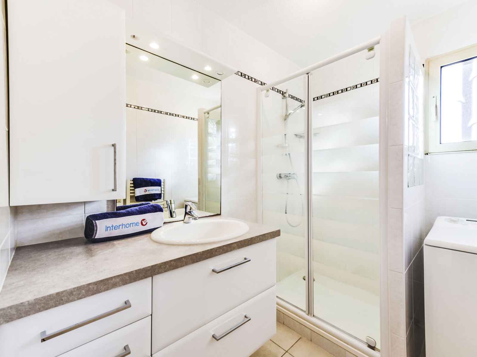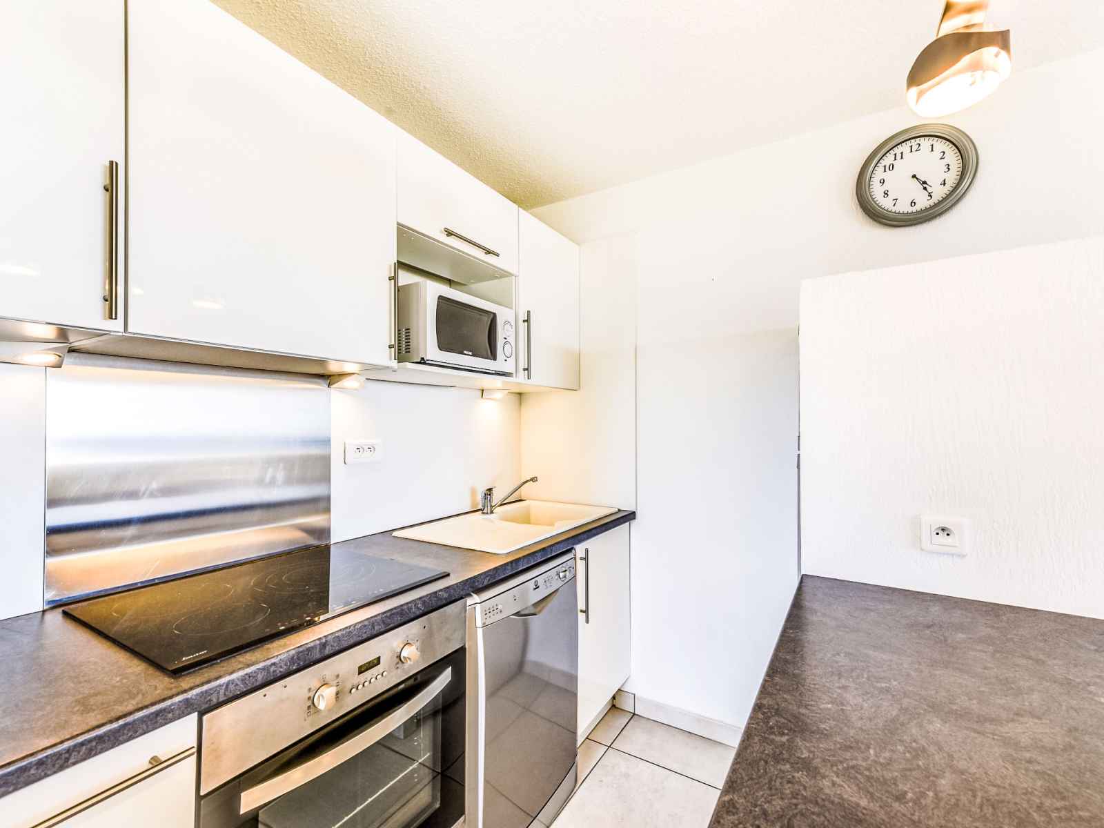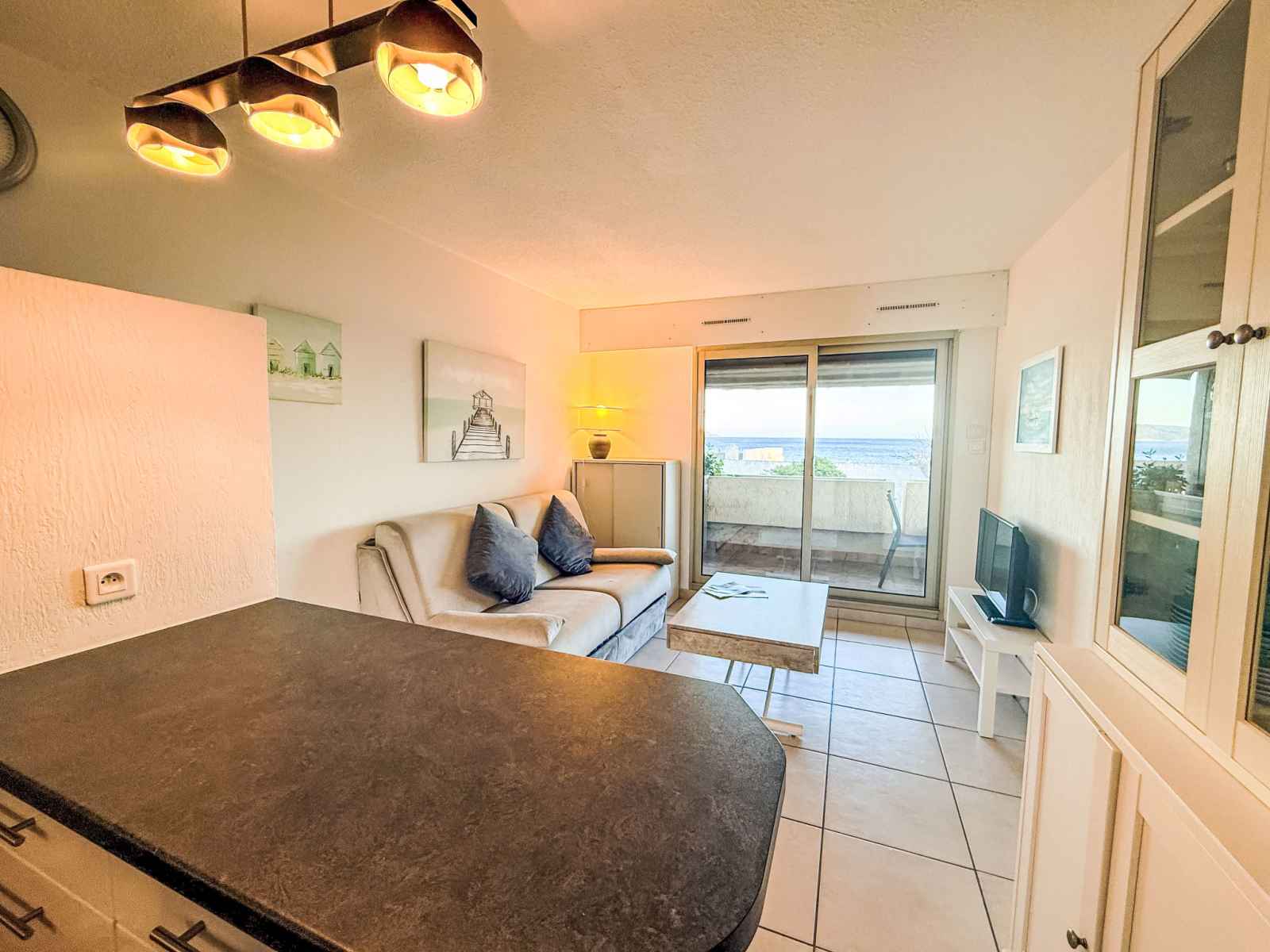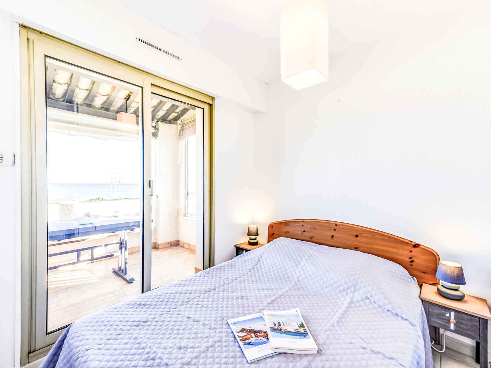 cm), radiateur électrique. Sortie sur la terrasse. 1 chambre avec 1 x 2 lits superposés (80 cm, longueur 190 cm), radiateur électrique. Cuisine ouverte (four, lave-vaisselle, 3 plaques vitrocéramiques, grille-pain, bouilloire électrique, micro-ondes, congélateur, cafetière électrique). Douche, WC séparé. Chauffage électrique, chauffe eau (100 litres). Terrasse 11 m2, situation sud. Meubles de terrasse, chaises longues (2). Belle vue sur la mer. A disposition: lave-linge. Internet (Connexion WIFI, en sus). Place de parking No 15 (cloturée). Veuillez noter: TV seulement FR. Détecteur de fumée.