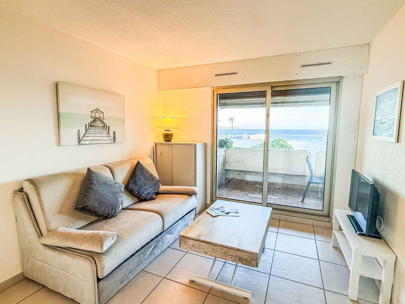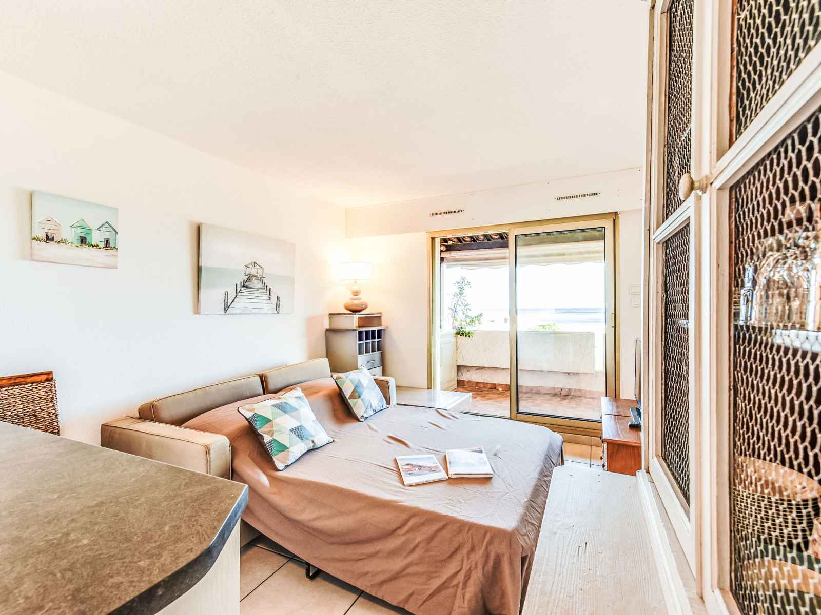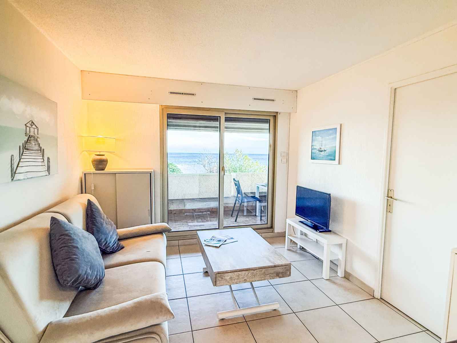 Apt 3 pièces 35 m2 au 1er étage, situation sud. aménagement fonctionnel et confortable: séjour/salle à manger avec baie vitrée avec 1 divan-lit double (1 x 140 cm, longueur 190 cm), tv (écran plat), air-conditionné et volet roulant électrique. sortie sur la terrasse. 1 chambre avec baie vitrée avec 1 grand-lit (1 x 140 cm, longueur 190