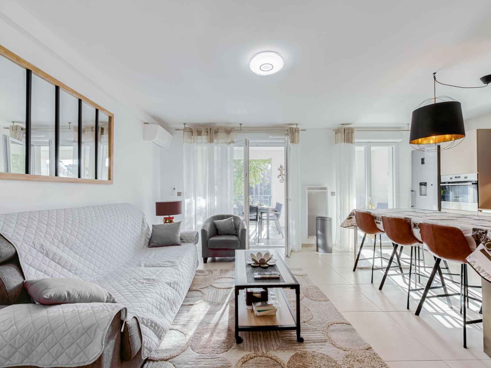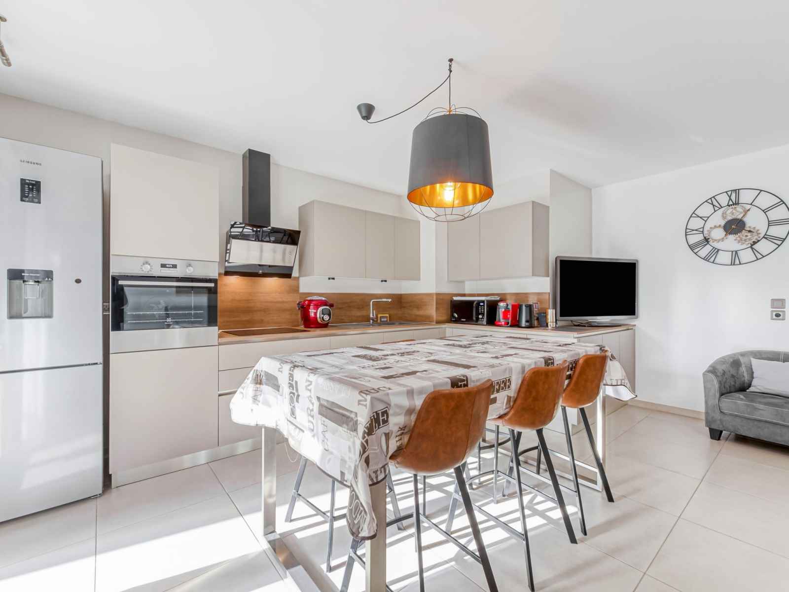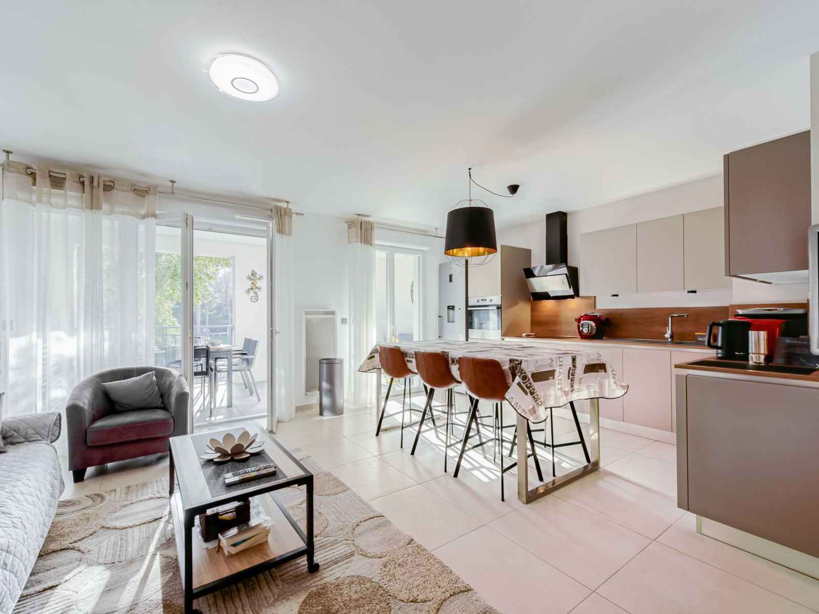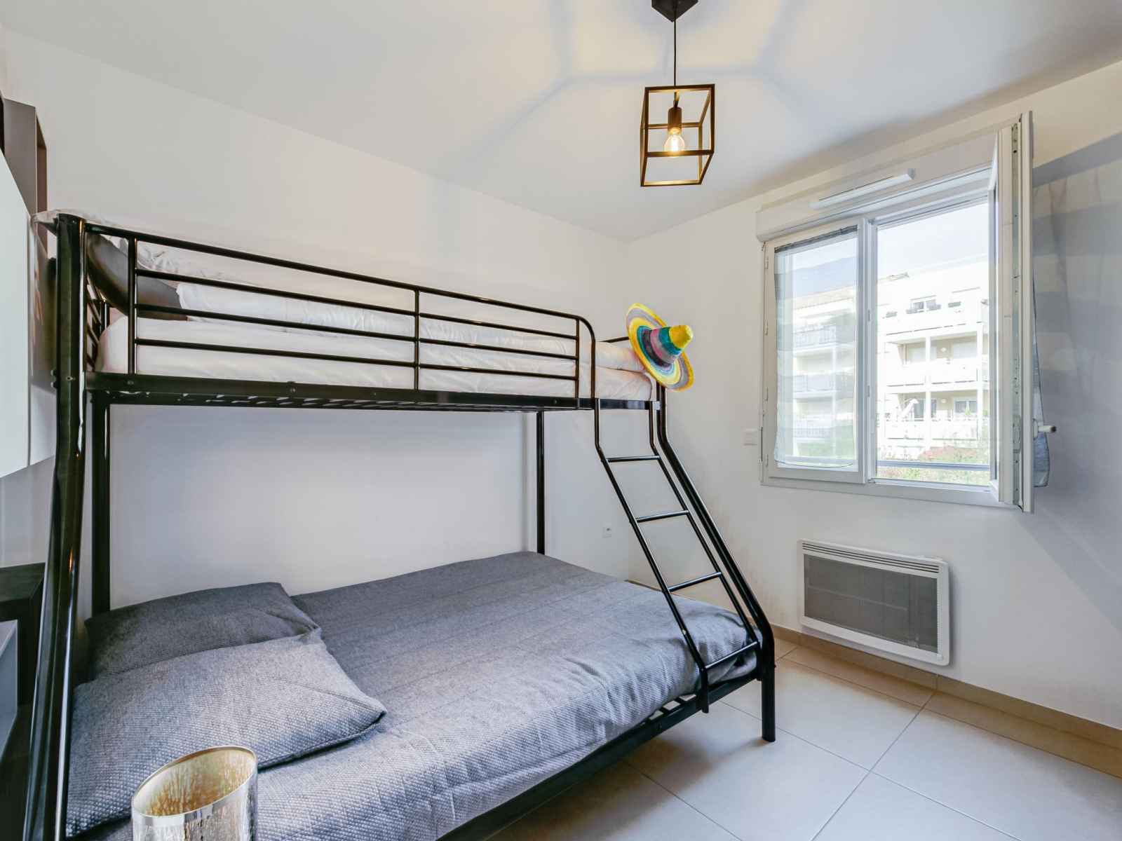 TV (écran plat). 1 chambre avec 1 lits superposés (90 cm, longueur 190 cm), 1 grand-lit (140 cm, longueur 190 cm). Grande cuisine ouverte (four, lave-vaisselle, 4 plaques à induction, grille-pain, bouilloire électrique, micro-ondes, congélateur, cafetière électrique, Capsules pour machine à café (Tassimo) (NON INCLUSES)). Sortie sur la terrasse. Salle de bains, WC séparé. Chauffage électrique, air-conditionné, chauffe eau (300 litres). Terrasse 13 m2, couverte, situation sud et situation ouest. Meubles de terrasse, barbecue électrique. Très belle vue sur la piscine et le jardin. A disposition: lave-linge, fer à repasser, sèche-cheveux. Internet (Connexion WIFI, gratuit). Garage No 347, hauteur 200 cm, largeur 233 cm. Veuillez noter: logement non-fumeur. Détecteur de fumée.
