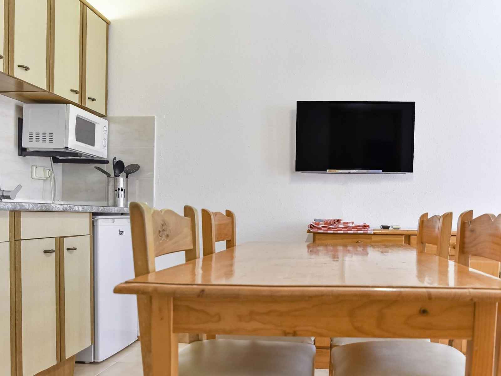 kitchenette équipée avec plaque vitrocéramique, réfrigérateur, micro-onde, cafetière italienne