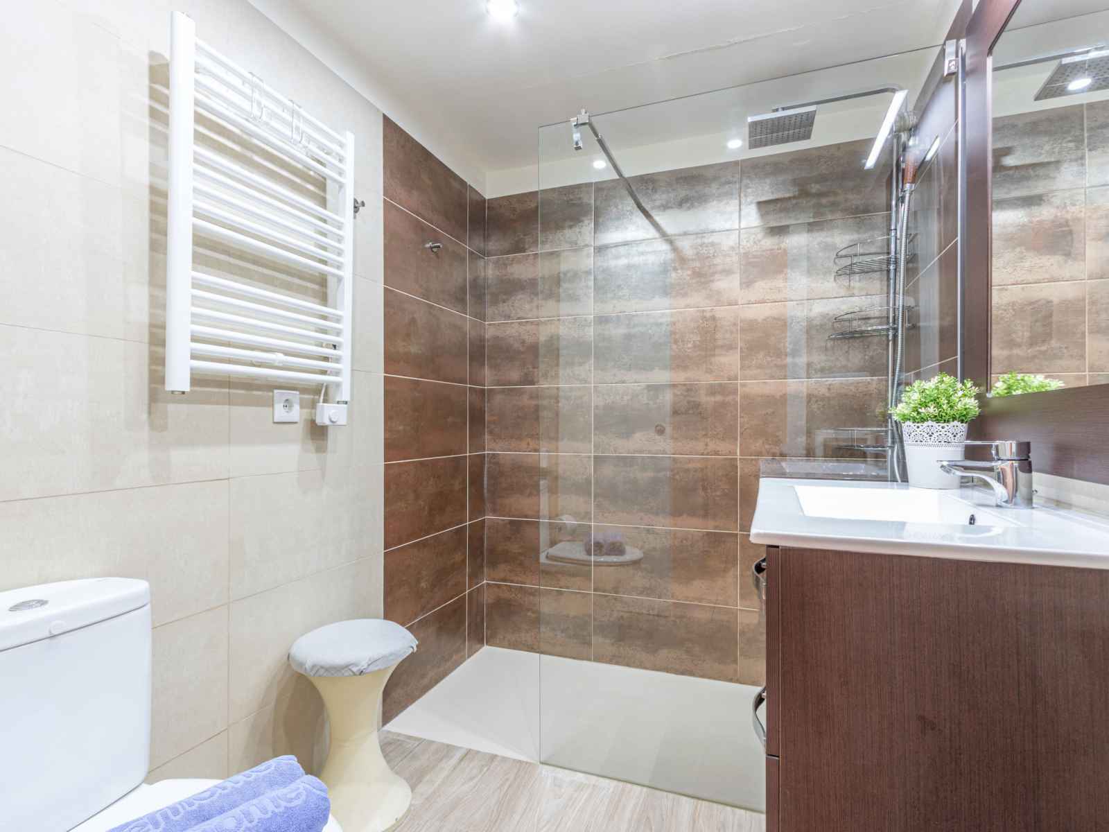 Apt 3 pièces 56 m2 au 2ème étage. clair, complètement rénové, aménagement confortable et moderne: séjour/salle à manger avec table pour les repas, tv (satellite) et télévision numérique (écran plat), air-conditionné et chauffage à air chaud. sortie sur le balcon. 1 chambre avec 1 grand-lit (150 cm, longueur 190 cm). sortie sur le
