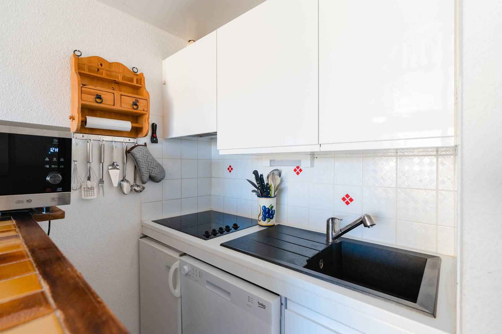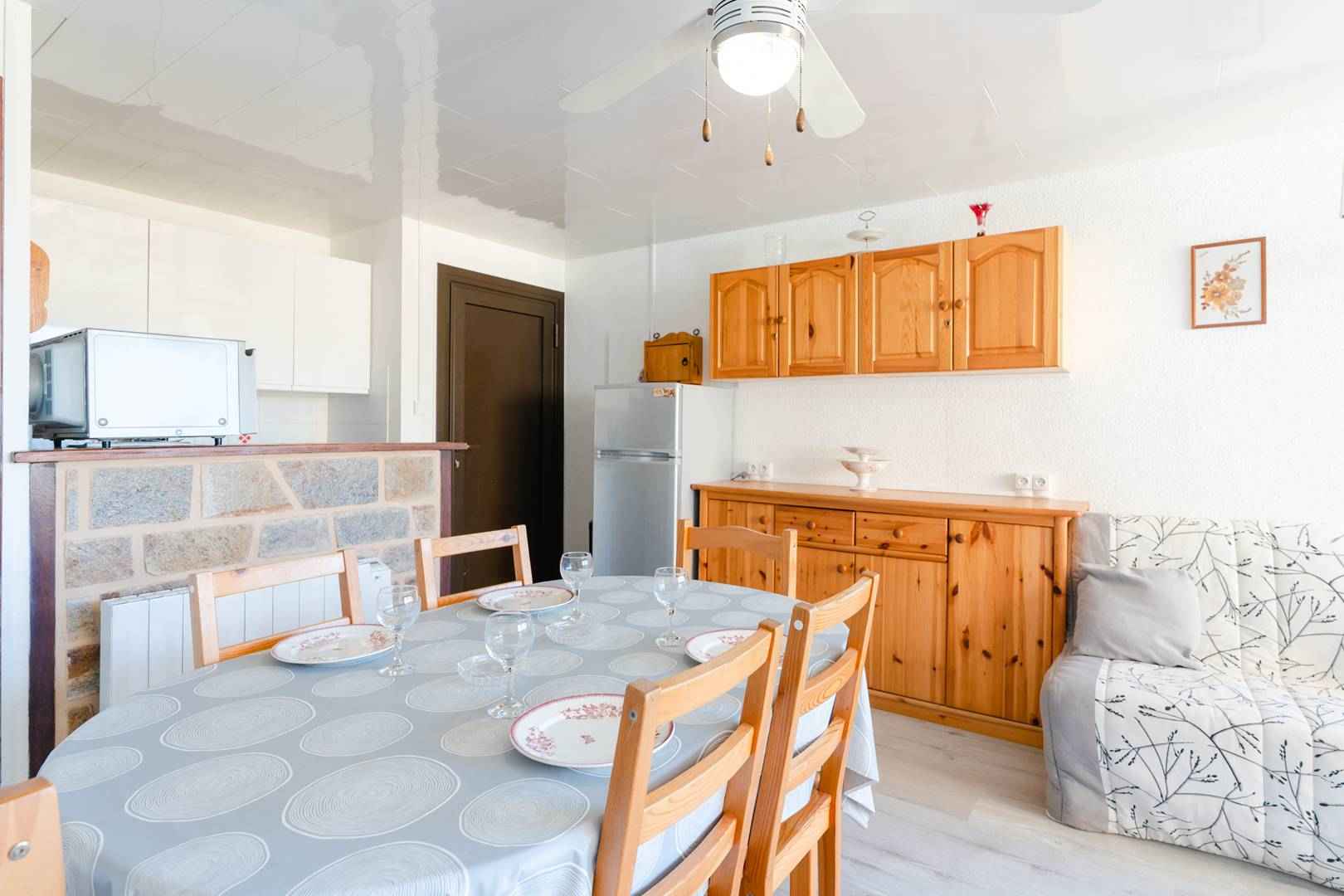 TV (chaînes françaises), table à manger, un coin cuisine équipée (four multifonctions, réfrigérateur avec compartiment congélateur, lave-vaisselle, plaques vitrocéramiques, cafetière).