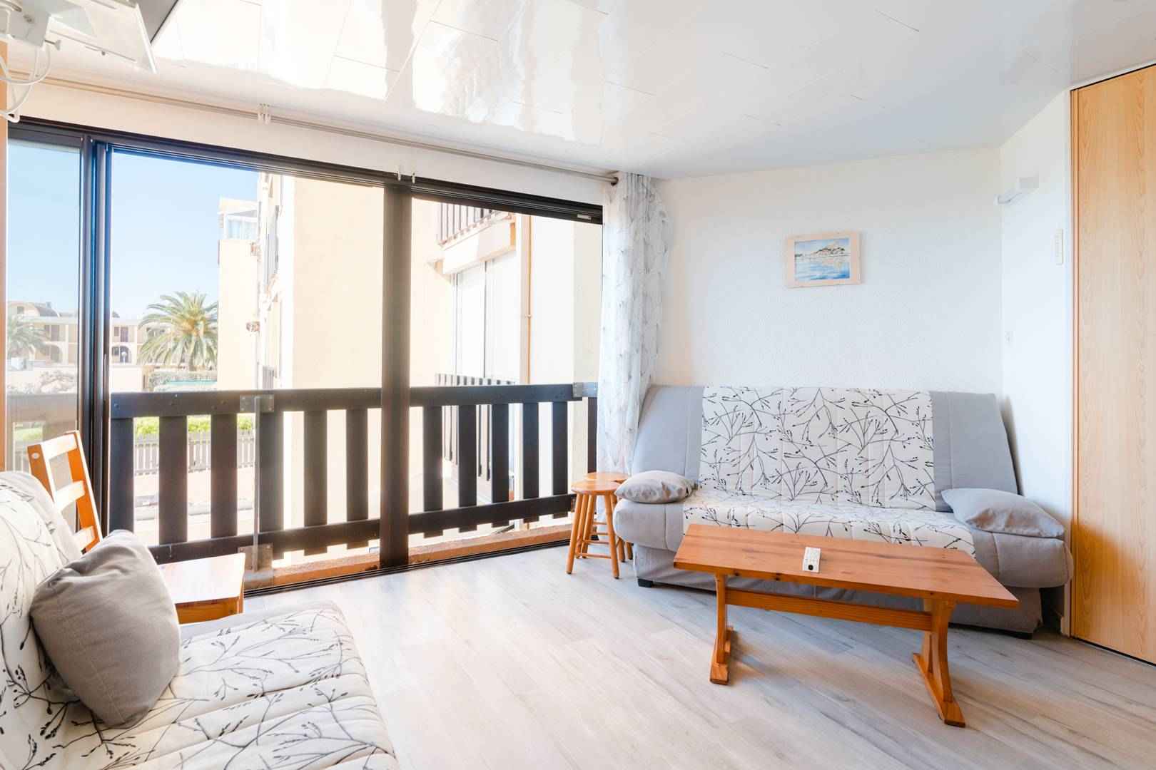 l'appartement est constitué d'une agréable et lumineuse pièce à vivre (grandes baies vitrées à galandages), avec un canapé, un canapé-lit (140x190cm),