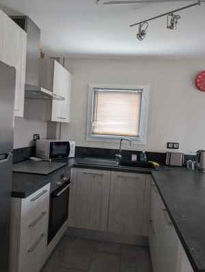 La cuisine est entièrement équipée (grand réfrigérateur avec congélateur, lave-vaisselle, micro-ondes, plaques de cuisson à induction, hotte aspirante, machine à café Dolce Gusto, lave-linge, et ouverte sur l’espace salon équipé d’un canapé, table basse et TV écran plat (chaines françaises).