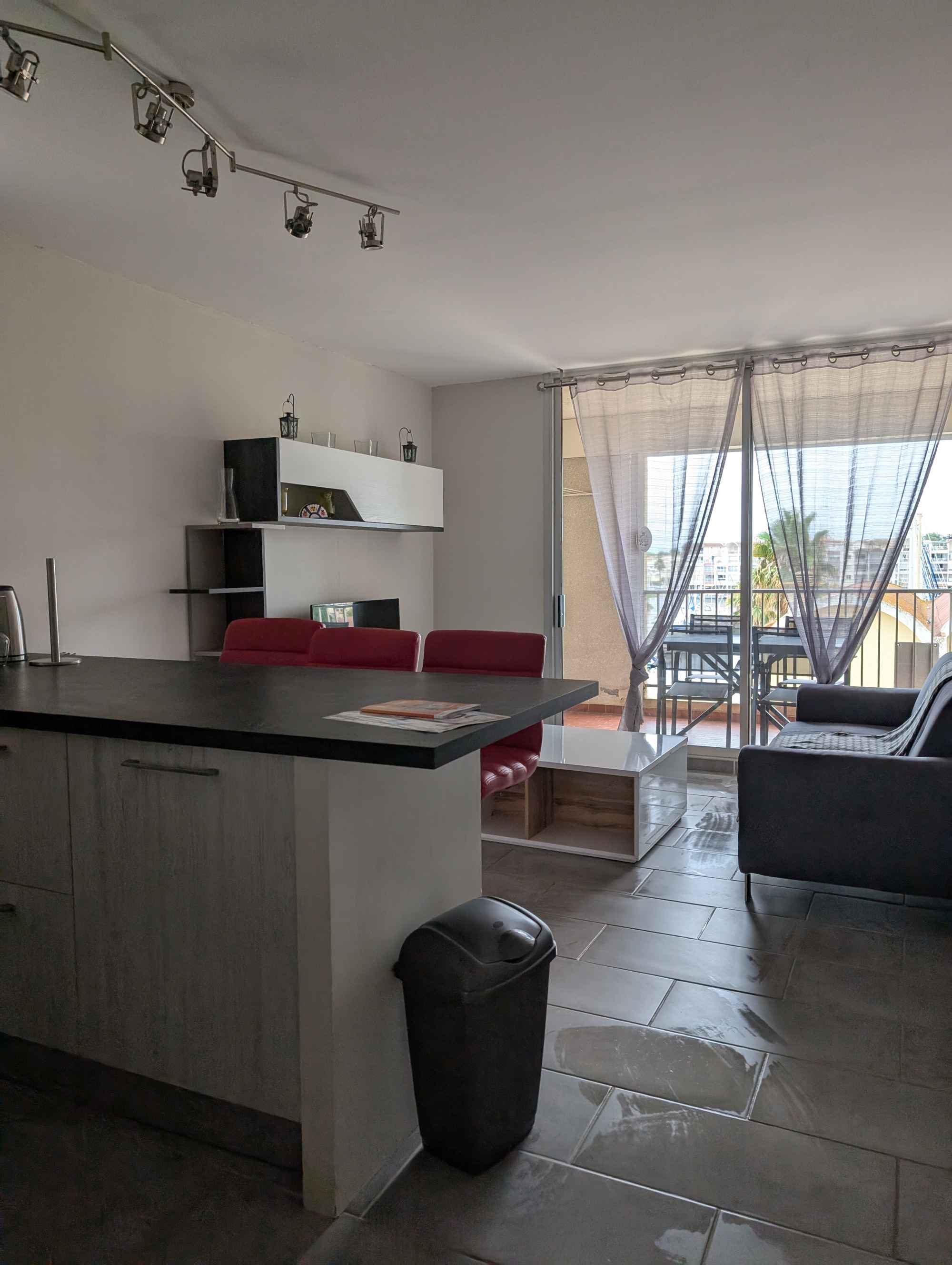 Salle d’eau avec douche à l’italienne, lavabo et placards de rangement puis WC séparés. L’espace cuisine-salon est ouvert sur une loggia avec table et vue sur le port.