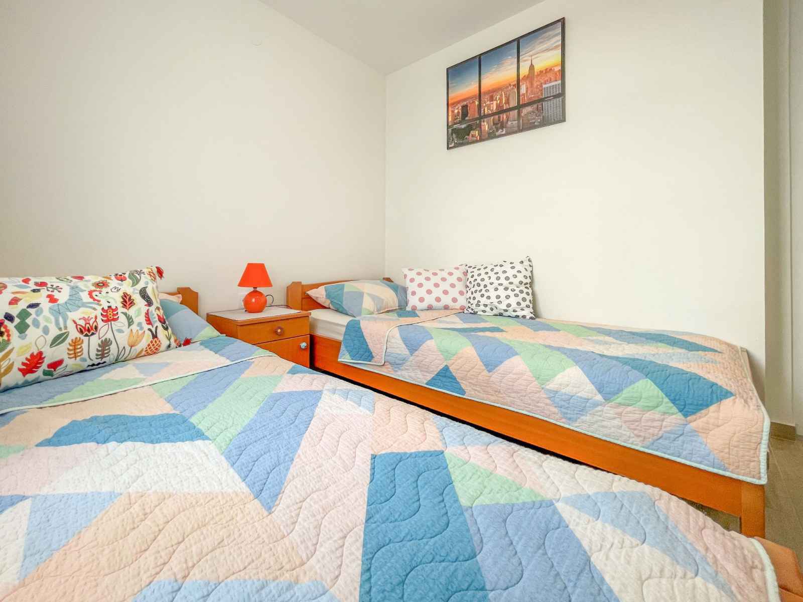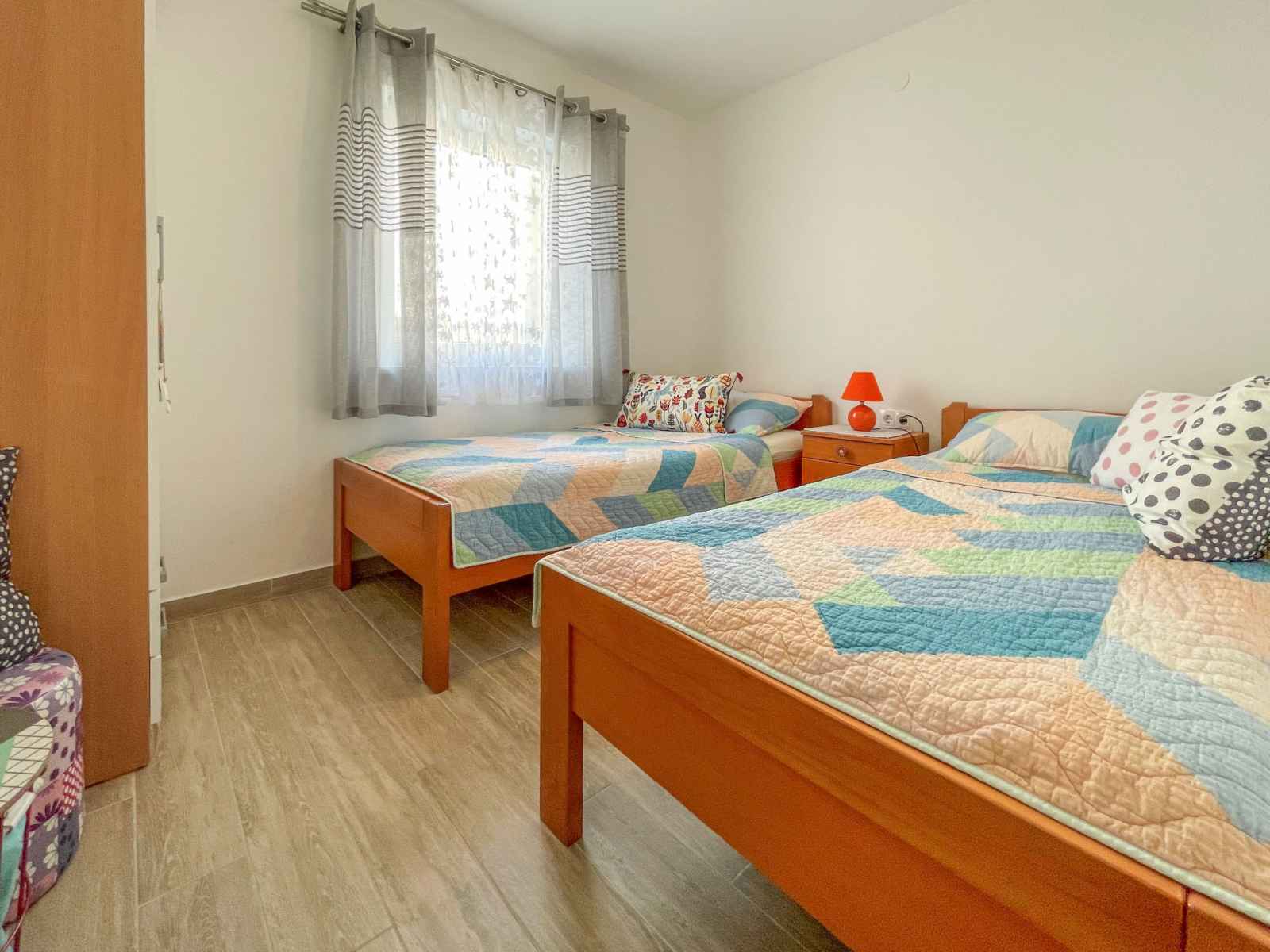 Apt 3 pièces 60 m2 au 1er étage, situation sud. logement idéal pour 2 adultes + 2 enfants. aménagement confortable: séjour/salle à manger avec tv (satellite) et air-conditionné. sortie sur la terrasse. 1 chambre avec 1 grand-lit (160 cm, longueur 200 cm). 1 chambre avec 2 lits (90 cm, longueur 200 cm). cuisine ouverte (4 plaques de cuisson,