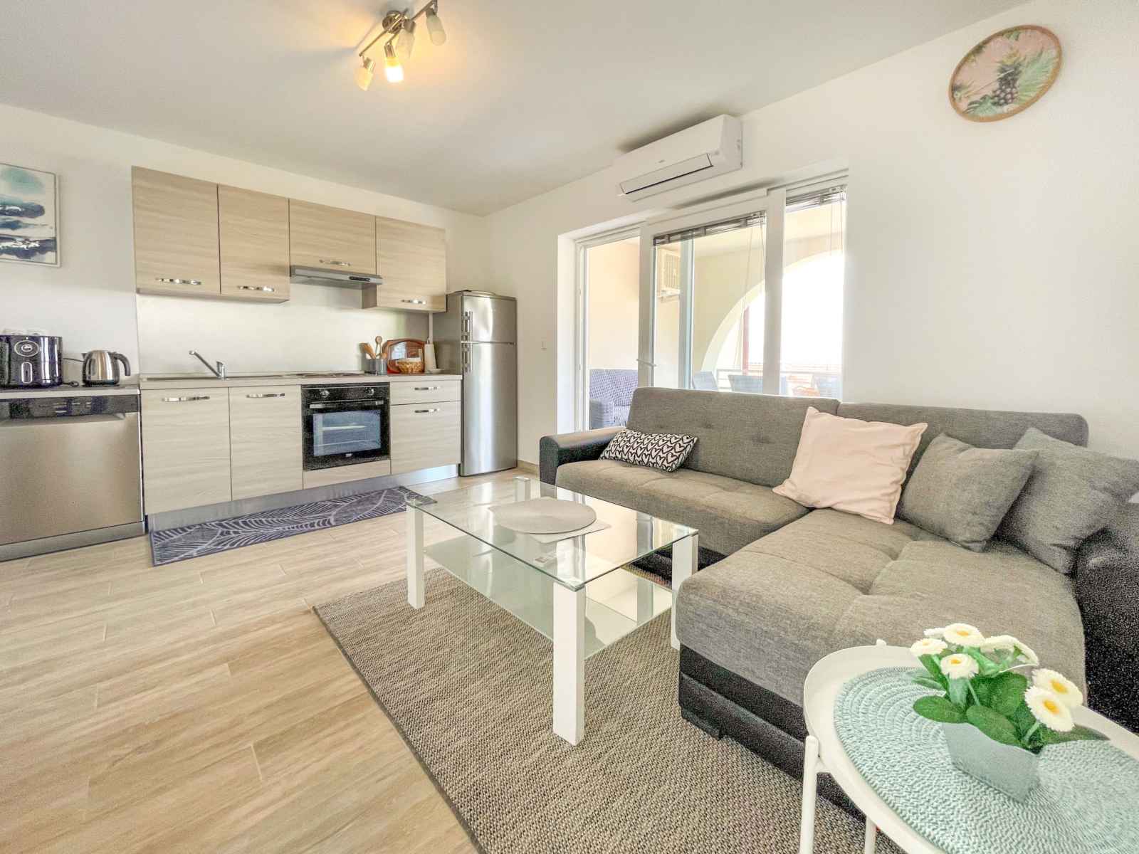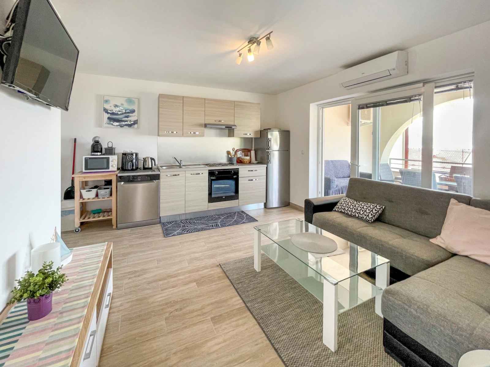four, lave-vaisselle, grille-pain, bouilloire électrique, micro-ondes, congélateur, cafetière électrique). Douche/WC. Pas de chauffage. Terrasse 16 m2, couverte. Meubles de terrasse. Belle vue sur la mer. A disposition: lave-linge. Internet (Connexion WIFI, gratuit). Place de parking (1 Voiture). Adapté(e) aux familles. Occupation maximale: 2 adultes, 2 enfants de moins de 17 ans.