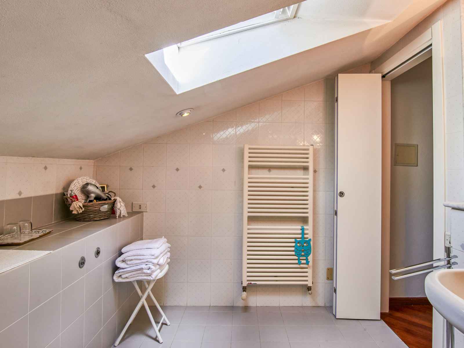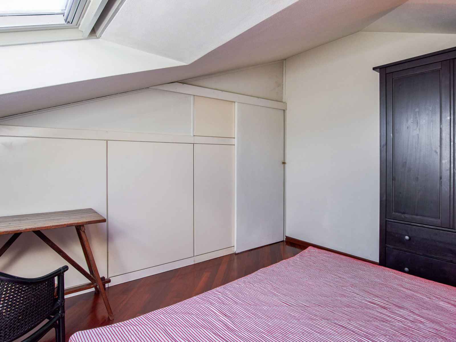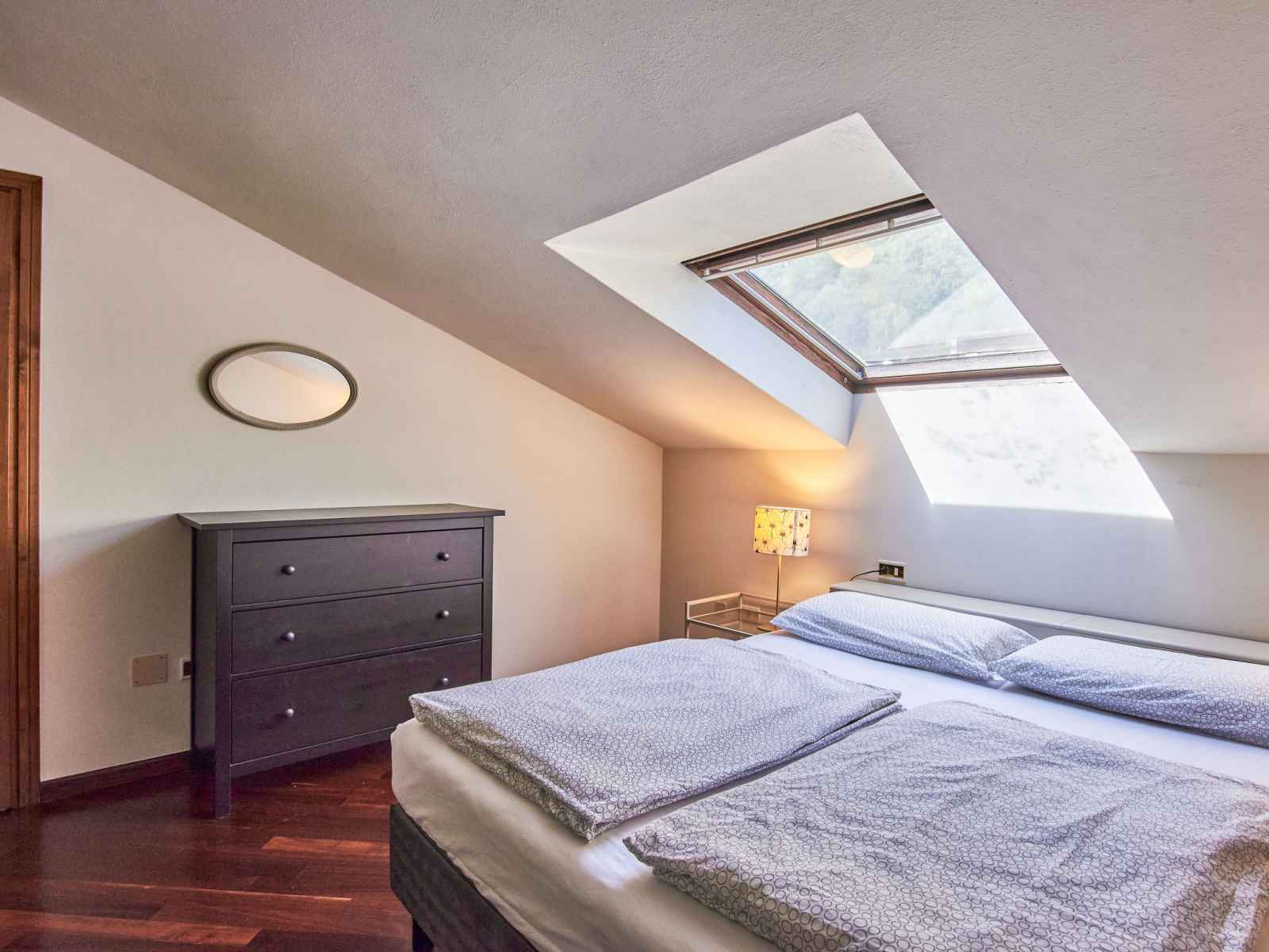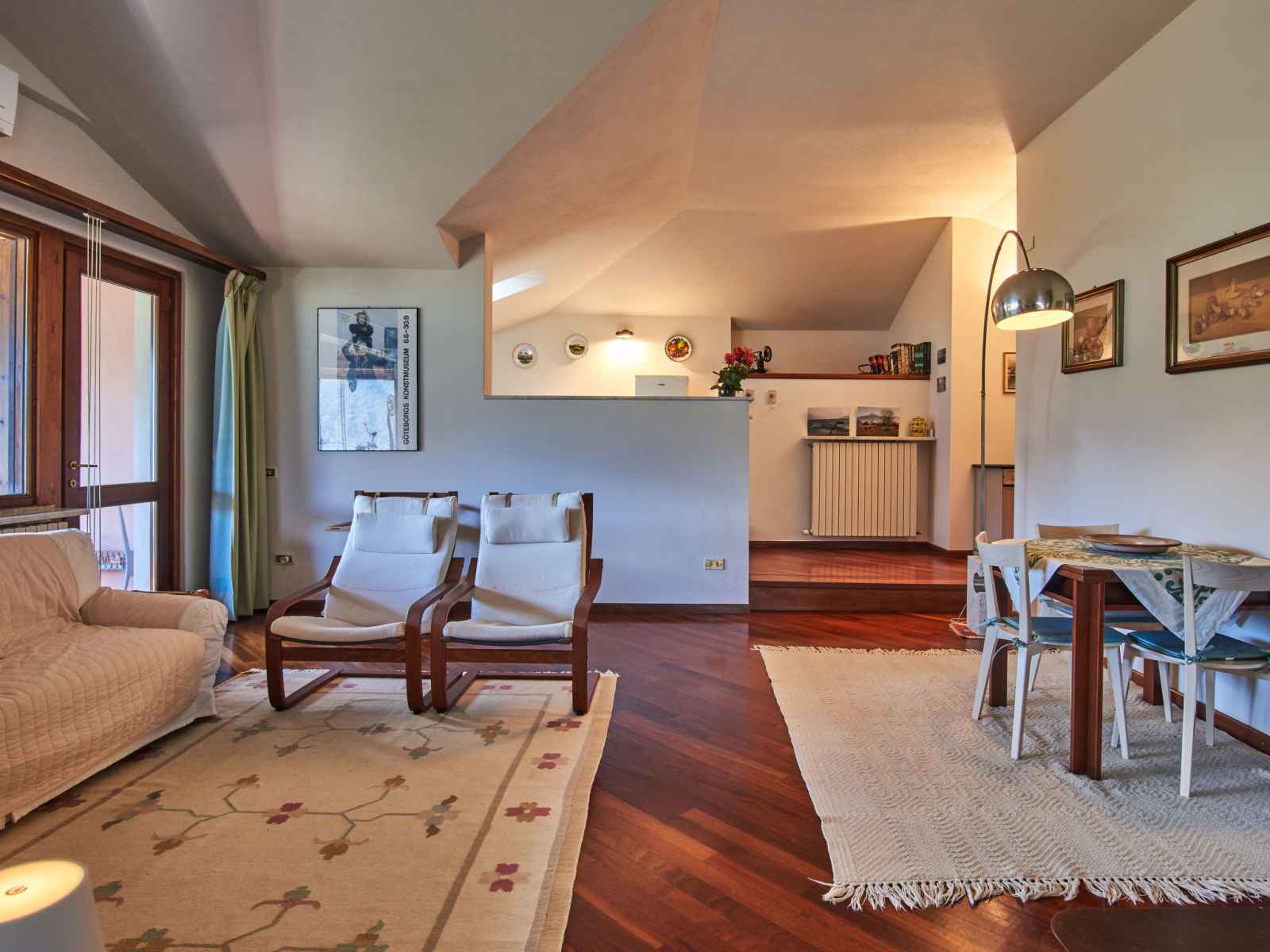 Apt 3 pièces 85 m2, sous le toit, situation sud. partiellement mansardé, aménagement agréable: séjour/chambre à coucher avec baie vitrée avec 1 lit, table pour les repas et radio. sortie sur le balcon. 2 chambres doubles. coin cuisine (4 plaques de cuisson, four, lave-vaisselle, micro-ondes, cafetière électrique). douche/wc. chauffage au