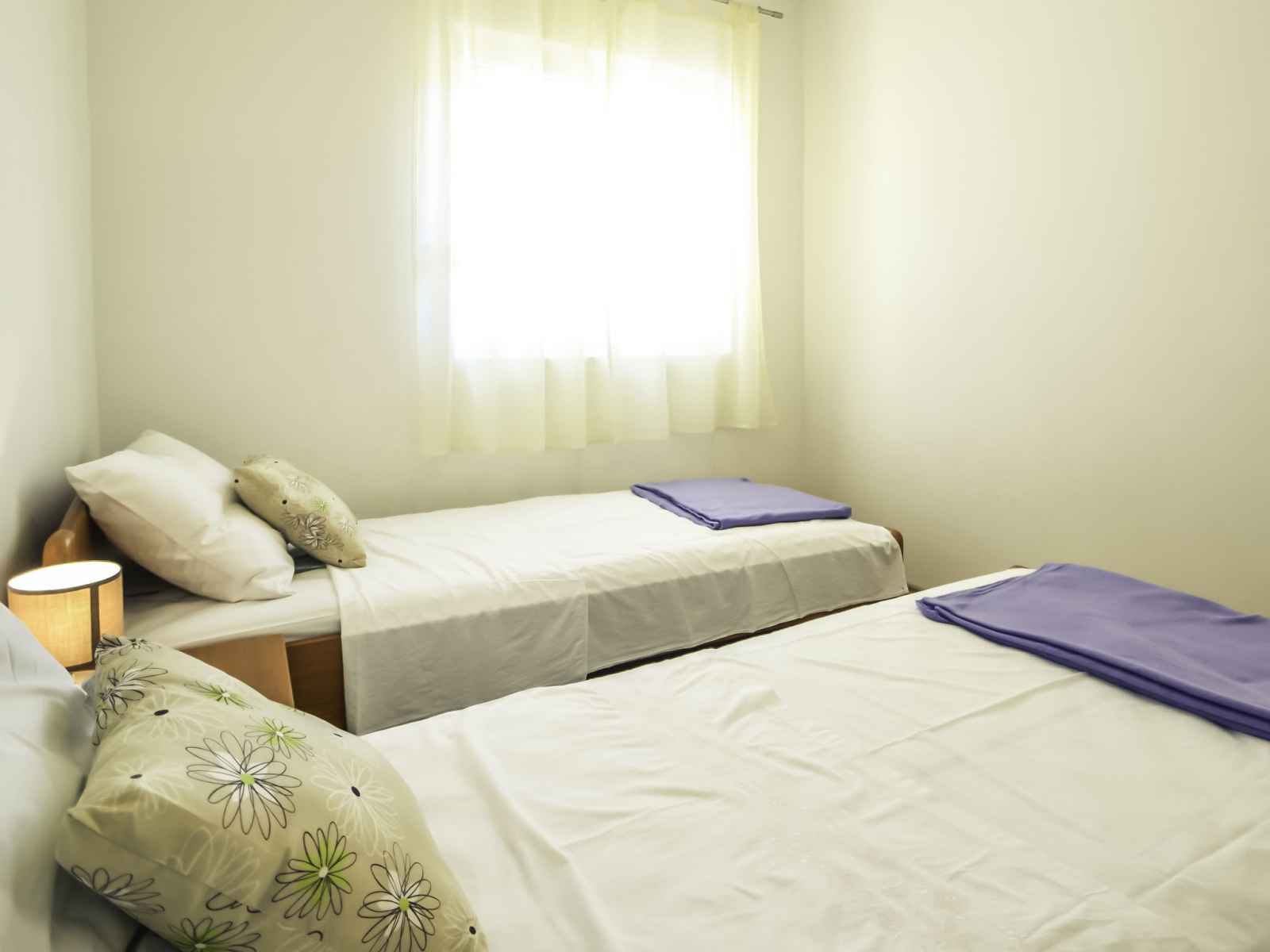 Apt 3 pièces 50 m2, rez-de-chaussée surélevé, situation sud-ouest. séjour/salle à manger 24 m2 avec tv (satellite) et air-conditionné. sortie sur la terrasse. 1 chambre avec 1 lit double (2 x 80 cm, longueur 200 cm). 1 chambre avec 2 lits (80 cm, longueur 200 cm). cuisine ouverte (2 plaques de cuisson, micro-ondes, cafetière électrique)
