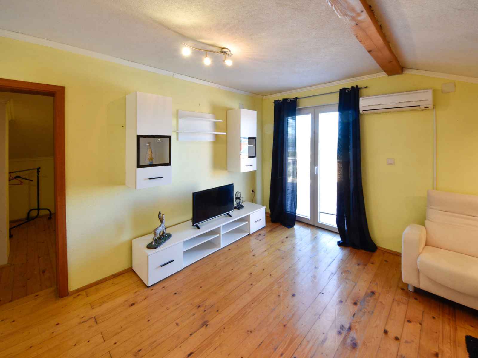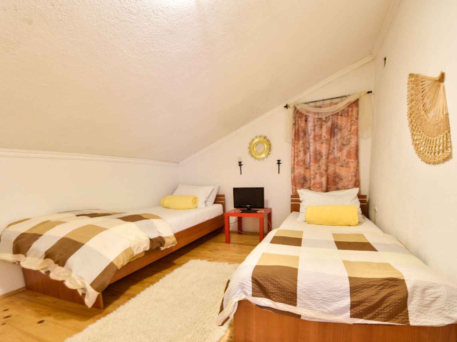 Apt 3 pièces 80 m2 au 1er étage, situation sud-ouest. séjour/salle à manger 24 m2, mansardé hauteur plafond 120 - 250 cm avec tv (satellite) (écran plat), air-conditionné. sortie sur la terrasse. 1 chambre avec 1 lit double (2 x 90 cm, longueur 200 cm). 1 chambre mansardée hauteur plafond 120 - 250 cm avec 2 lits (90 cm, longueur 200 cm).