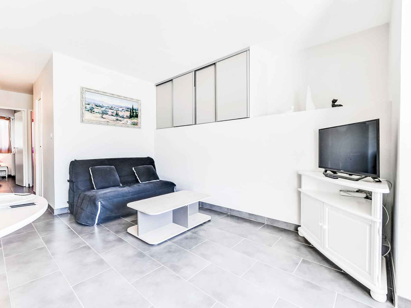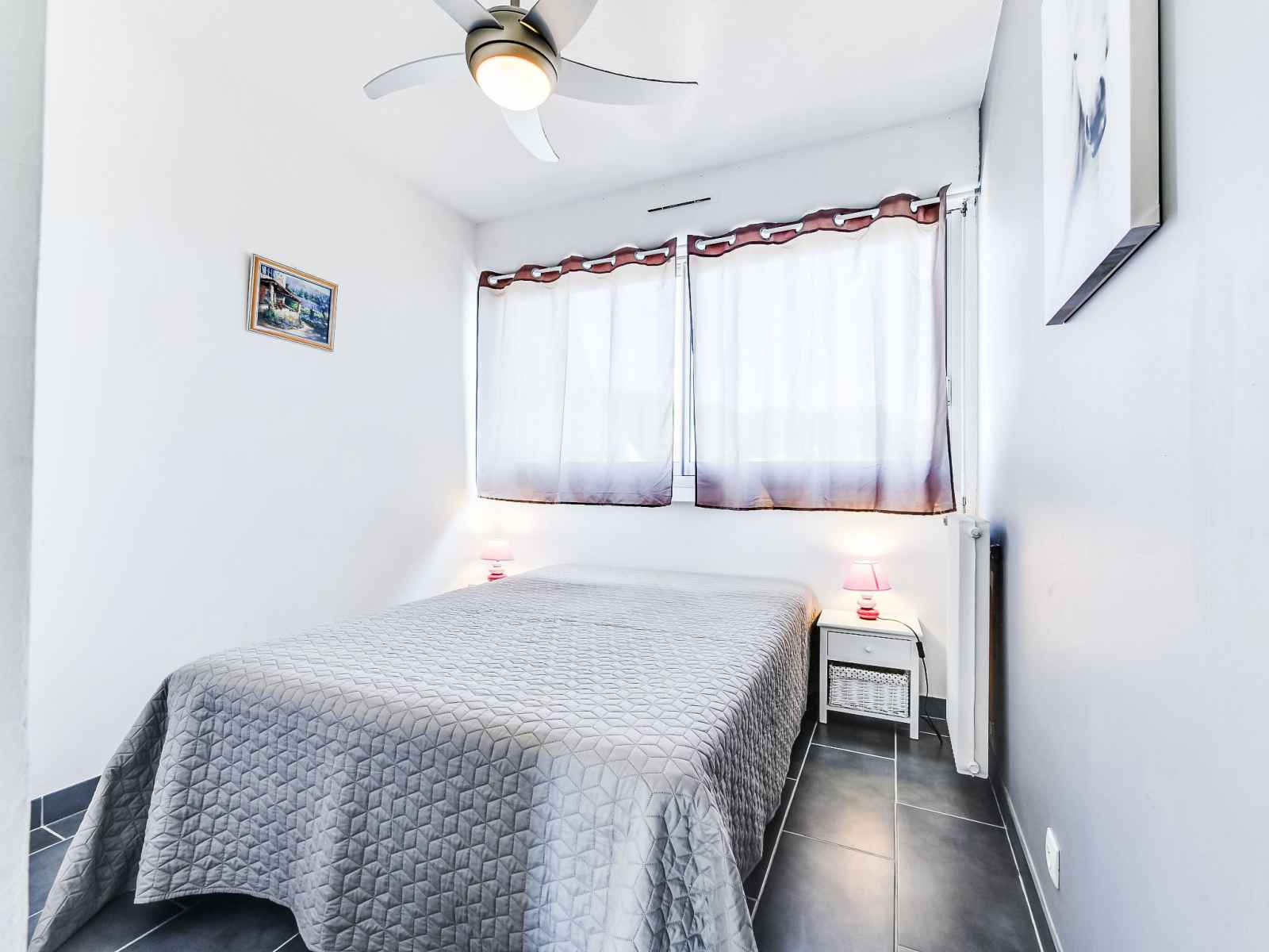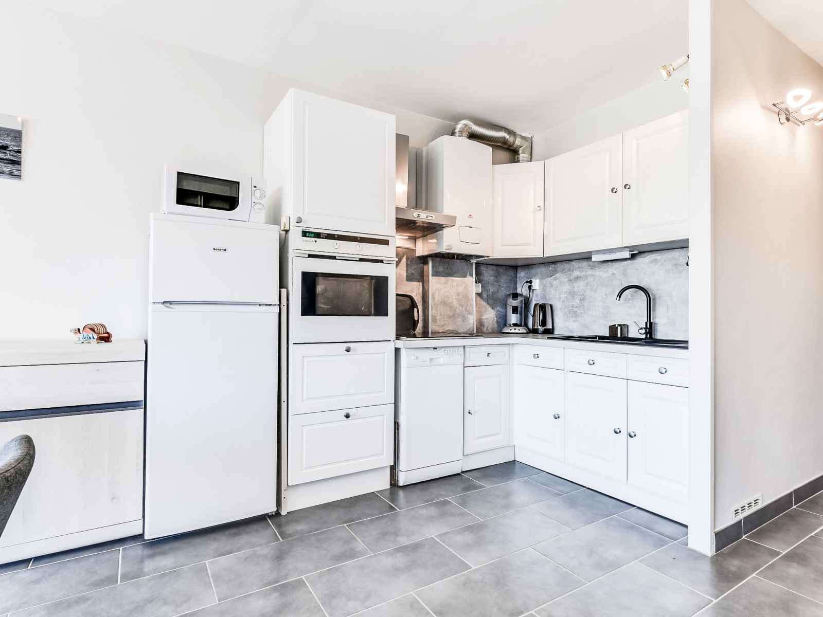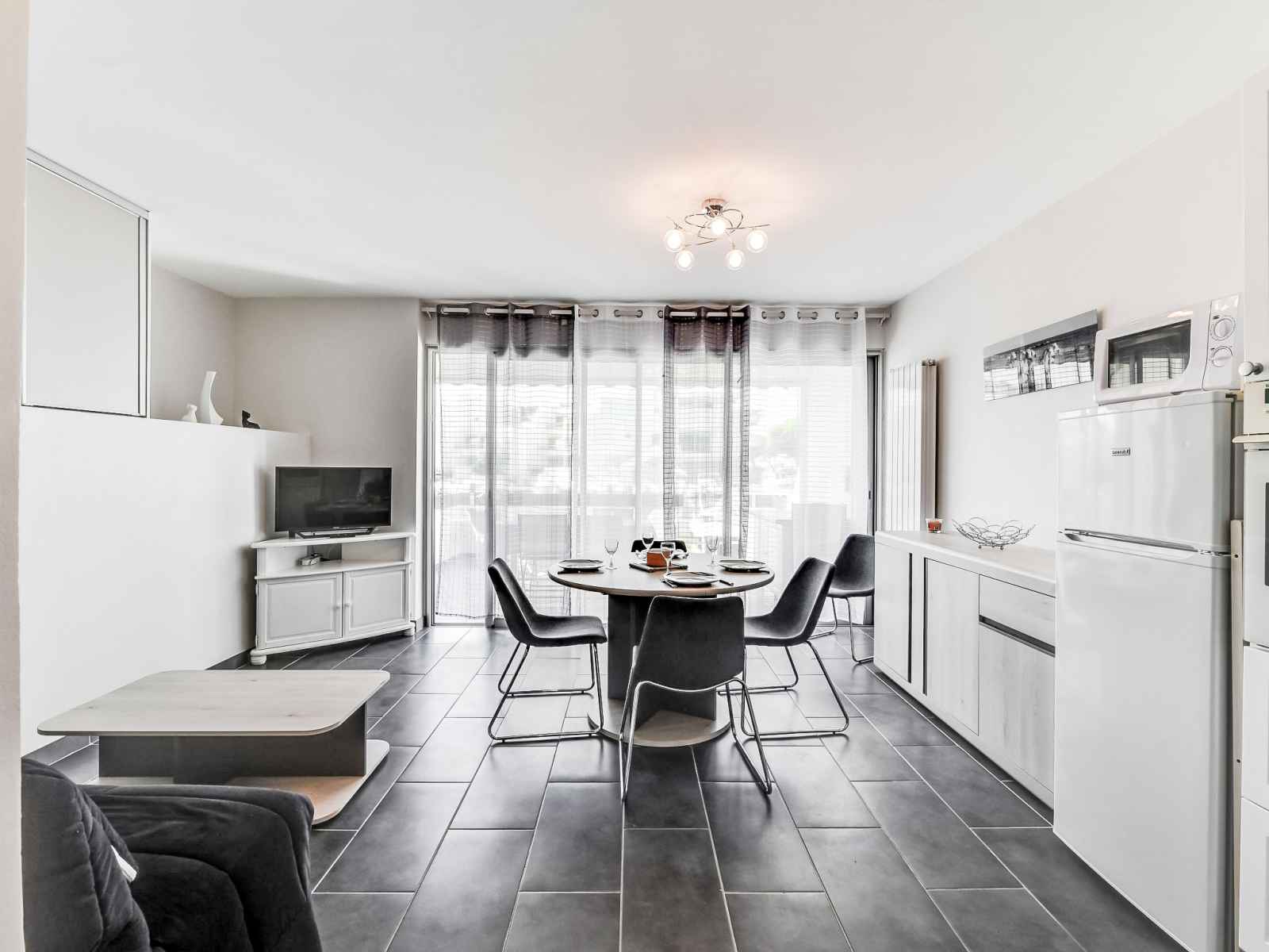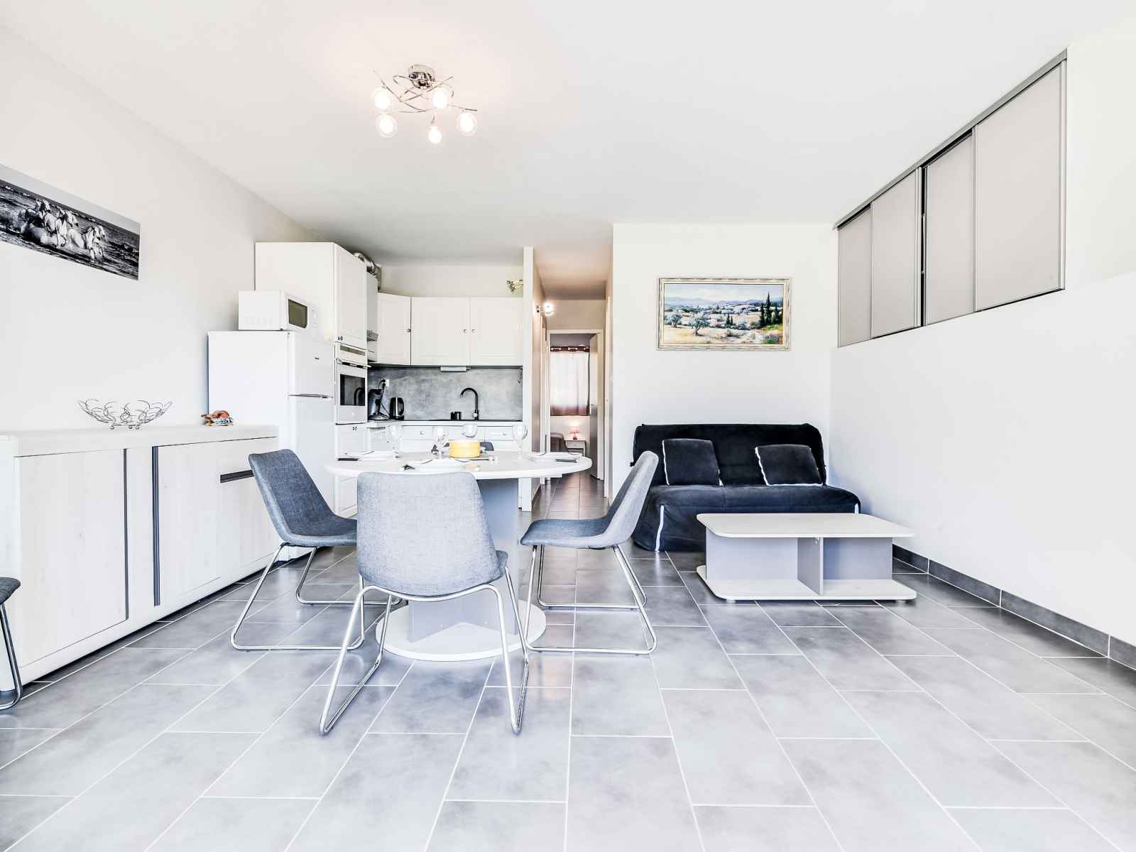 Apt 3 pièces 46 m2, au rez-de-chaussée. aménagement agréable: séjour/salle à manger avec tv et air-conditionné. 1 chambre avec 1 grand-lit (140 cm, longueur 200 cm), ventilateur. 1 chambre avec 1 x 2 lits superposés (90 cm, longueur 180 cm). coin cuisine (four, lave-vaisselle, 3 plaques à induction, micro-ondes, congélateur). douche, wc