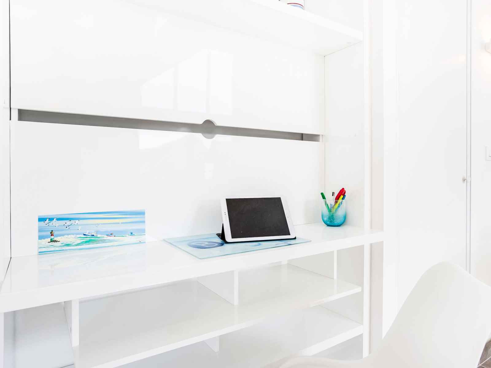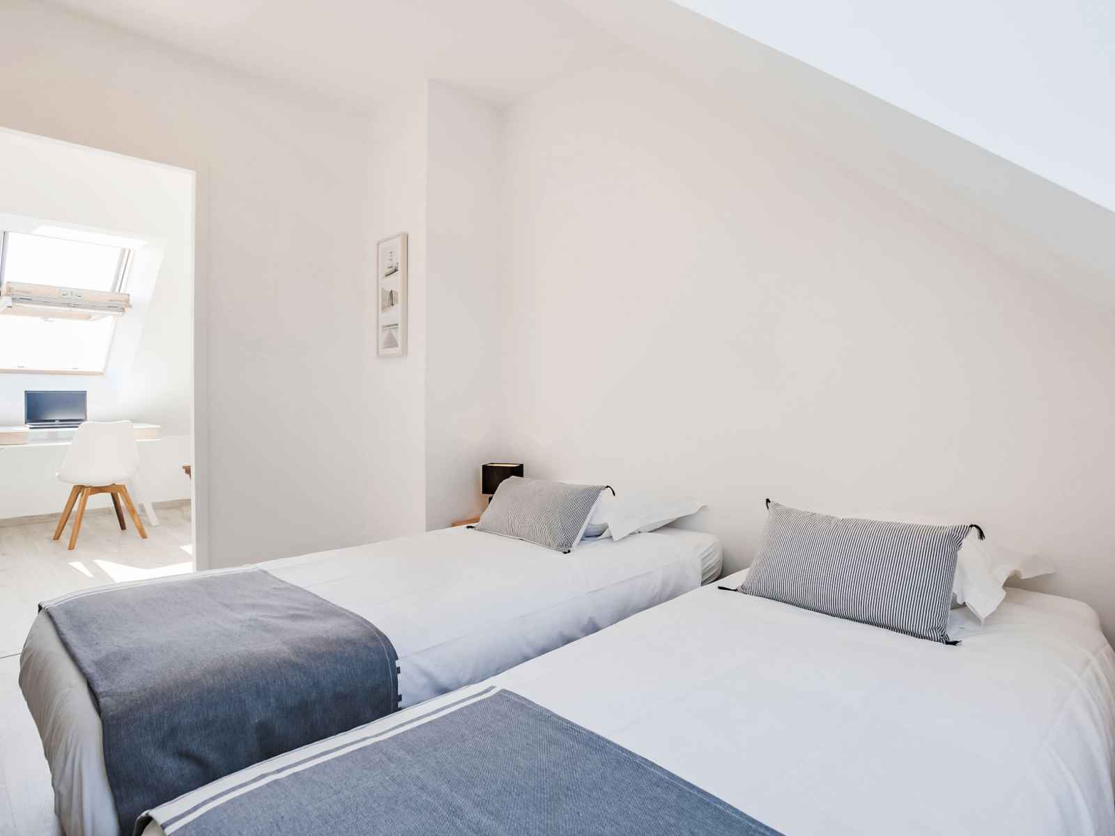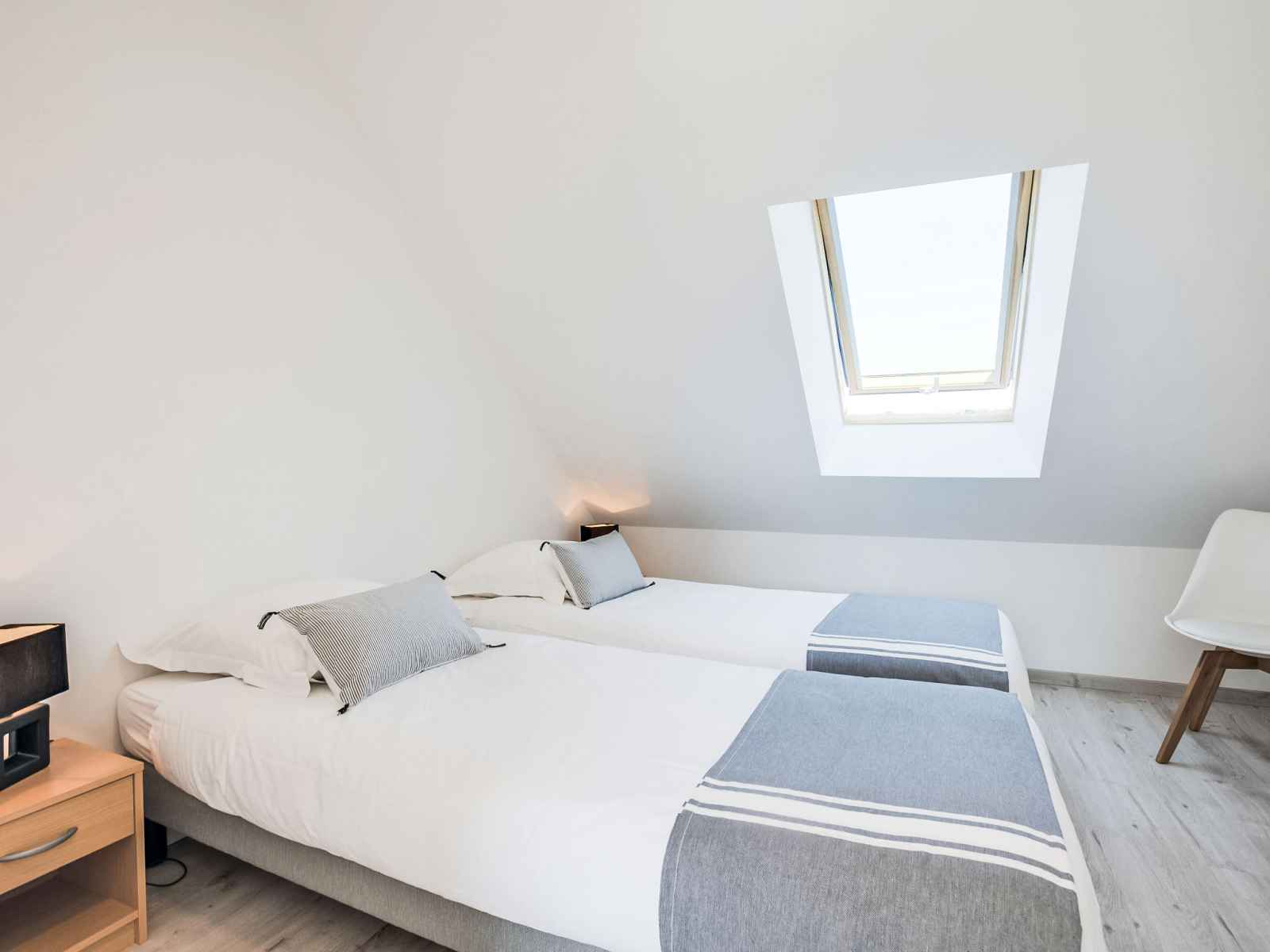 terrasse. Douche, WC séparé. Chauffage au gaz. À l'étage supérieur: 1 chambre avec 1 grand-lit (1 x 160 cm, longueur 200 cm), douche/WC. 1 chambre avec 2 lits (80 cm, longueur 200 cm). Grande terrasse 15 m2. Meubles de terrasse. Vue partielle sur la mer. A disposition: lave-linge, sèche-linge, sèche-cheveux. Internet (Connexion WIFI, gratuit). Place de parking No 25, garage (1 Voiture). Veuillez noter: détecteur de fumée. 56186 000716 JS