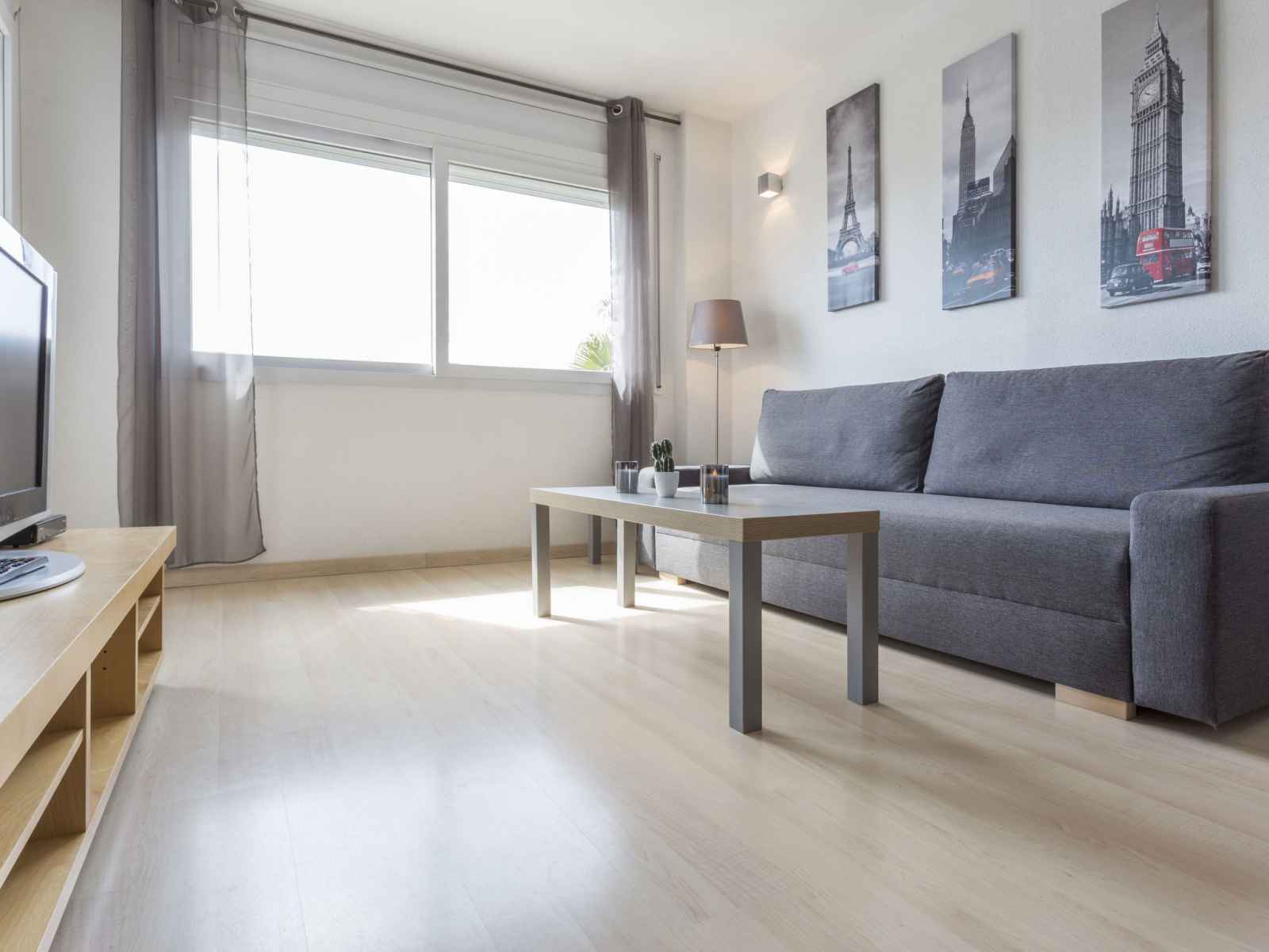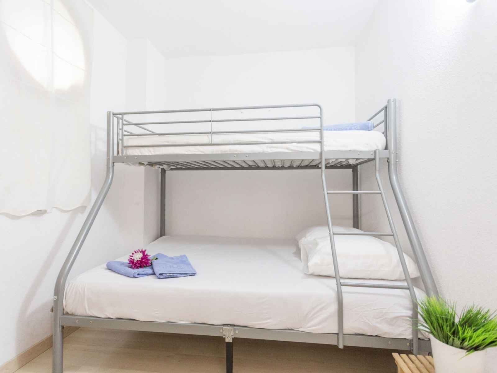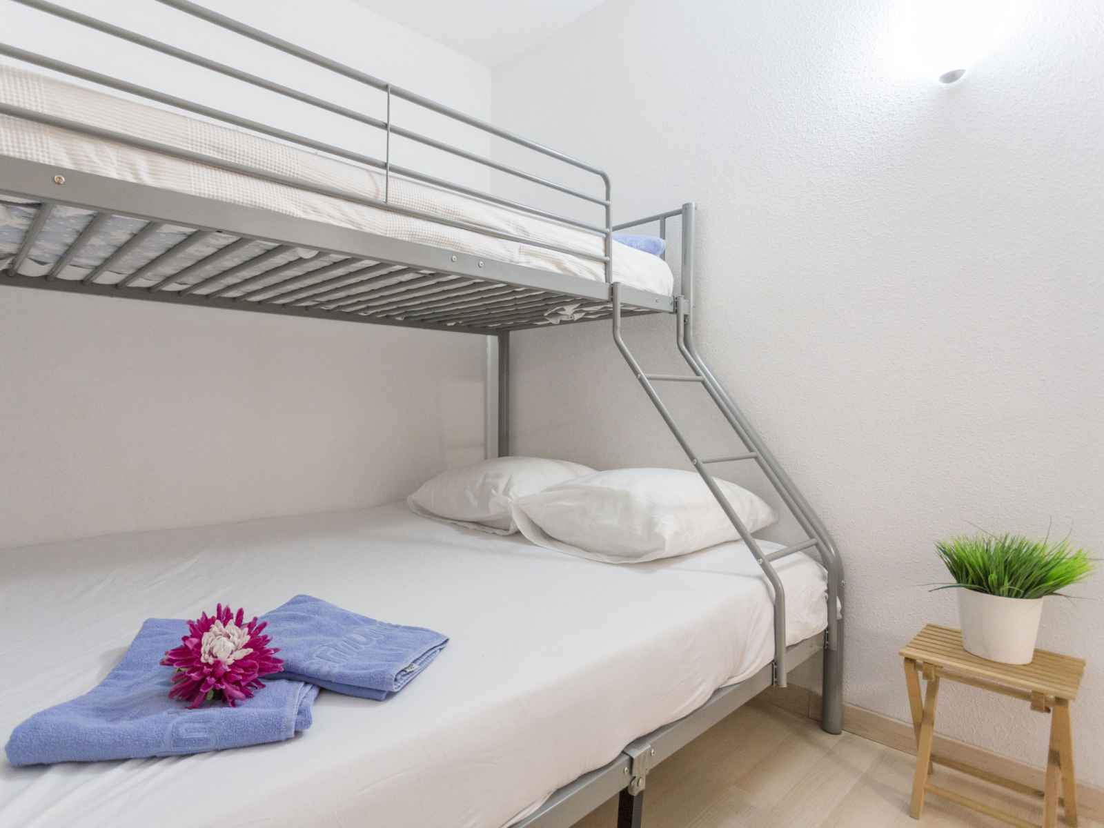 Apt 3 pièces 45 m2, situation sud-est. aménagement confortable: séjour/salle à manger avec 1 divan-lit double (140 cm, longueur 190 cm), tv (satellite) et ventilateur. 1 chambre avec 1 grand-lit (140 cm, longueur 190 cm). sortie sur le balcon. 1 chambre avec 2 lits (90 cm, longueur 190 cm), 1 x 1 lits superposés (140 cm, longueur 190 cm). (4