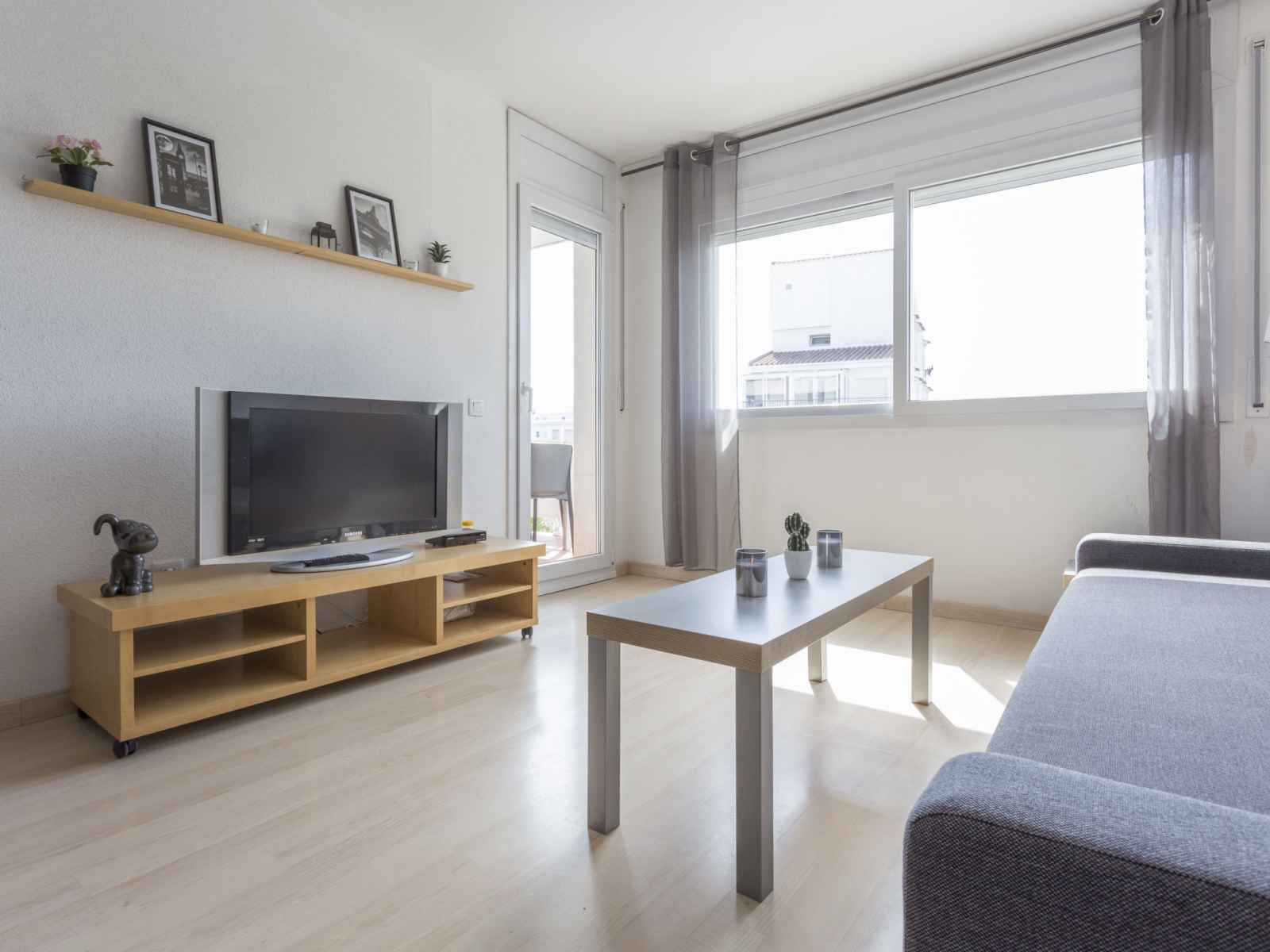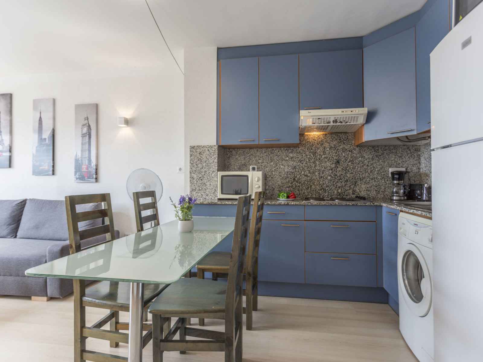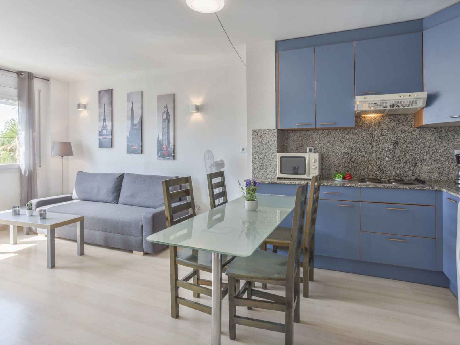 Apt 3 pièces 45 m2, situation sud-est. aménagement confortable: séjour/salle à manger avec 1 divan-lit double (140 cm, longueur 190 cm), tv (satellite) et ventilateur. 1 chambre avec 1 grand-lit (140 cm, longueur 190 cm). sortie sur le balcon. 1 chambre avec 2 lits (90 cm, longueur 190 cm), 1 x 1 lits superposés (140 cm, longueur 190 cm). (4