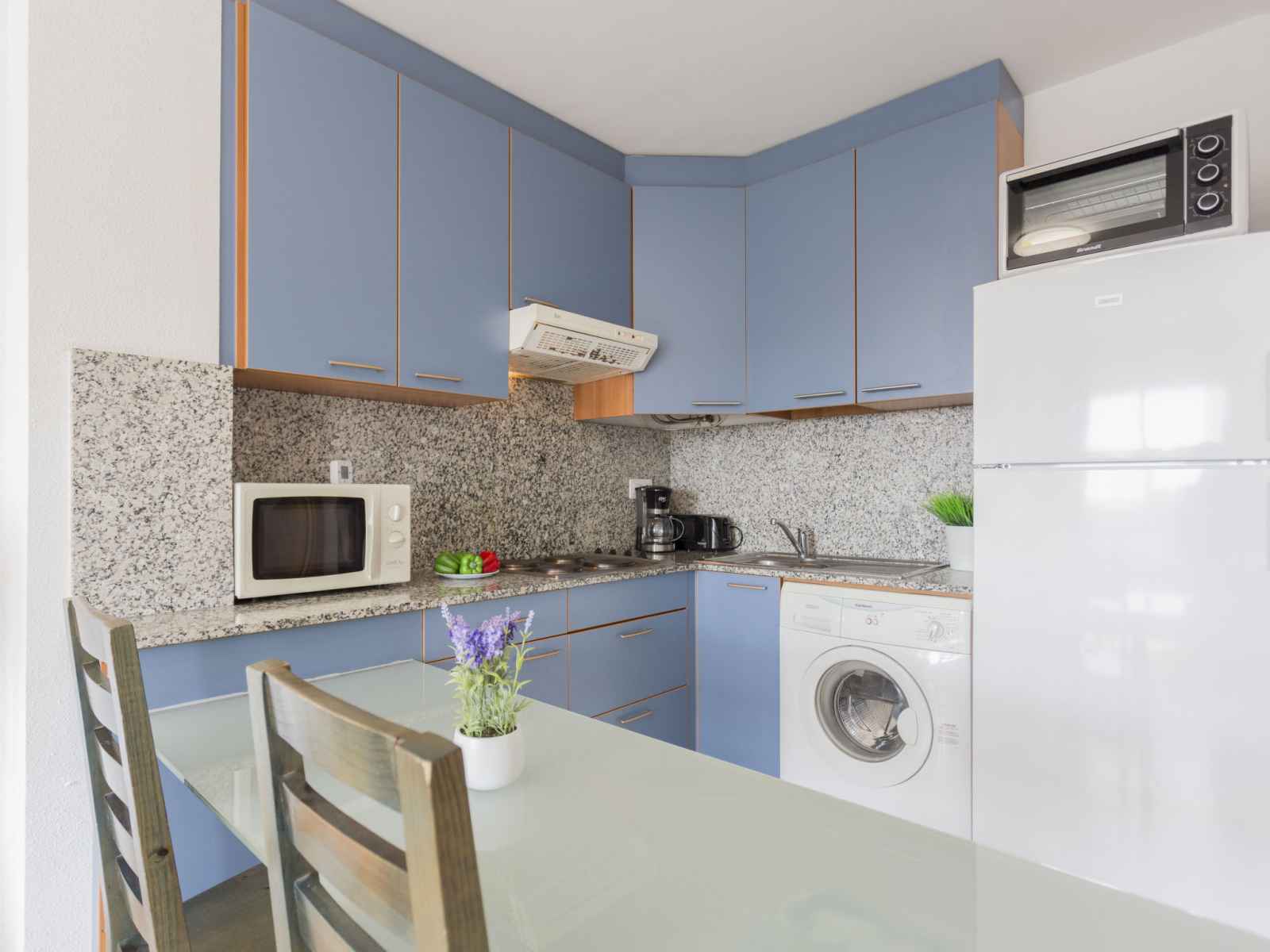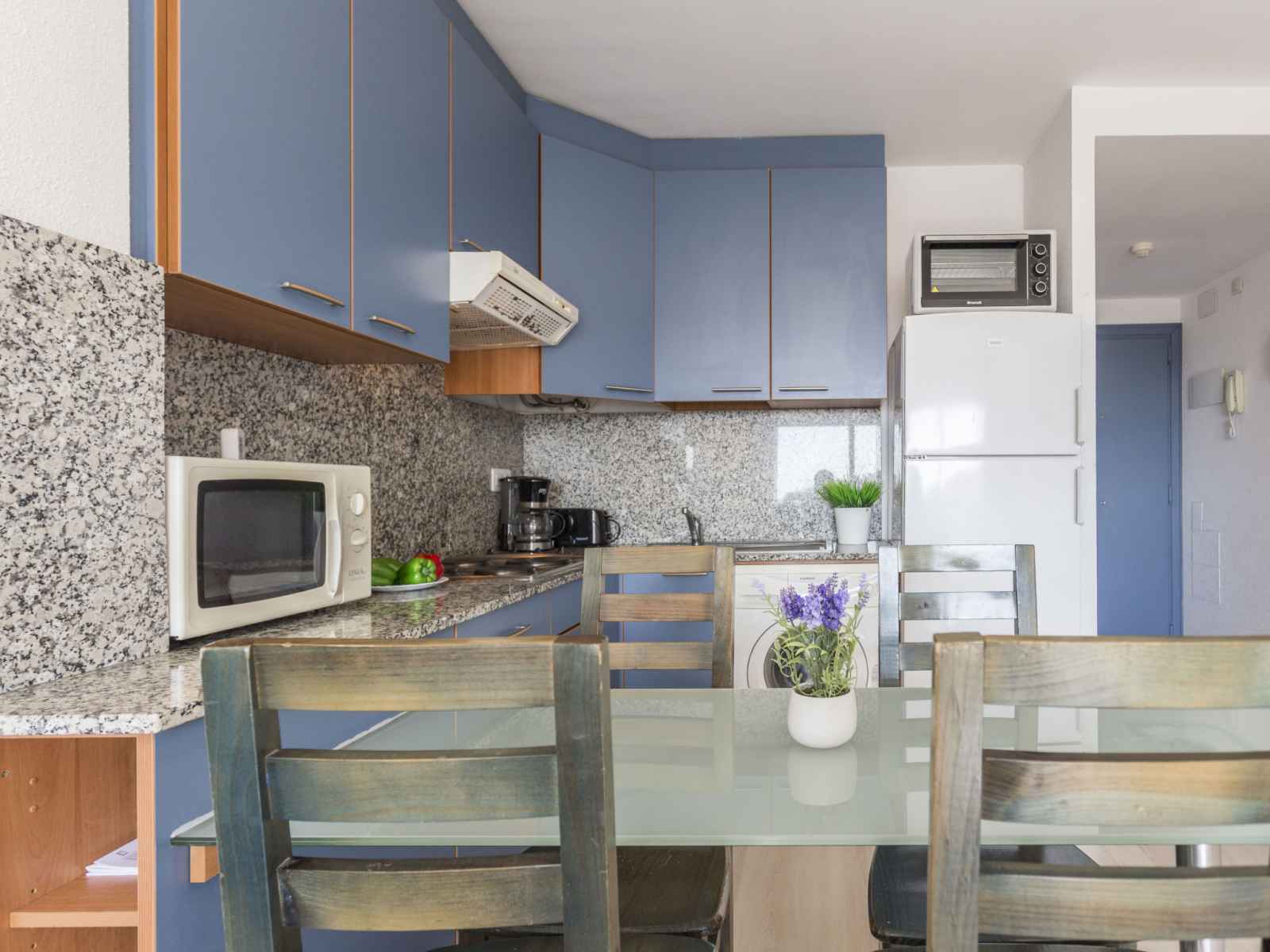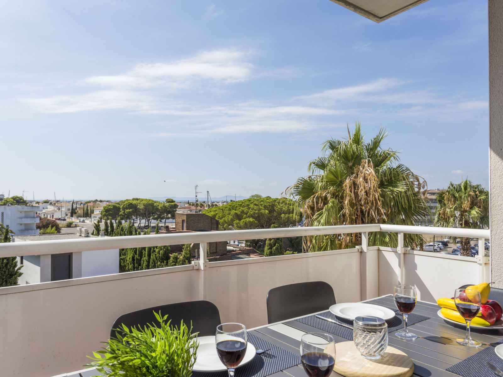 plaques de cuisson, micro-ondes, cafetière électrique) avec table pour les repas, air-conditionné. Bain/WC. Pas de chauffage. Balcon 10 m2, situation sud et situation est. Mobilier de balcon. Vue éloignée sur la mer, les montagnes et la localité. A disposition: lave-linge. Veuillez noter: TV seulement FR. HUTG050304 // Reg. Nr.: ESFCTU000017019000347190000000000000000000HUTG0503044