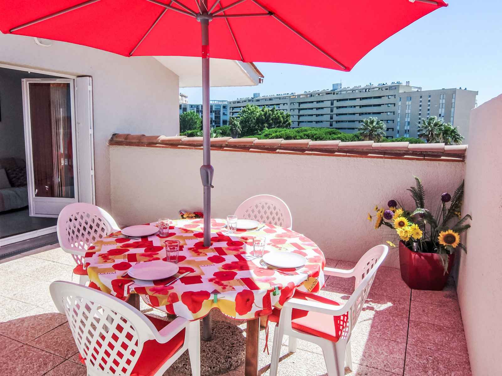 Apt 3 pièces 50 m2 au 3ème étage. aménagement confortable: séjour/salle à manger avec tv, dvd et air-conditionné. sortie sur la terrasse. 1 chambre avec 1 grand-lit (140 cm, longueur 190 cm), air-conditionné. 1 chambre avec 2 lits (90 cm, longueur 190 cm). cuisine ouverte (4 plaques de cuisson, four, lave-vaisselle, micro-ondes,