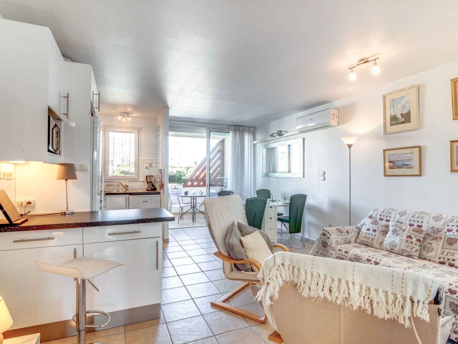 Apt 3 pièces 60 m2, rez-de-chaussée surélevé. séjour/salle à manger avec 1 divan-lit double (140 cm, longueur 190 cm), tv (écran plat), dvd et air-conditionné. sortie sur la terrasse. 1 chambre avec 1 grand-lit (140 cm, longueur 190 cm). sortie sur le balcon. 1 chambre avec 2 lits (90 cm, longueur 190 cm). cuisine ouverte (four,
