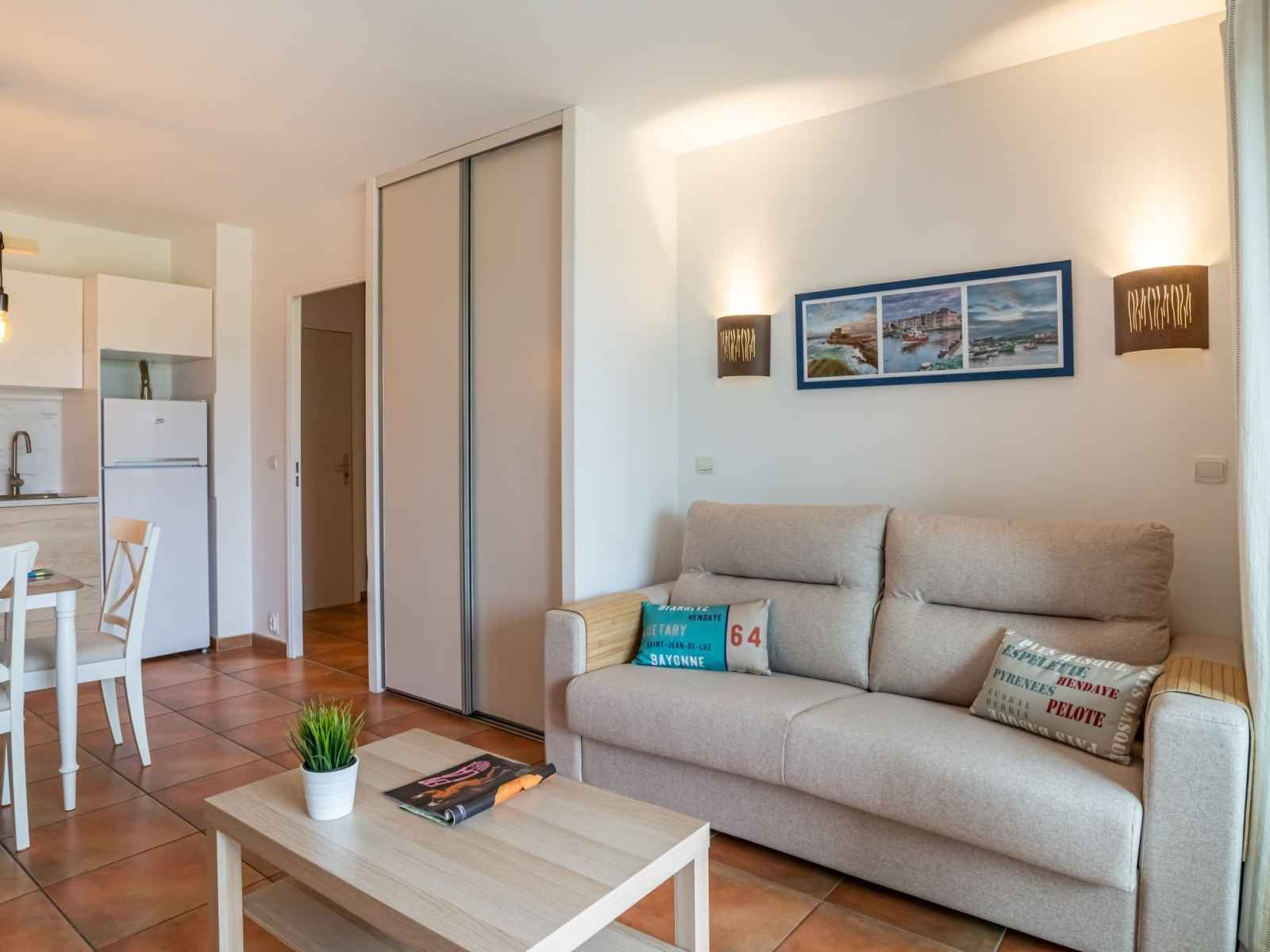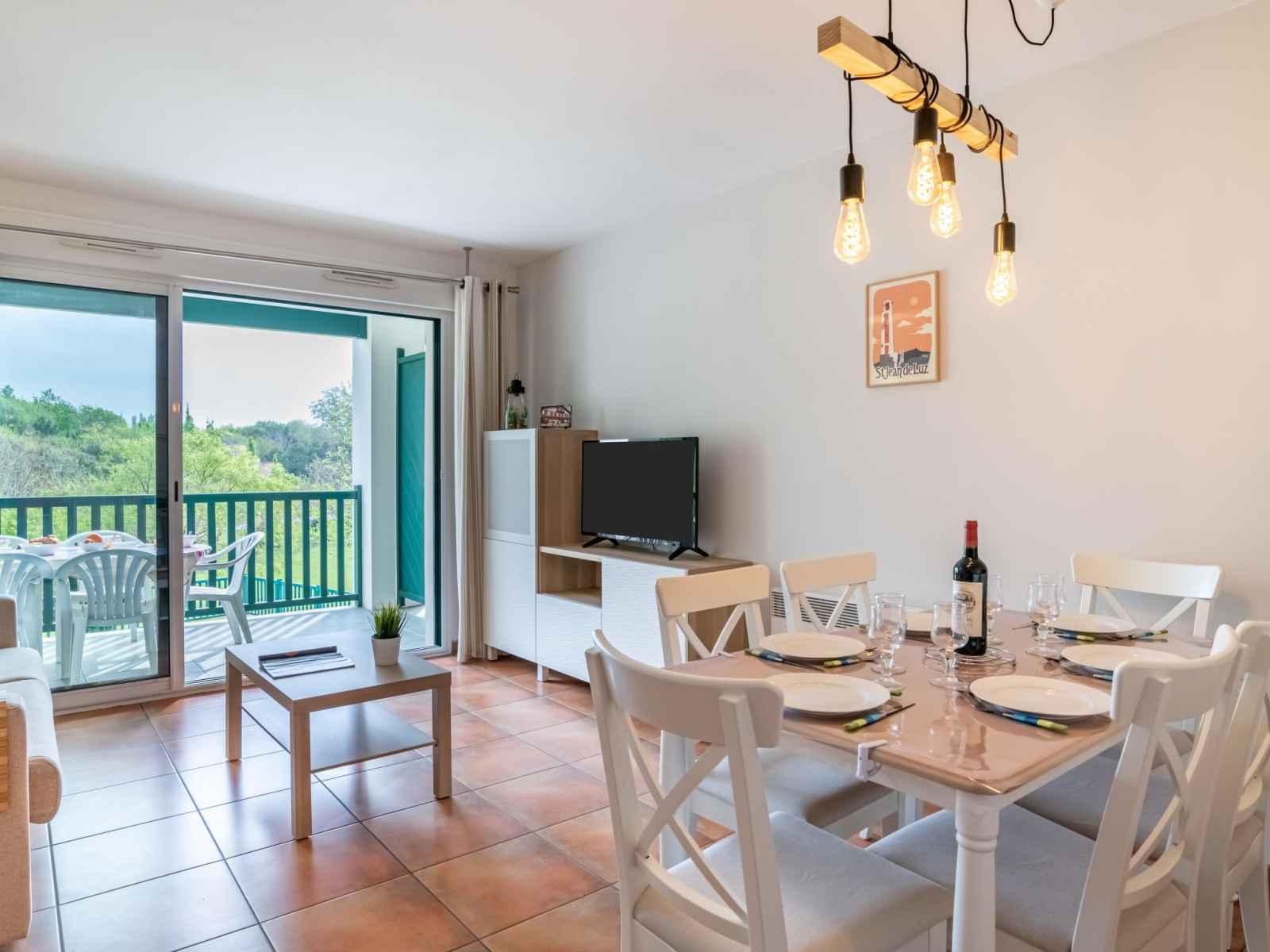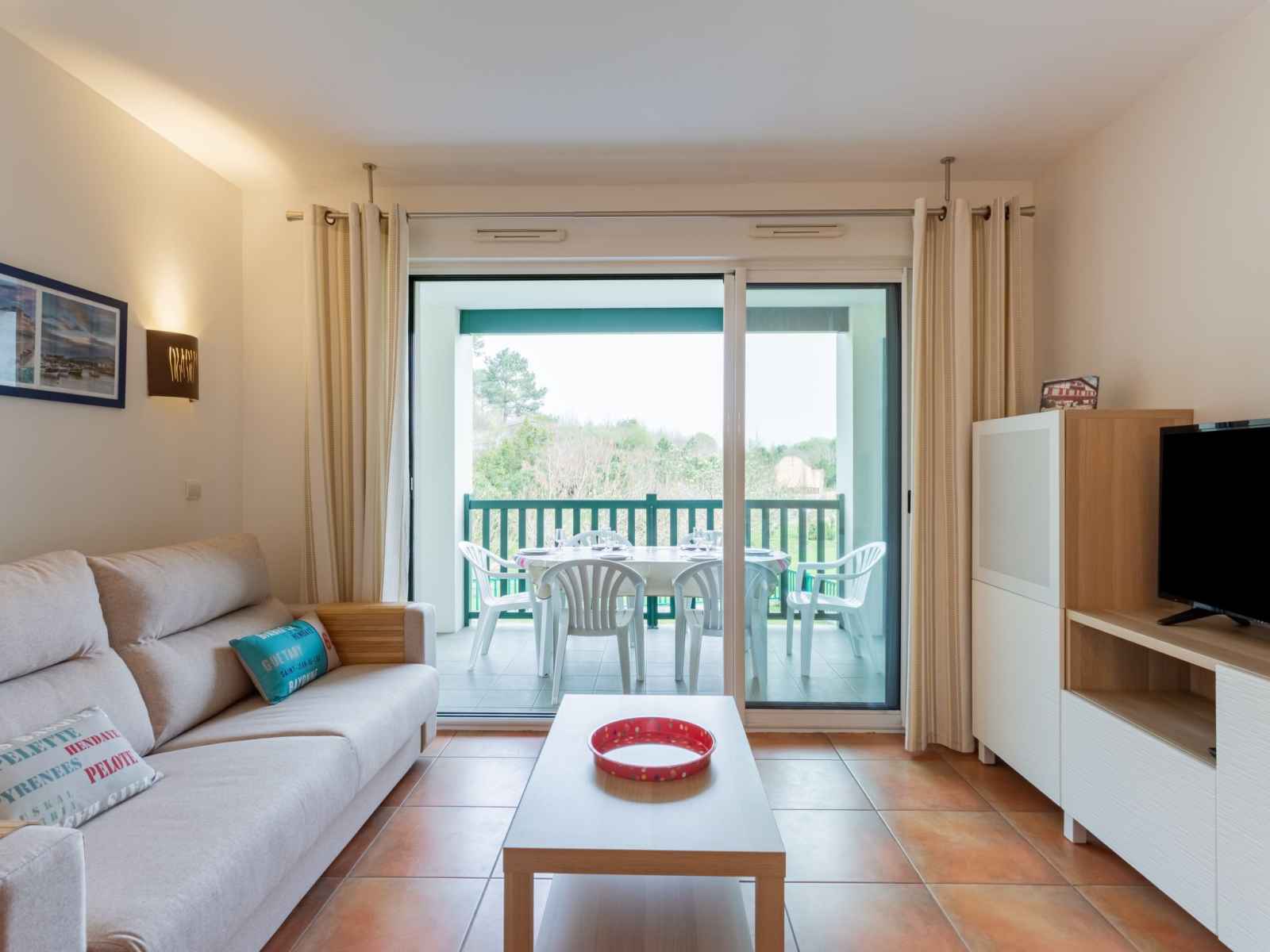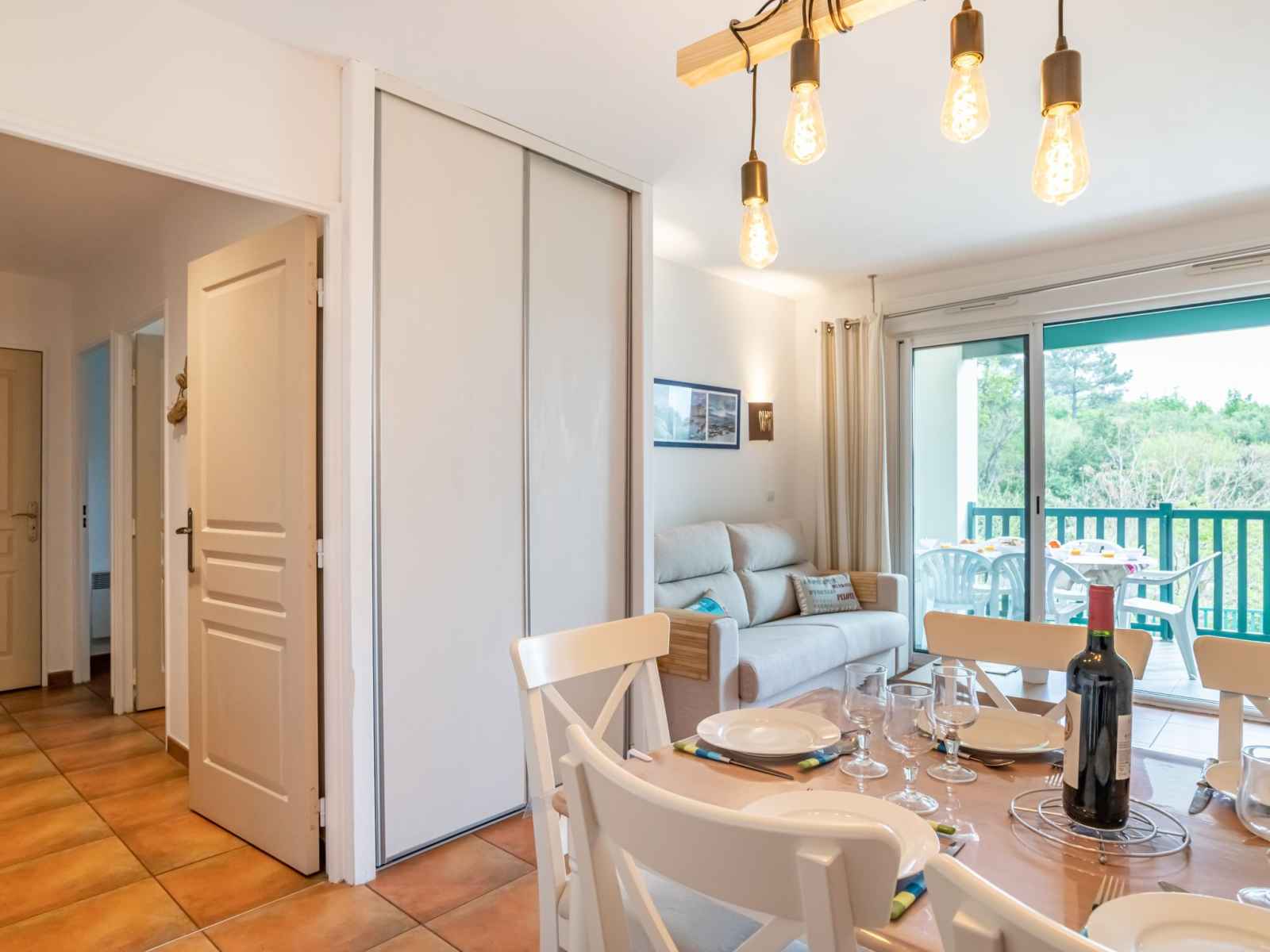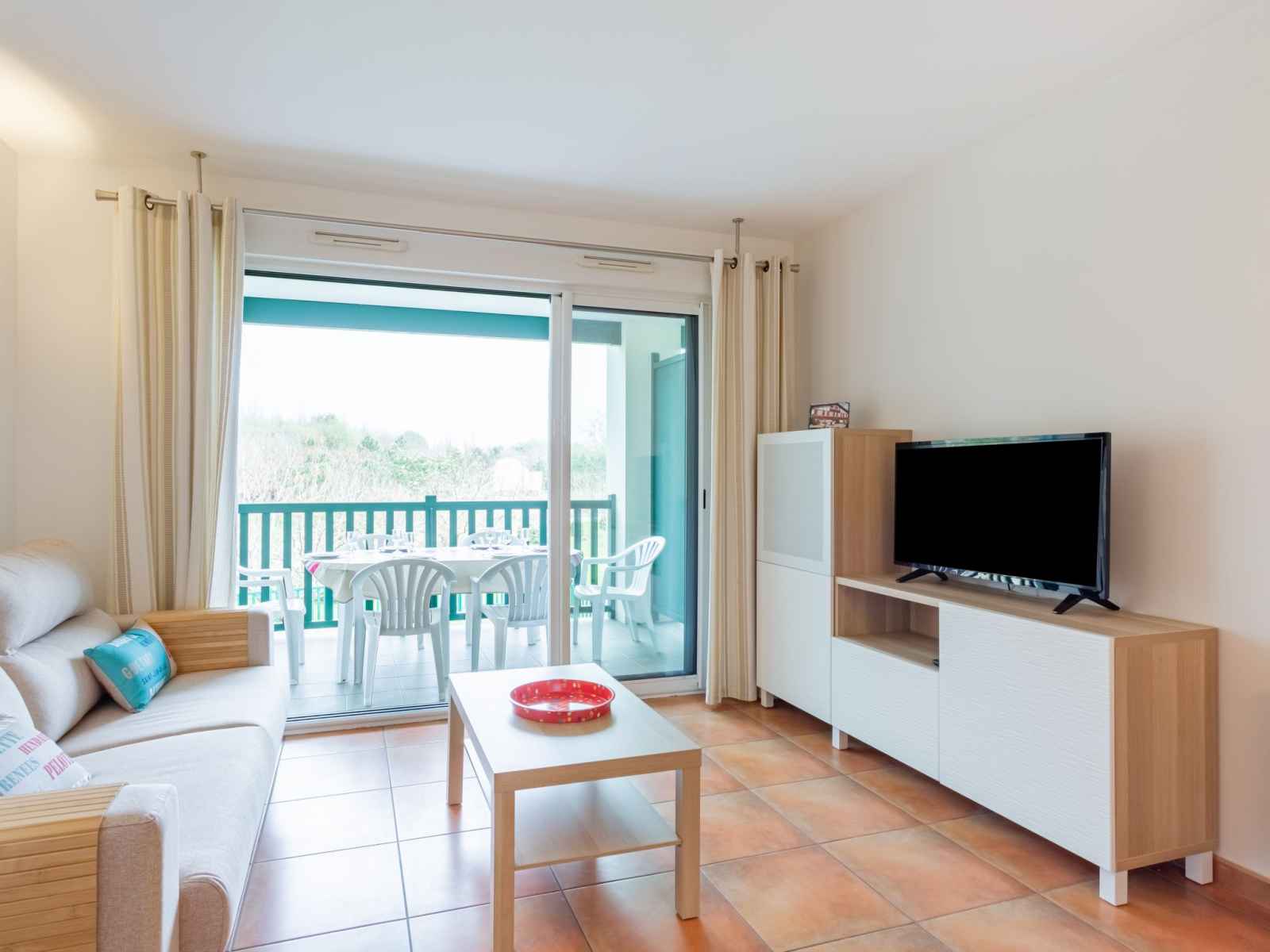 "domaine iratzia", apt 3 pièces 45 m2 au 1er étage. aménagement confortable et agréable: séjour/salle à manger avec 1 divan-lit double (140 cm, longueur 190 cm), tv (écran plat). sortie sur la terrasse. 1 chambre avec 1 grand-lit (1 x 160 cm, longueur 200 cm). sortie sur la terrasse. 1 chambre avec 1 x 2 lits superposés (90 cm, longueur