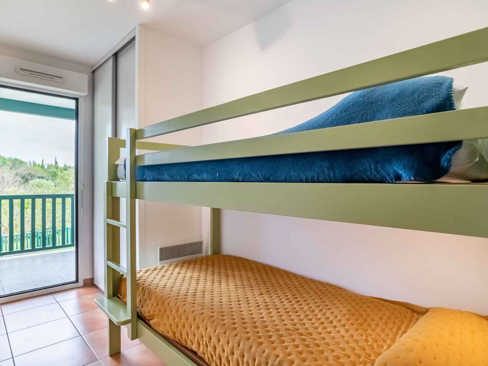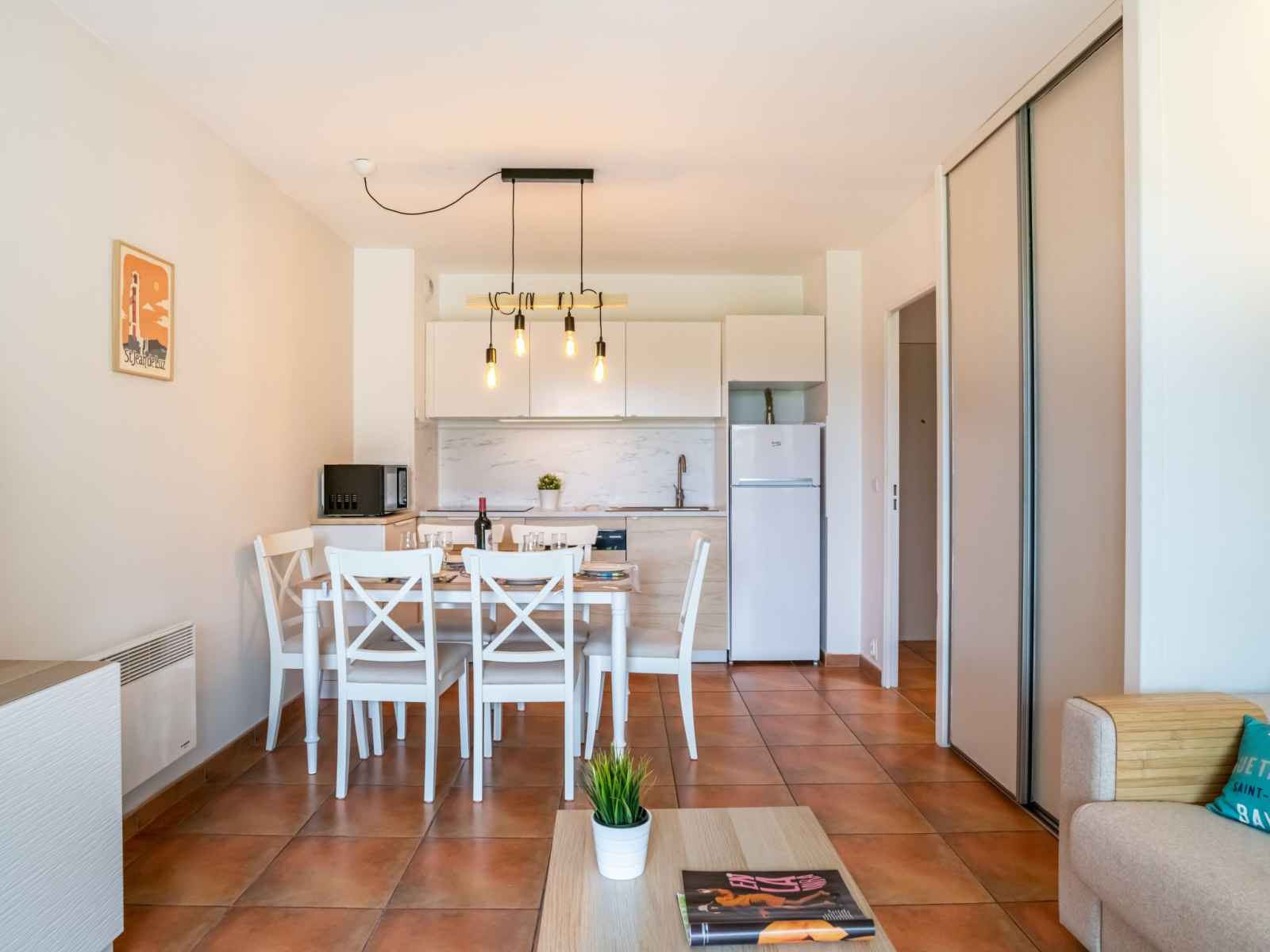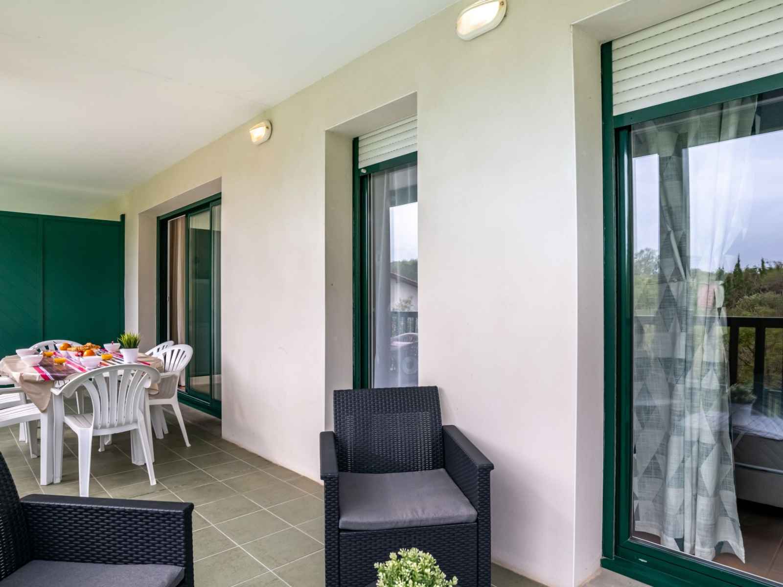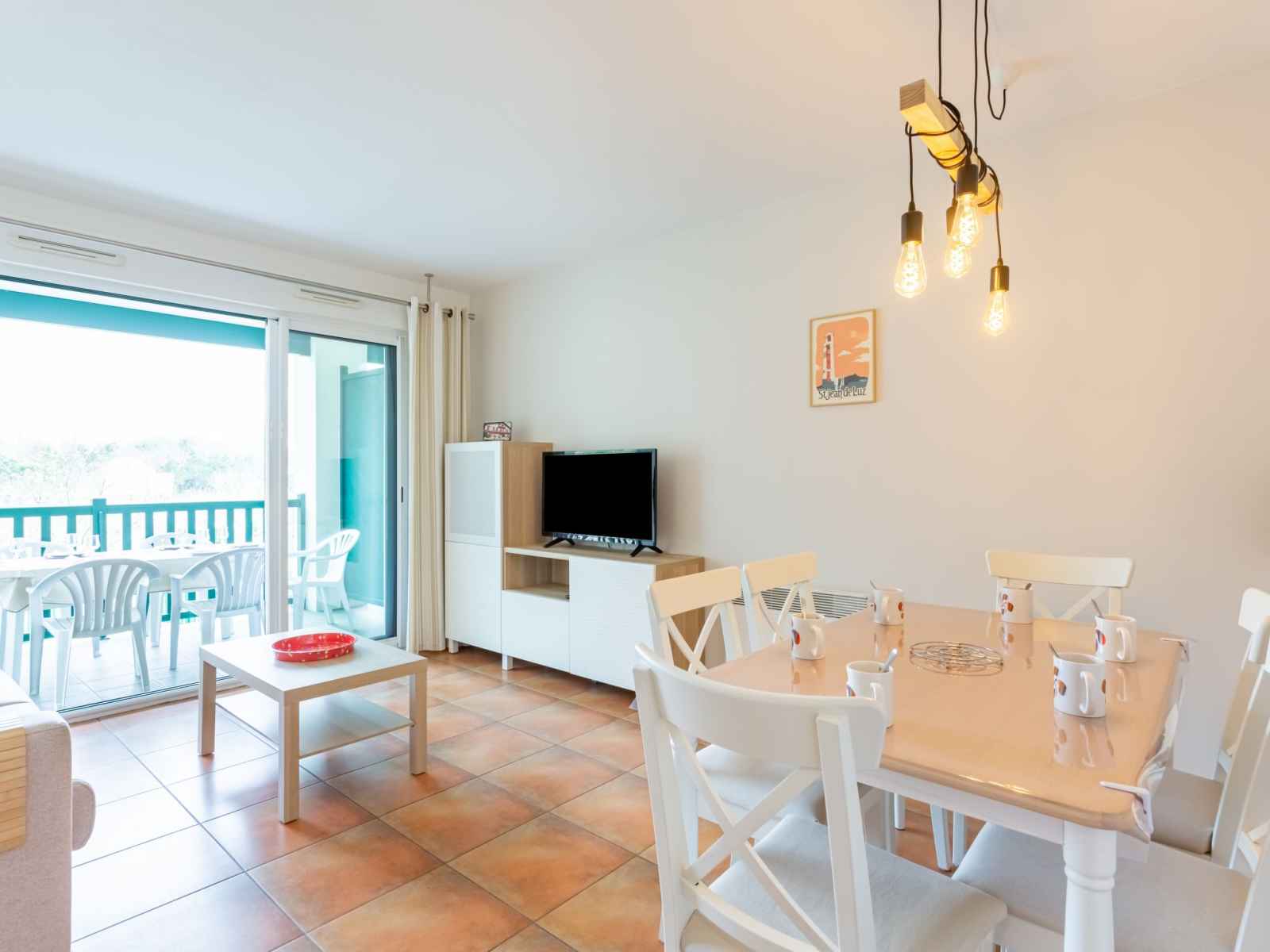 "domaine iratzia", apt 3 pièces 45 m2 au 1er étage. aménagement confortable et agréable: séjour/salle à manger avec 1 divan-lit double (140 cm, longueur 190 cm), tv (écran plat). sortie sur la terrasse. 1 chambre avec 1 grand-lit (1 x 160 cm, longueur 200 cm). sortie sur la terrasse. 1 chambre avec 1 x 2 lits superposés (90 cm, longueur