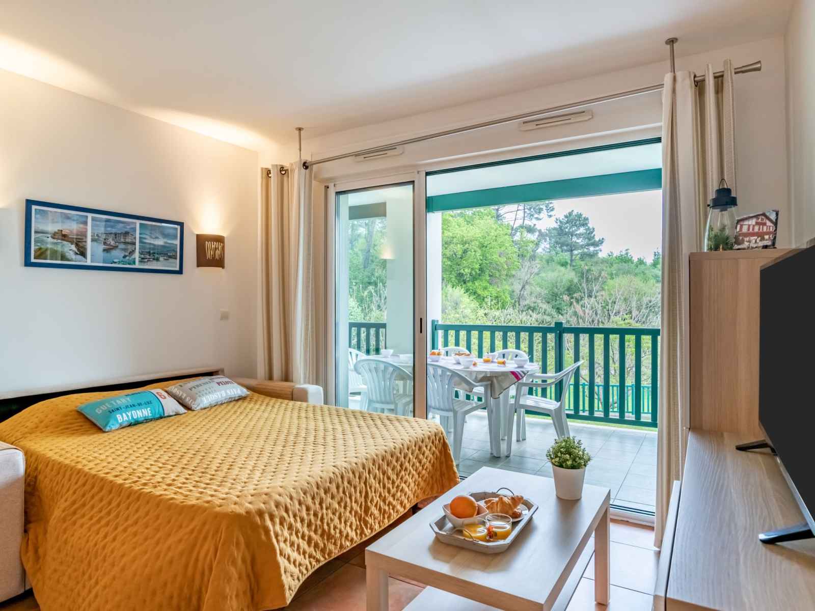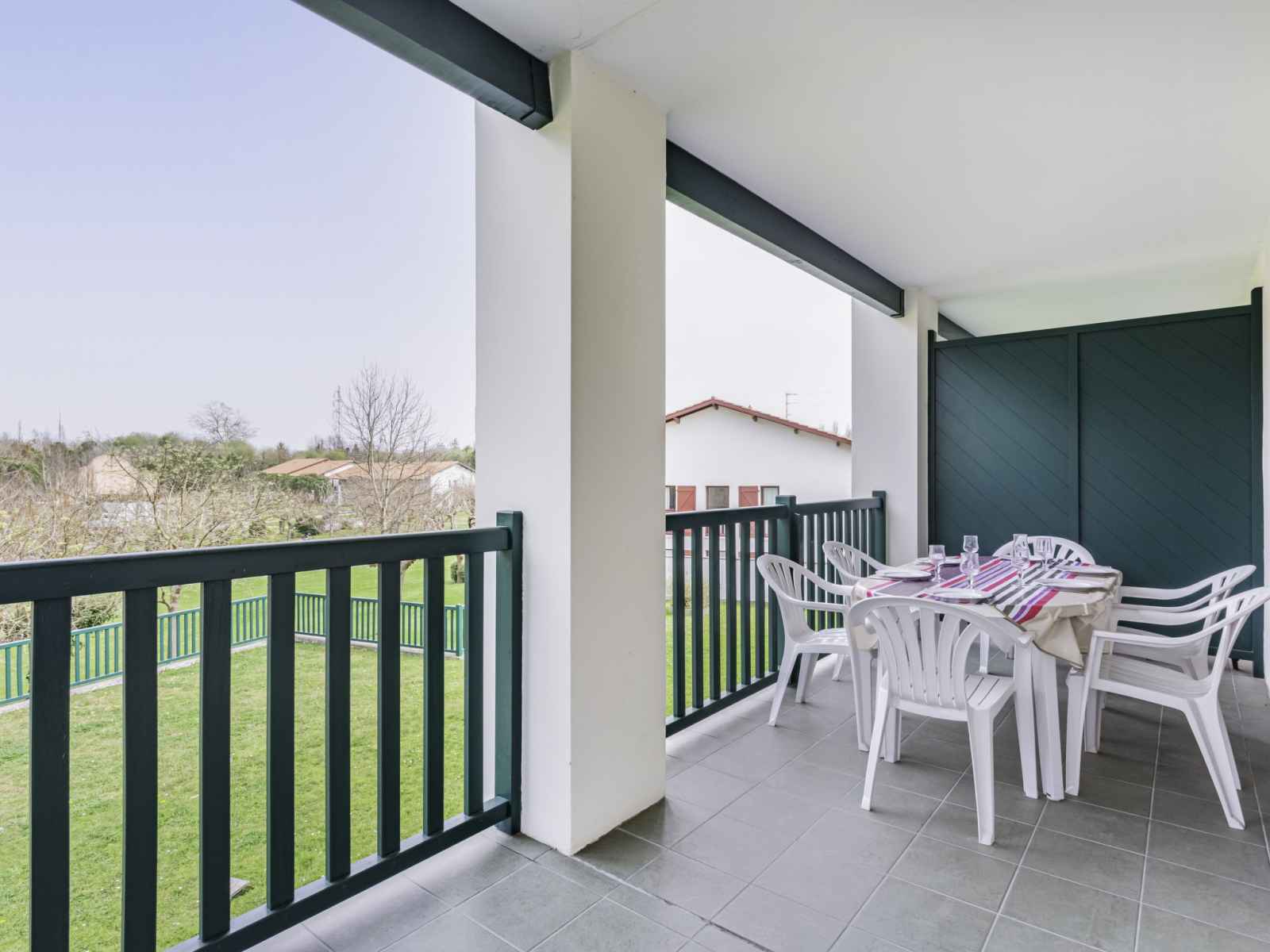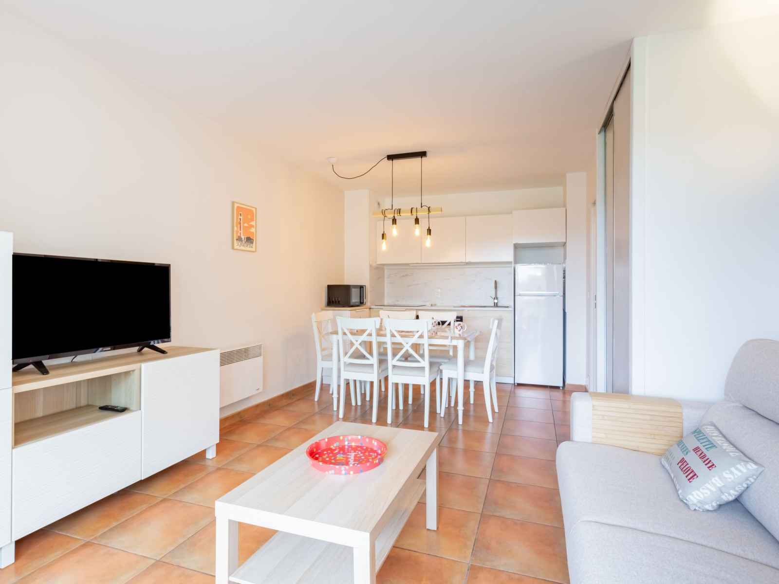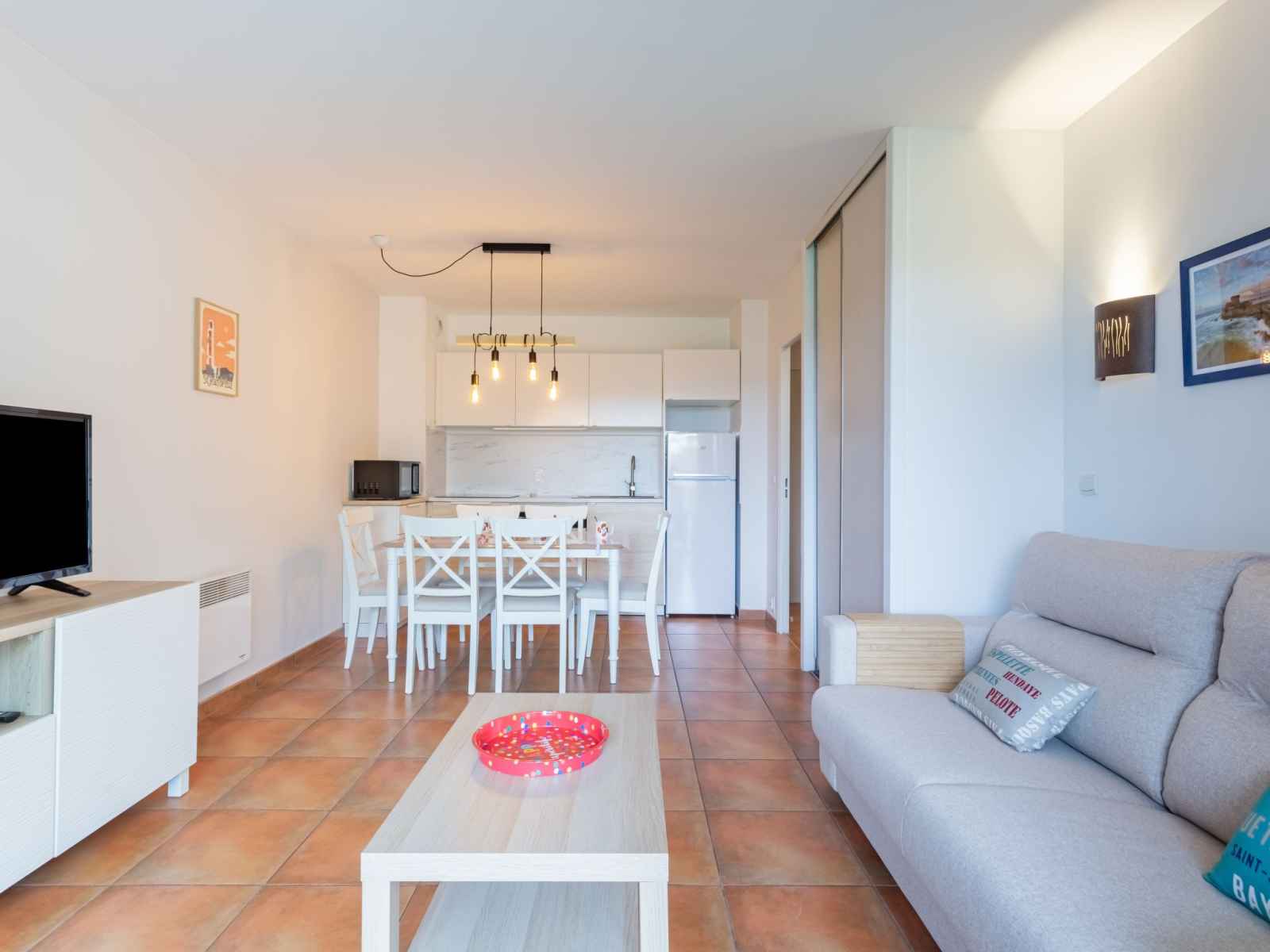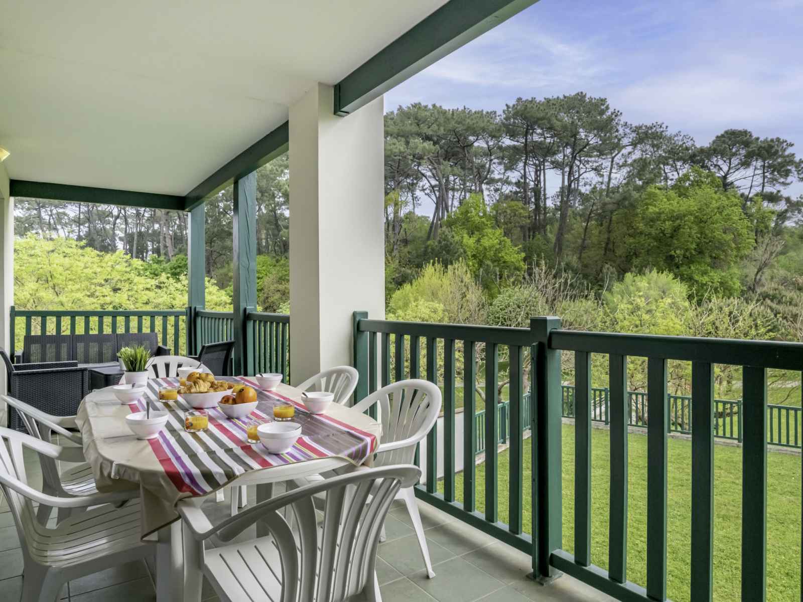 "domaine iratzia", apt 3 pièces 45 m2 au 1er étage. aménagement confortable et agréable: séjour/salle à manger avec 1 divan-lit double (140 cm, longueur 190 cm), tv (écran plat). sortie sur la terrasse. 1 chambre avec 1 grand-lit (1 x 160 cm, longueur 200 cm). sortie sur la terrasse. 1 chambre avec 1 x 2 lits superposés (90 cm, longueur