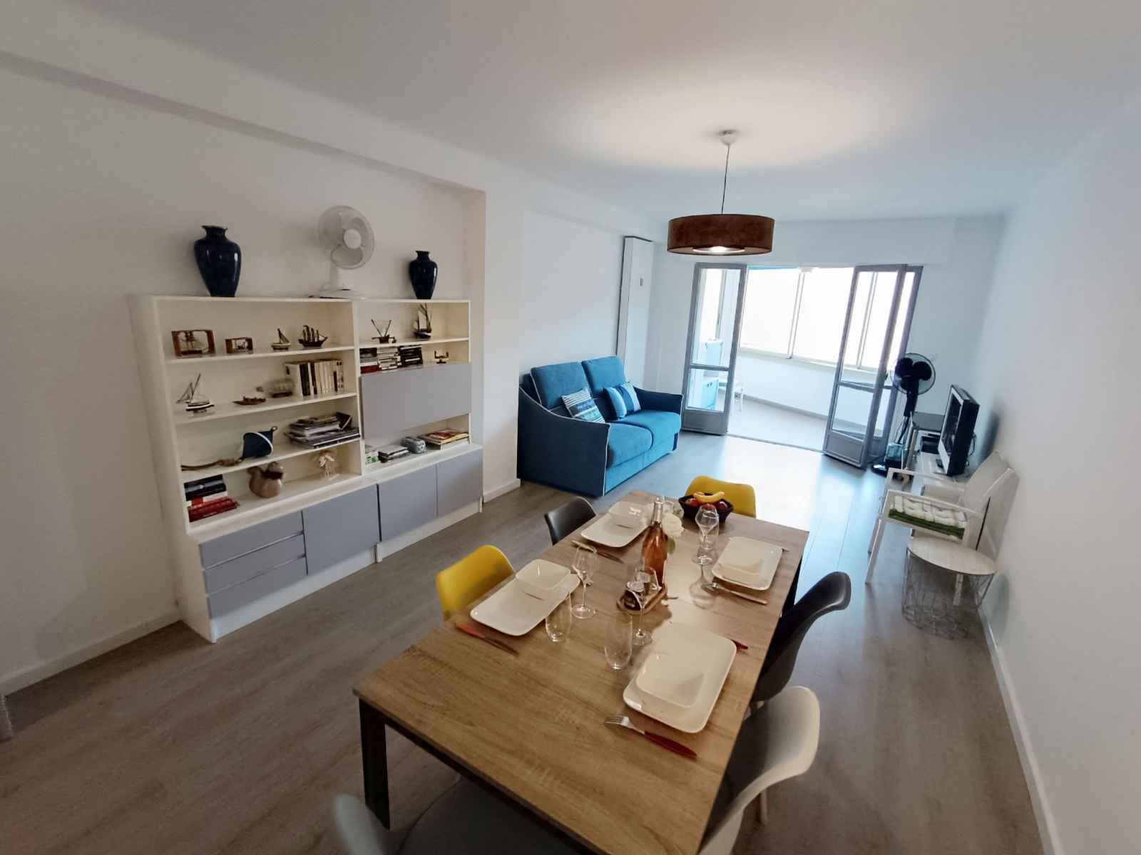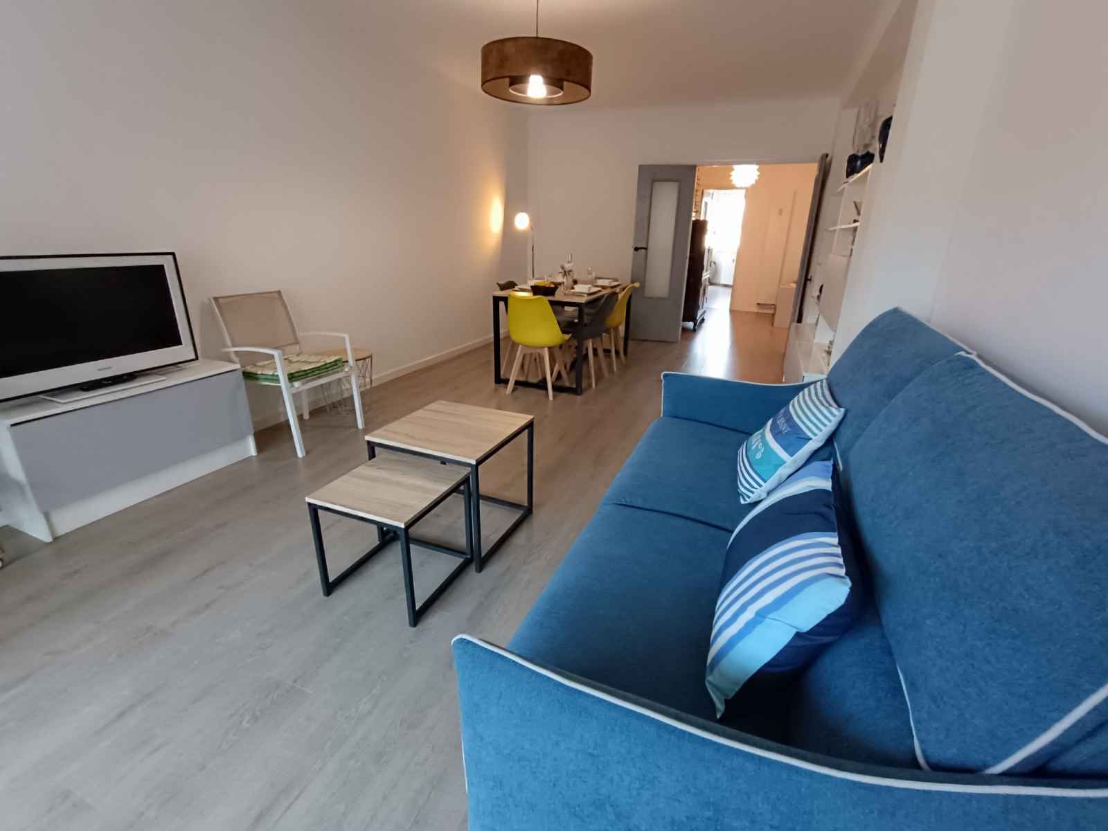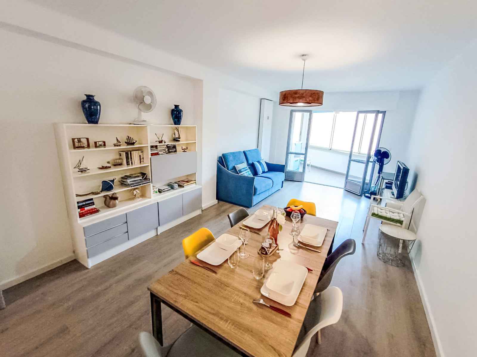 Apt 3 pièces 85 m2 au 4ème étage. rénové en 2023: séjour/salle à manger avec tv et écran plat. sortie sur la loggia. 1 chambre avec 1 grand-lit (1 x 140 cm, longueur 200 cm), tv, écran plat, chauffage électrique et ventilateur. 1 chambre avec 1 lit (160 cm, longueur 200 cm), tv, écran plat, chauffage électrique et ventilateur. grande