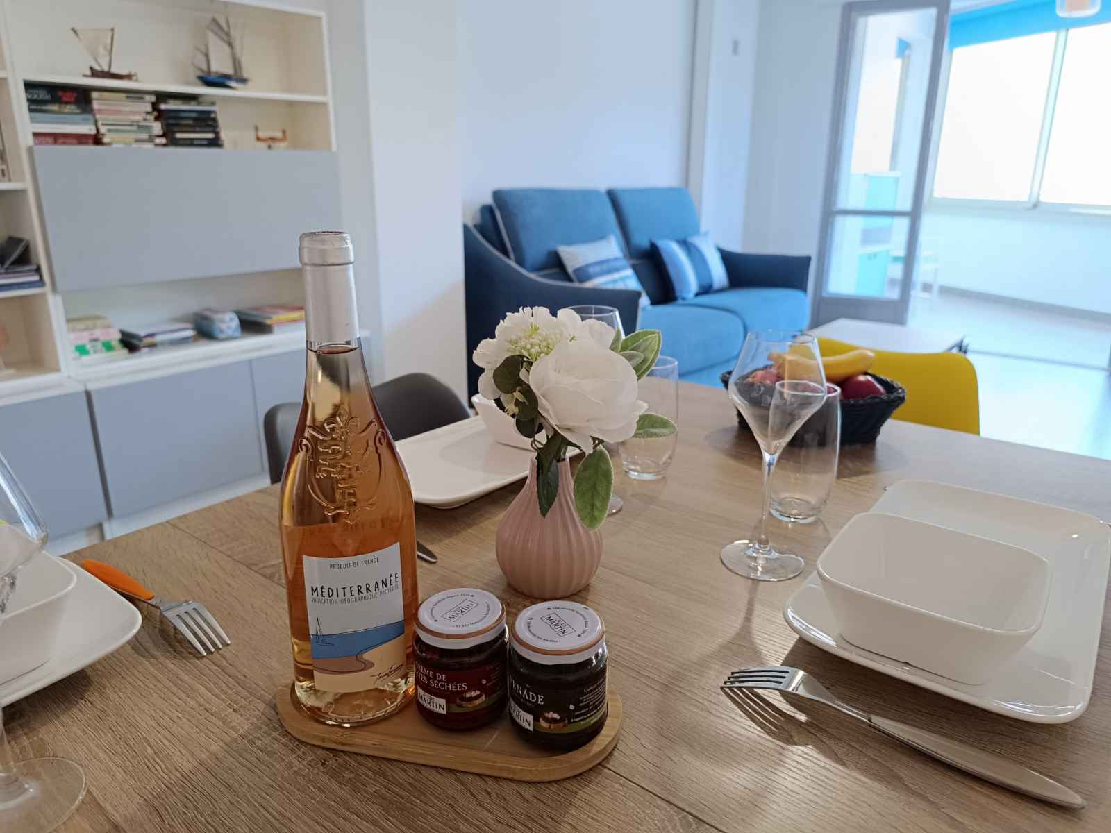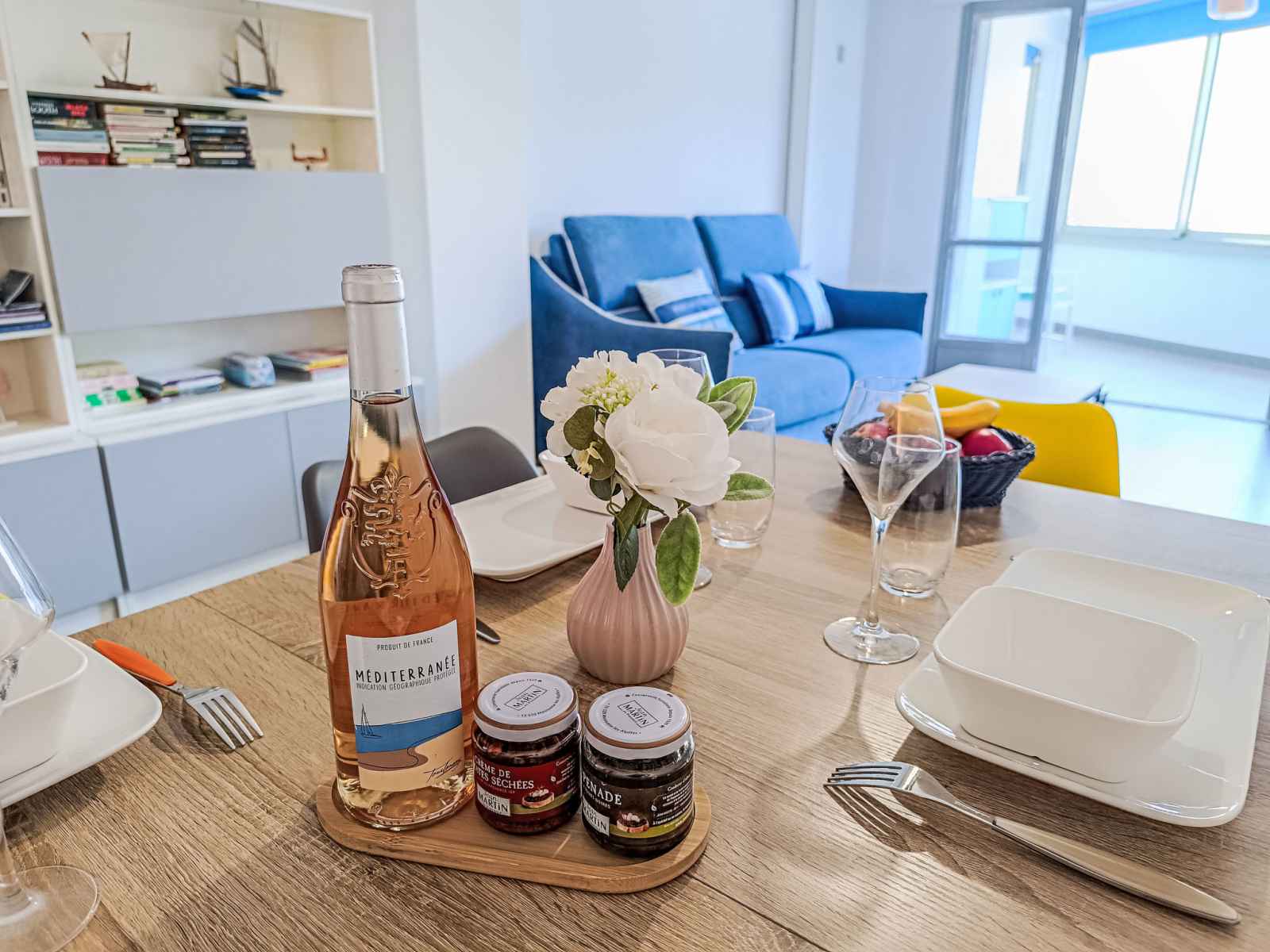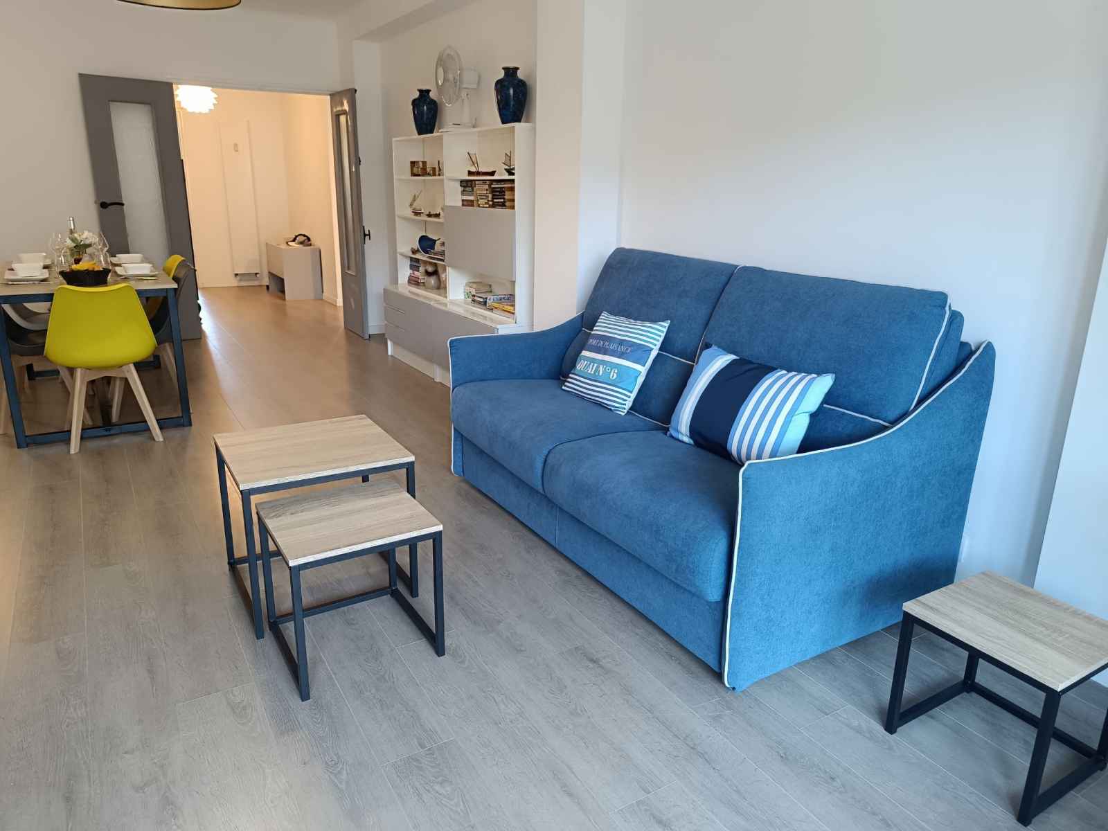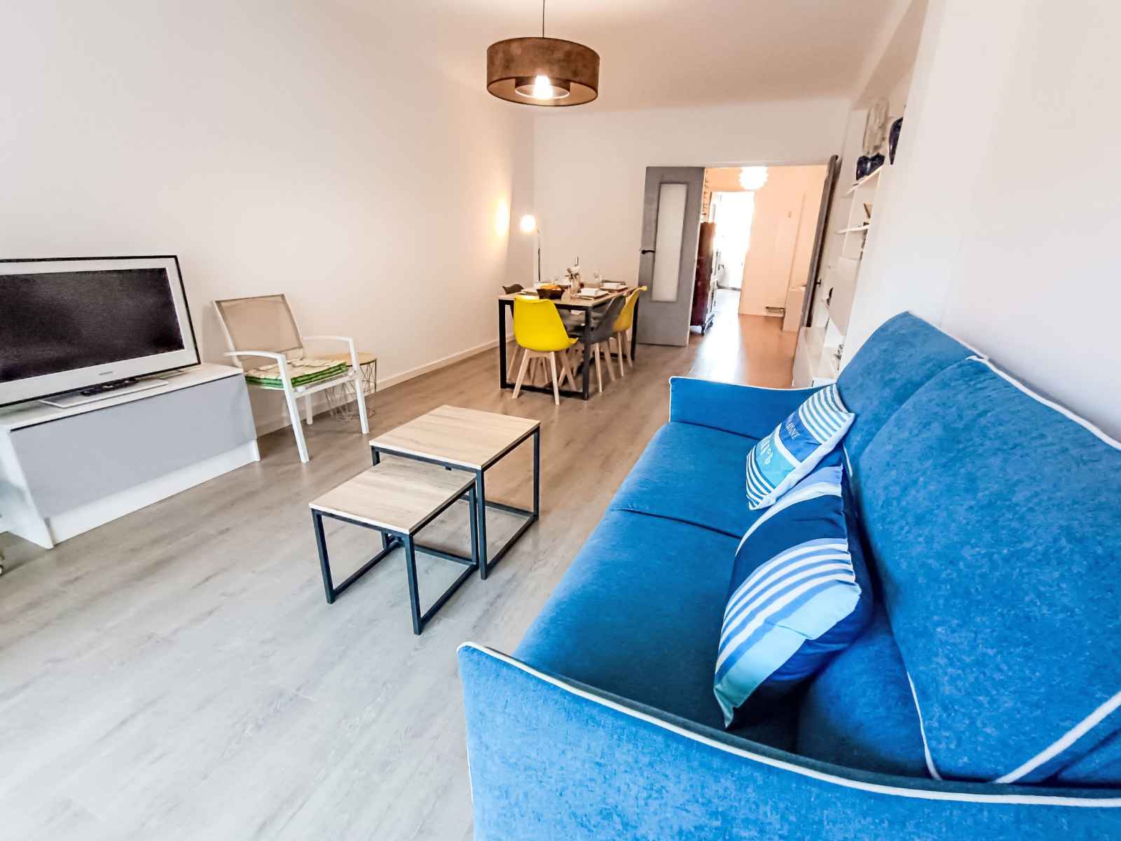 Apt 3 pièces 85 m2 au 4ème étage. rénové en 2023: séjour/salle à manger avec tv et écran plat. sortie sur la loggia. 1 chambre avec 1 grand-lit (1 x 140 cm, longueur 200 cm), tv, écran plat, chauffage électrique et ventilateur. 1 chambre avec 1 lit (160 cm, longueur 200 cm), tv, écran plat, chauffage électrique et ventilateur. grande