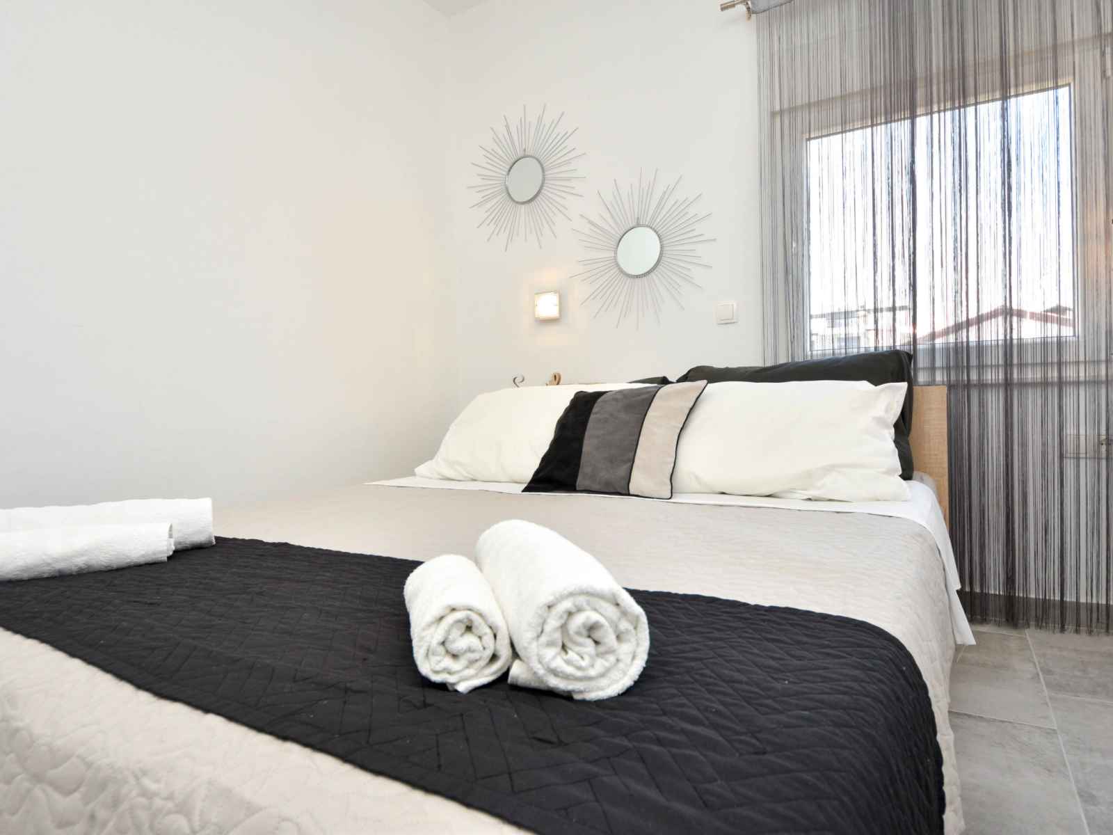 Apt 3 pièces 40 m2 au 1er étage. séjour/salle à manger 16 m2 avec tv (satellite) (écran plat), air-conditionné. sortie sur le balcon. 2 chambres, chaque chambre avec: 1 lit double (2 x 80 cm, longueur 200 cm). cuisine ouverte (2 plaques vitrocéramiques, bouilloire électrique, micro-ondes, congélateur, cafetière électrique). douche/wc.