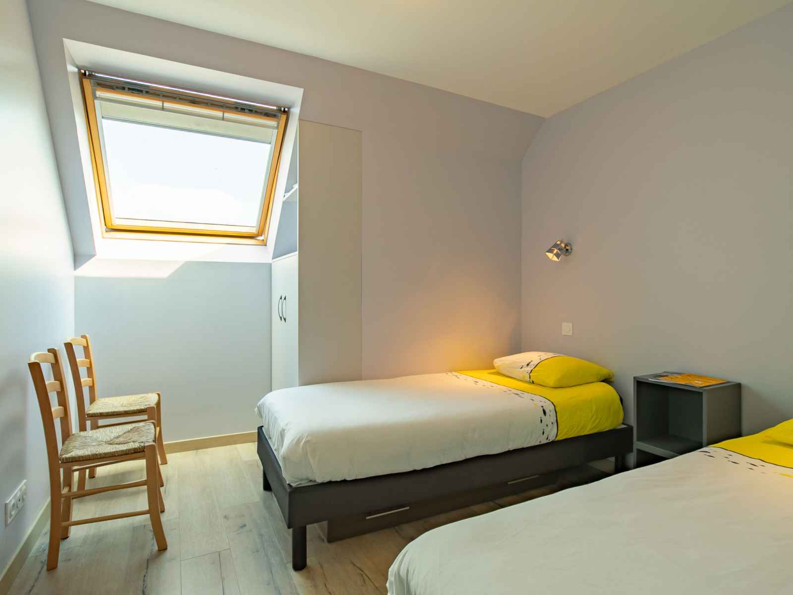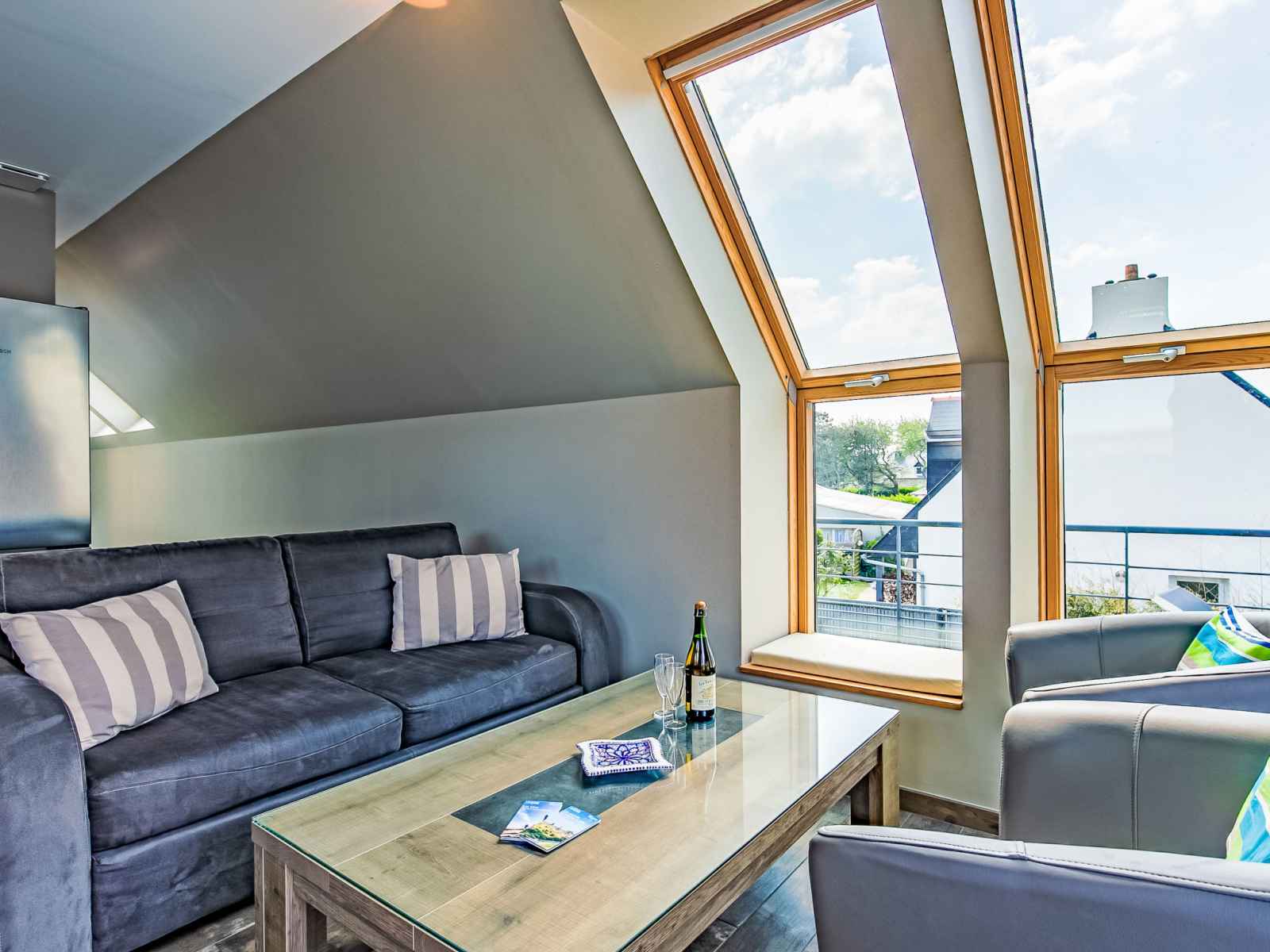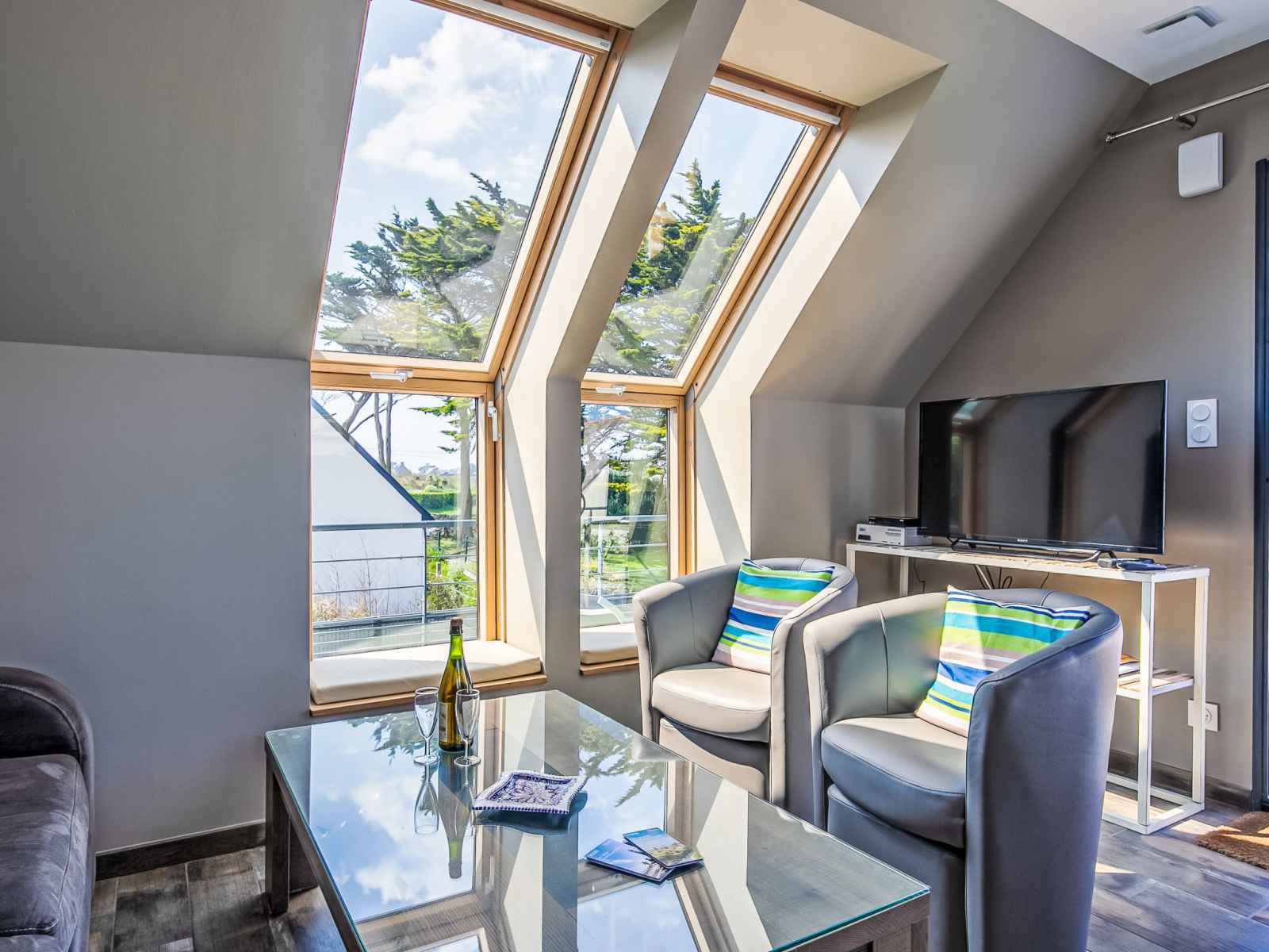 "les chardons bleus 2", apt 4 pièces 90 m2, à l'étage supérieur. aménagement confortable et de bon goût: séjour/salle à manger mansardé avec table pour les repas et tv (satellite) (écran plat). sortie sur le jardin, sur le balcon. 1 chambre mansardée avec 1 grand-lit (160 cm). 1 chambre mansardée avec 2 lits. cuisine ouverte (four,