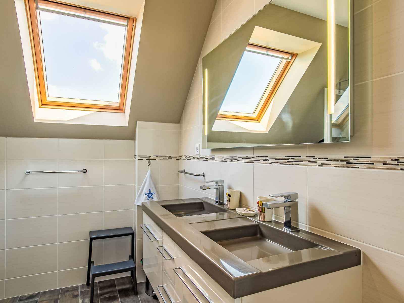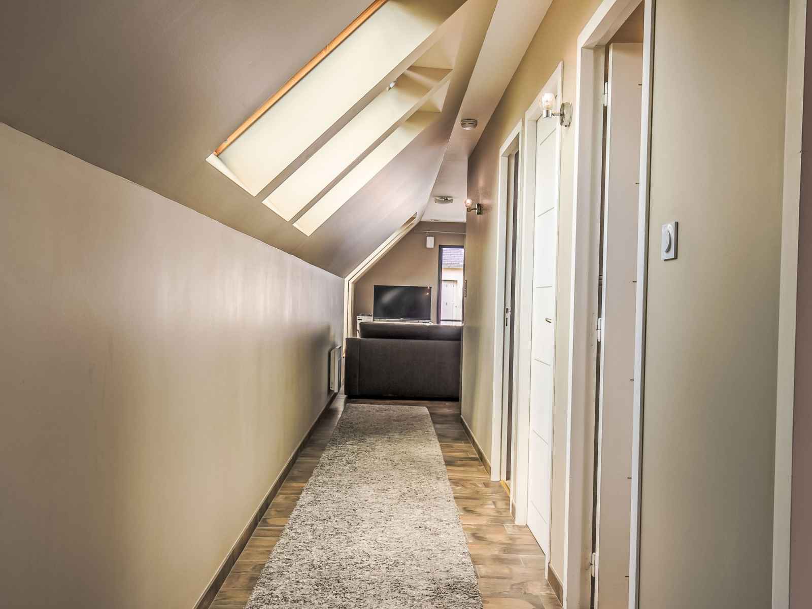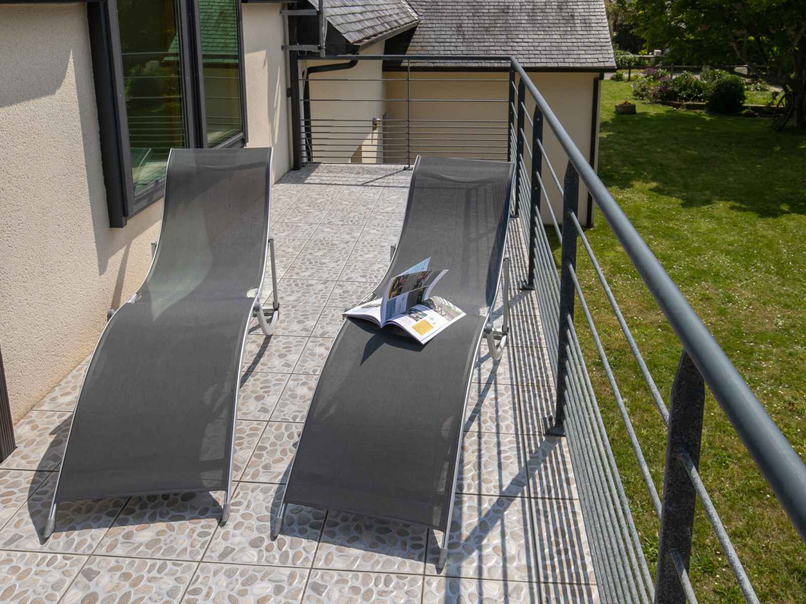 "les chardons bleus 2", apt 4 pièces 90 m2, à l'étage supérieur. aménagement confortable et de bon goût: séjour/salle à manger mansardé avec table pour les repas et tv (satellite) (écran plat). sortie sur le jardin, sur le balcon. 1 chambre mansardée avec 1 grand-lit (160 cm). 1 chambre mansardée avec 2 lits. cuisine ouverte (four,