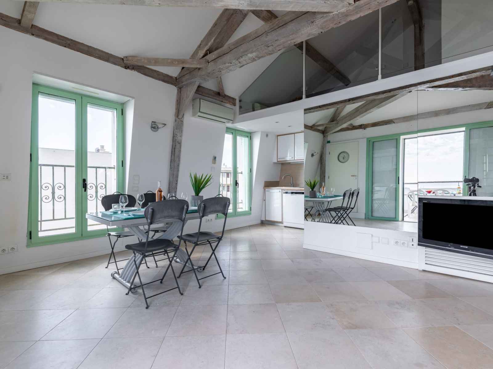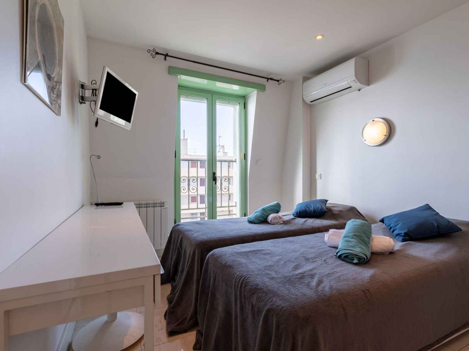 Apt 4 pièces 80 m2 au 3ème étage. aménagement confortable et agréable: séjour/salle à manger avec tv et écran plat. sortie sur la terrasse. 2 chambres, chaque chambre avec: 1 grand-lit (140 cm, longueur 190 cm), tv et écran plat. 1 chambre avec 2 lits (90 cm, longueur 190 cm), tv et écran plat. cuisine ouverte (four, lave-vaisselle, 4
