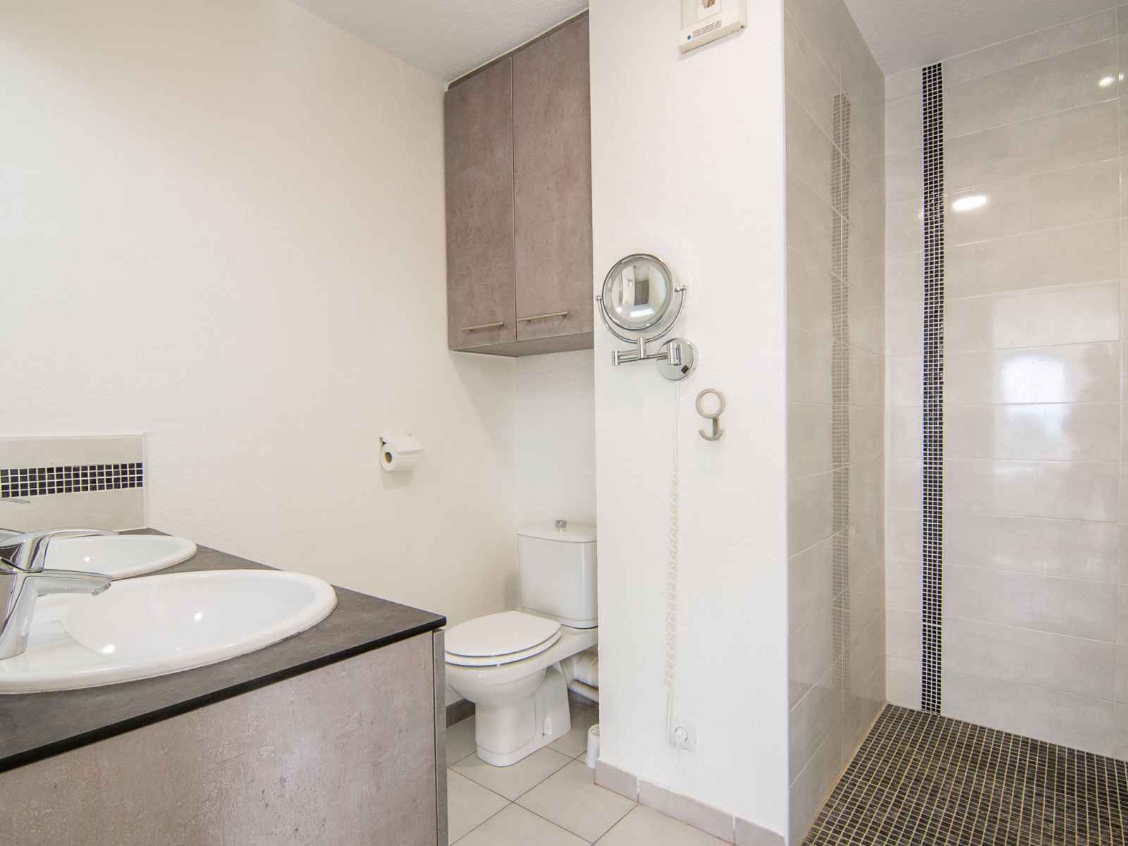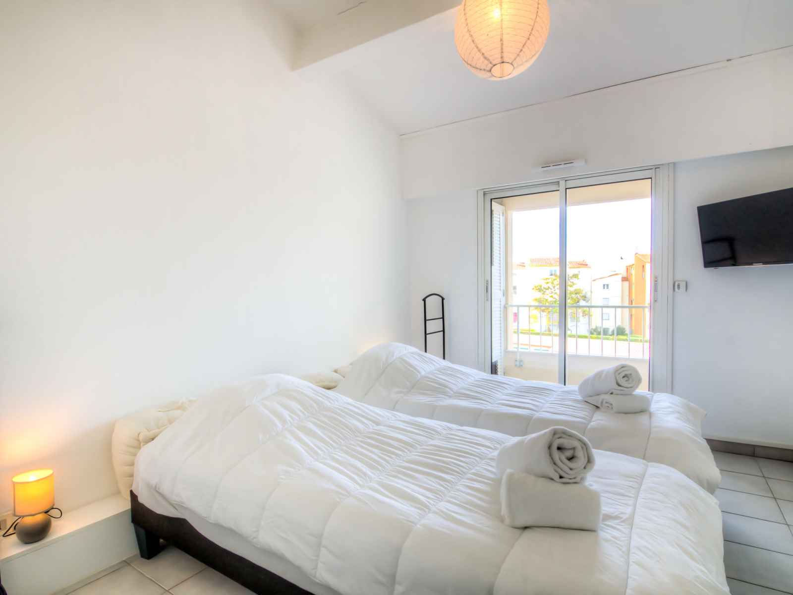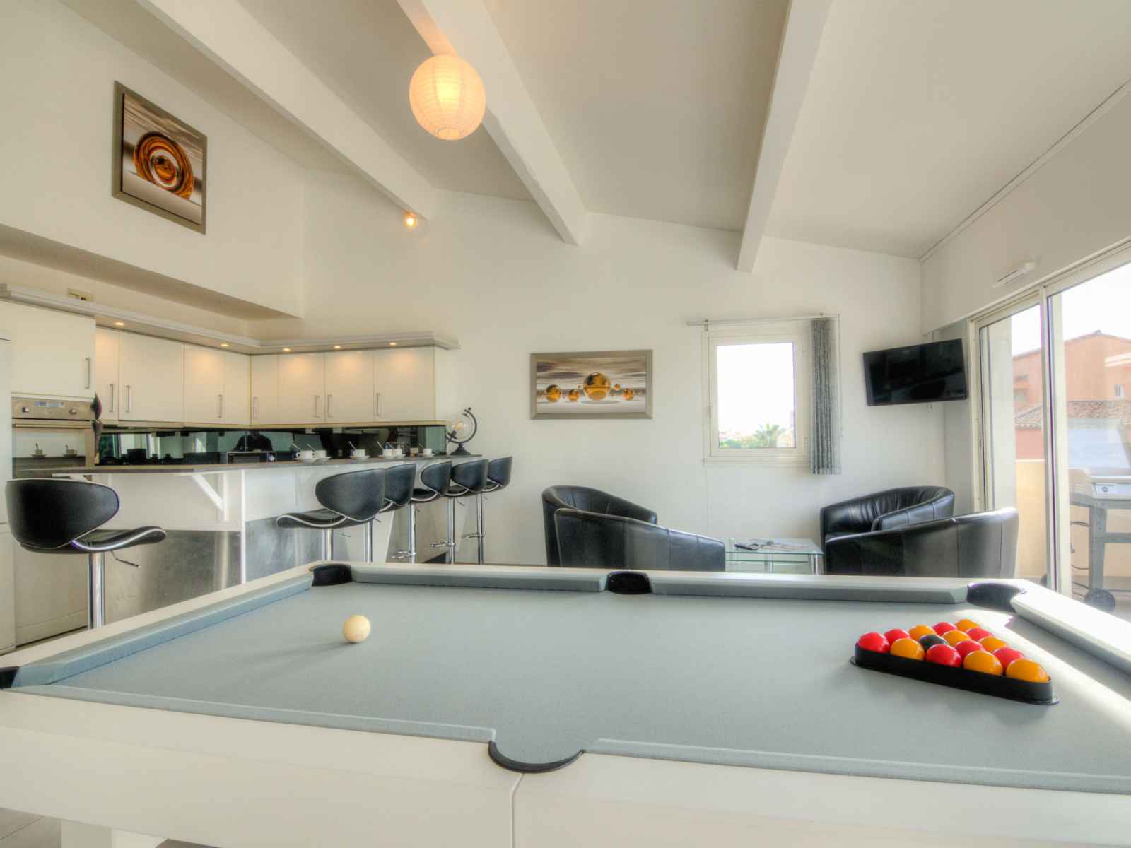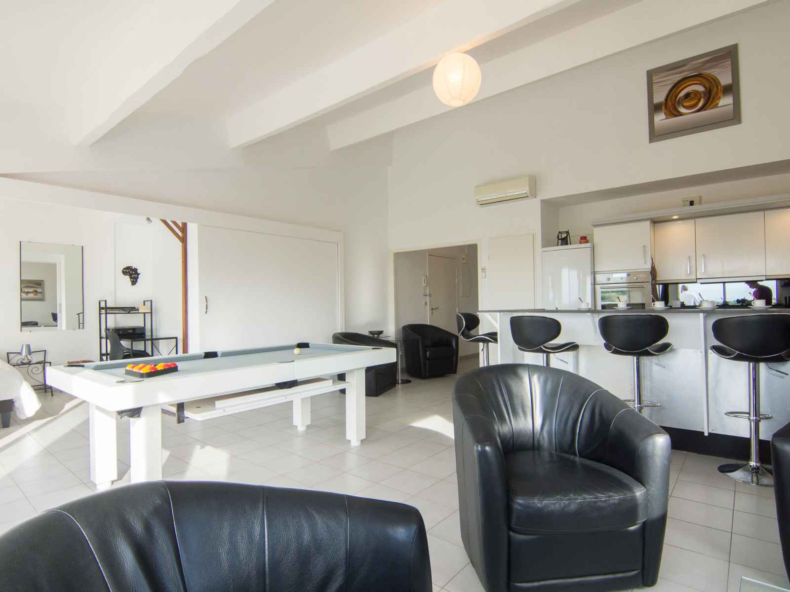 Apt 4 pièces 92 m2 au 3ème étage. partiellement mansardé, complètement rénové en 2016, aménagement très fonctionnel et confortable: grand séjour mansardé avec air-conditionné. sortie sur la terrasse. 1 grande chambre avec 1 grand-lit (180 cm, longueur 200 cm), douche/wc, double vasque et tv (écran plat). 1 chambre avec 2 lits (90 cm,