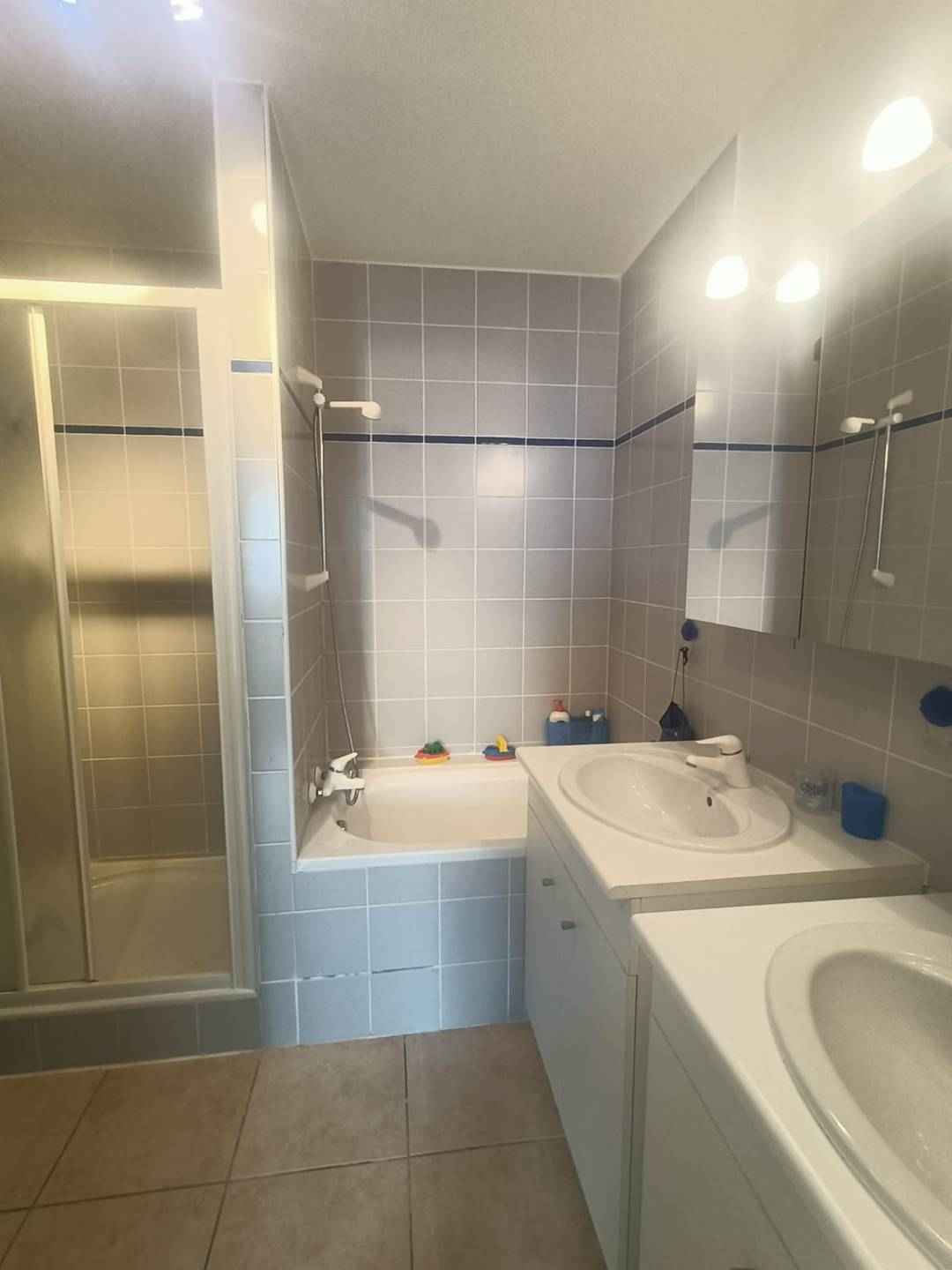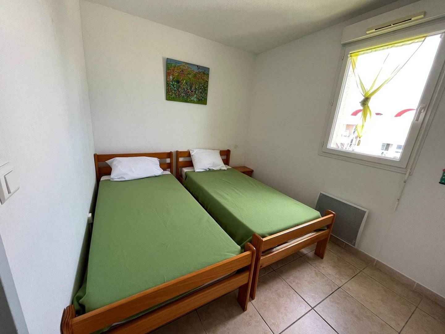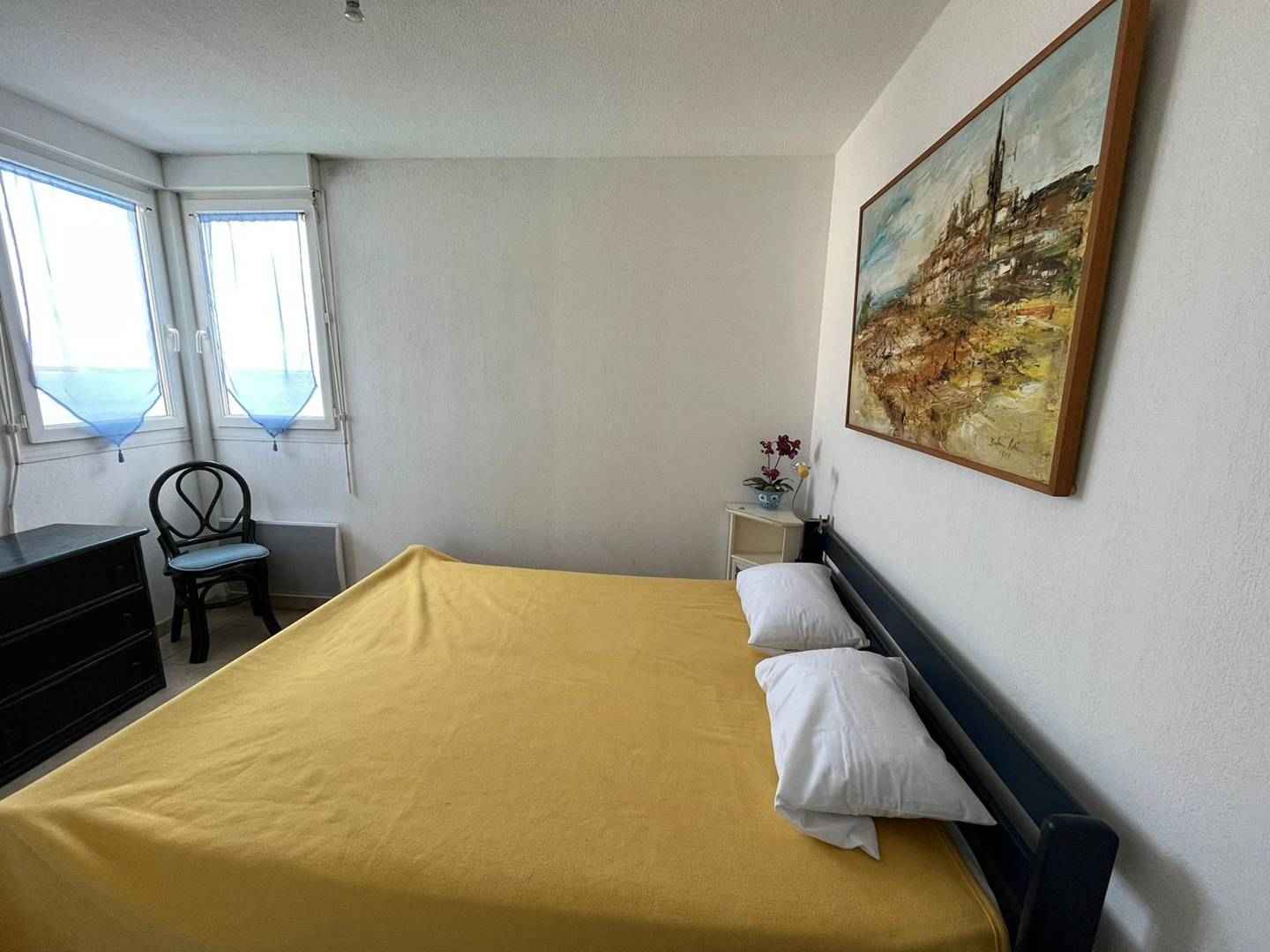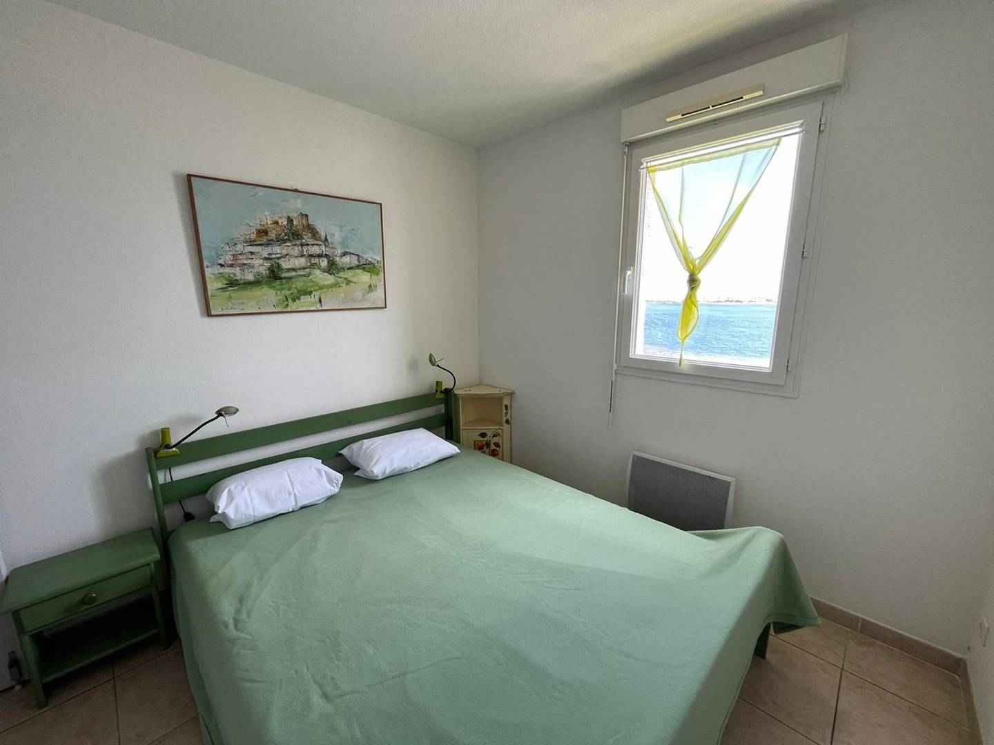 Un couloir qui dessert deux chambres avec lit double en 140 et une chambre avec deux lits simple en 90, une salle de bain avec baignoire et douche ainsi qu’un wc séparé. Toutes les chambres disposent d’une vue mer et de rangements.