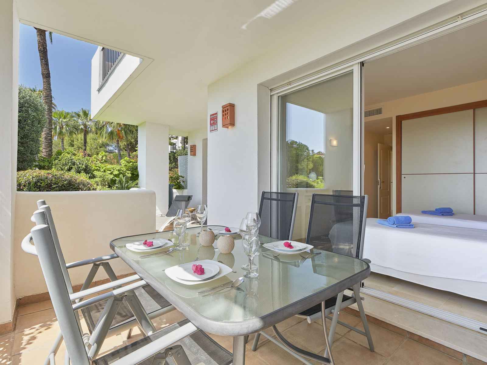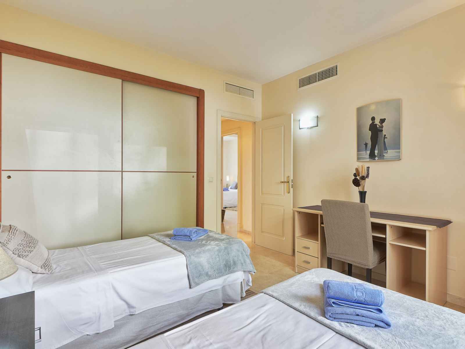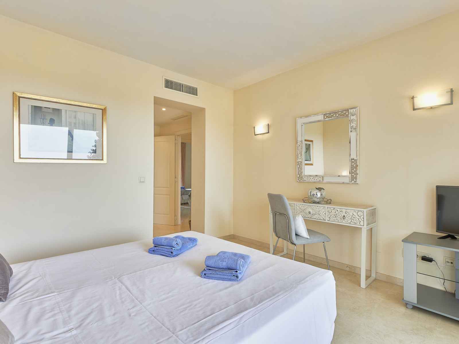 "altos de la quinta", apt 4 pièces 150 m2, situation sud-ouest. aménagement confortable et agréable: séjour/salle à manger avec tv (satellite), dvd, air-conditionné et chauffage à air chaud. sortie sur la terrasse. 1 chambre avec 1 grand-lit (150 cm, longueur 200 cm), bain/bidet/wc et double vasque (privé). 1 chambre avec 2 lits (80 cm,