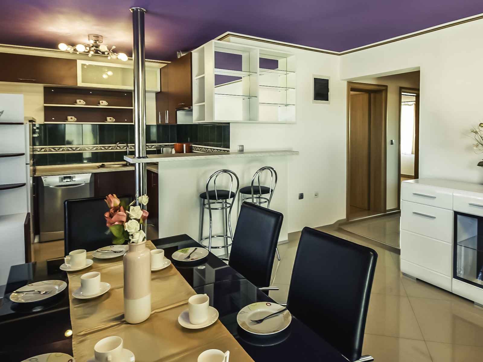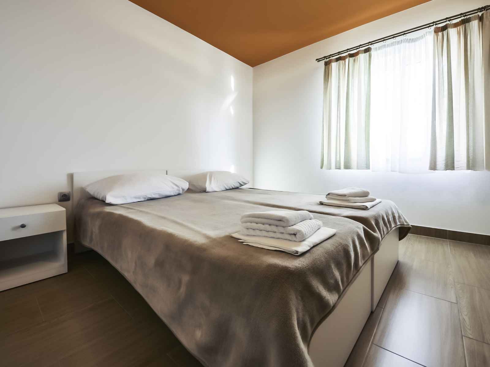 Apt 4 pièces 90 m2, au rez-de-chaussée. séjour/salle à manger avec tv (satellite) (écran plat), air-conditionné. sortie sur la terrasse. 2 chambres, chaque chambre avec: 1 lit double (2 x 80 cm, longueur 200 cm). 1 chambre avec 2 lits (80 cm, longueur 200 cm). cuisine ouverte (4 plaques de cuisson, four, lave-vaisselle, congélateur).