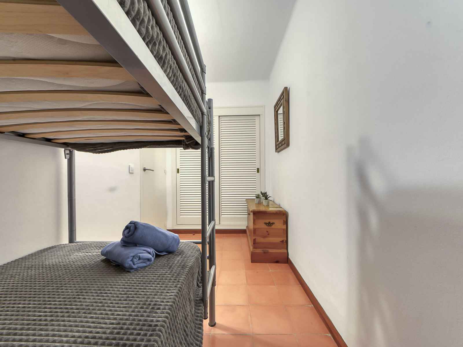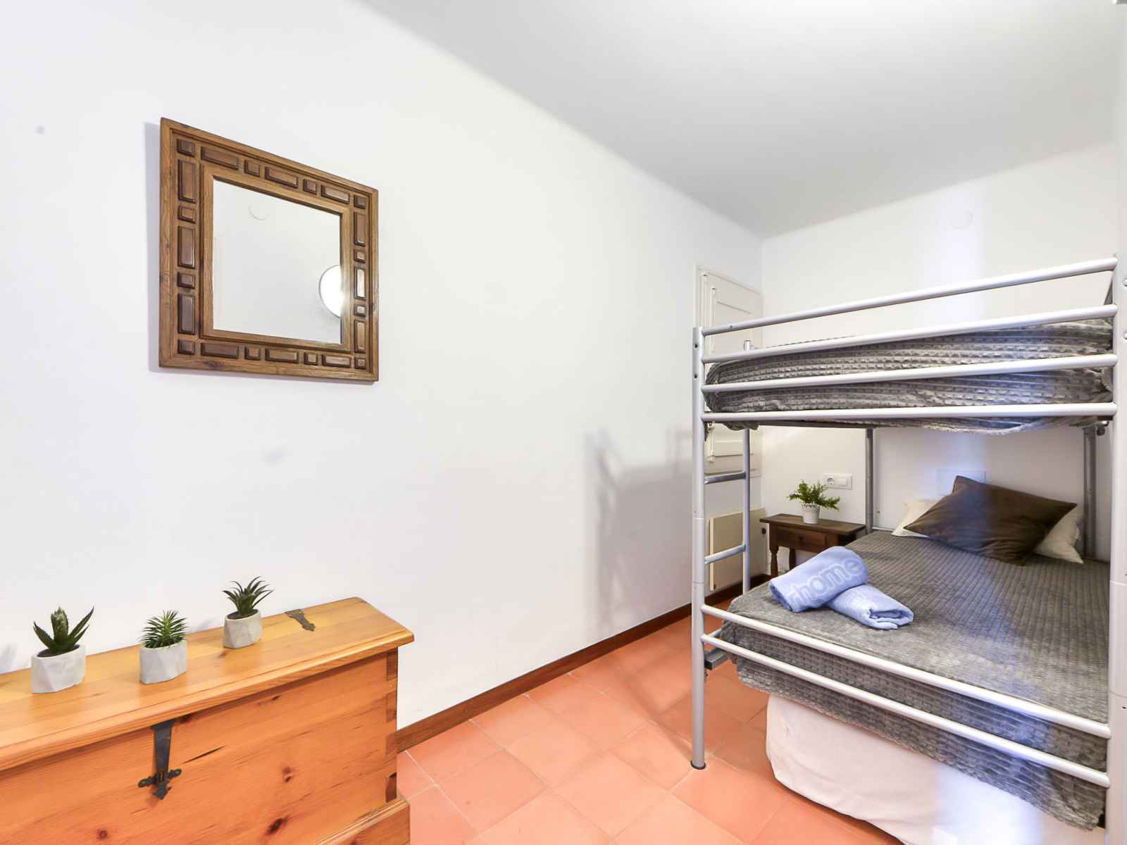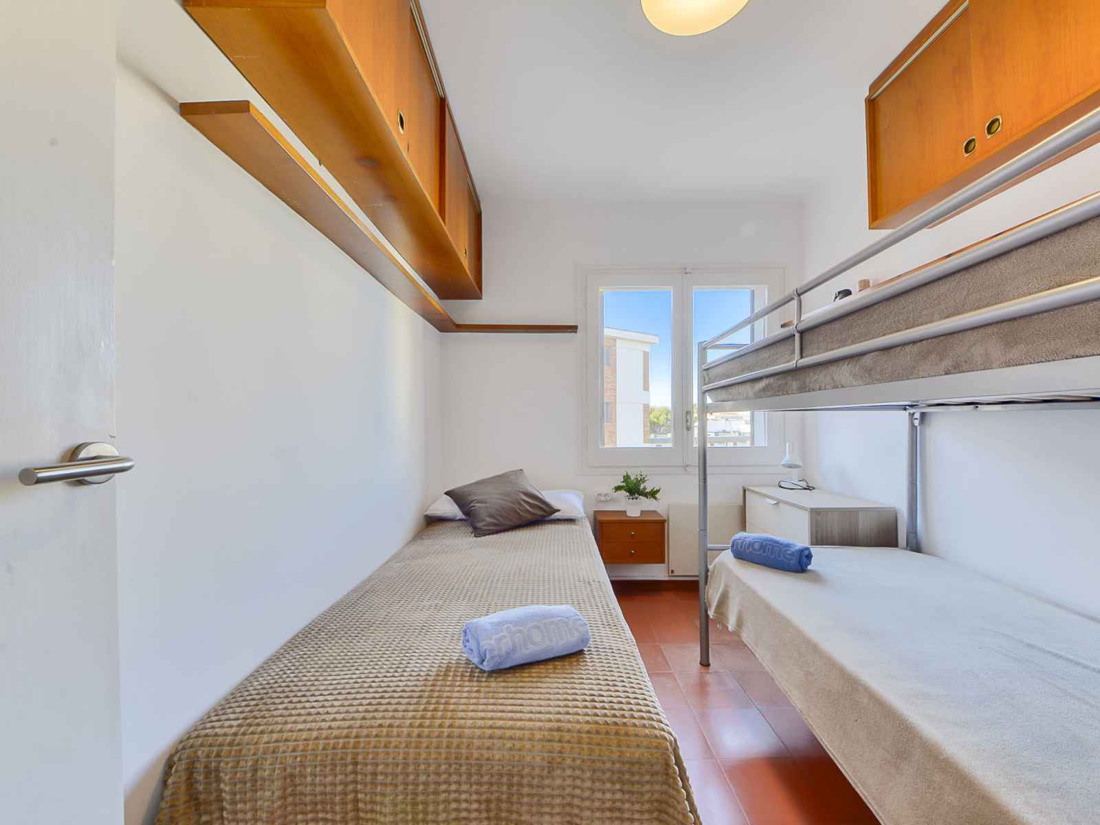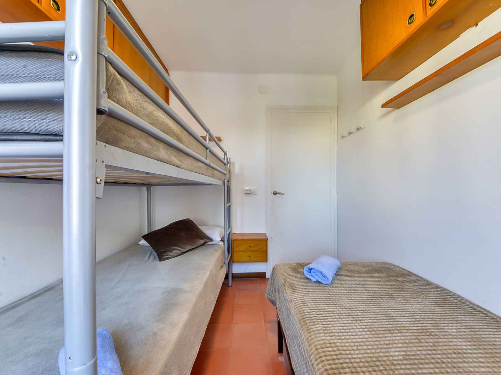 Apt 4 pièces 60 m2 au 3ème étage. aménagement fonctionnel: séjour/salle à manger avec table pour les repas et tv. sortie sur la terrasse. 1 chambre avec 1 grand-lit (160 cm, longueur 200 cm). 1 chambre avec 1 x 1 lits superposés (90 cm, longueur 190 cm). 1 petite chambre avec 1 lit (90 cm, longueur 190 cm), 1 x 1 lits superposés (90 cm,